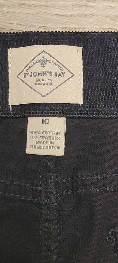 Leg Style: Straight Size Type: Regular Brand: St. John's Bay Fabric Type: Corduroy Front Type: Flat Front Country/Region of Manufacture: Bangladesh Material: Cotton, Spandex Type: Pants Size: 10 Features: Pockets, Stretch Season: Fall, Spring, Summer, Winter Pattern: Solid Department: Women Style: Chino Theme: City, American, Classic, Modern Garment Care: Machine Washable Color: Black Occasion: Business, Casual, Travel, Workwear Fit: Classic