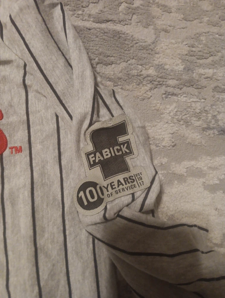 Show off your love for the St. Louis Cardinals with this officially licensed Fabick pinstripe jersey. Perfect for any Major League Baseball fan, this gray jersey features the team's iconic logo and is made with high-quality materials for a comfortable fit. The size is a men's Large and the jersey is perfect for regular season games. This throwback game giveaway is a must-have for any fan of the St. Louis Cardinals. The jersey is made in Pakistan and is perfect for those who want to show off their team spirit. Get your hands on this jersey today and add it to your collection of sports memorabilia!