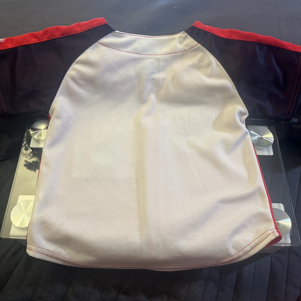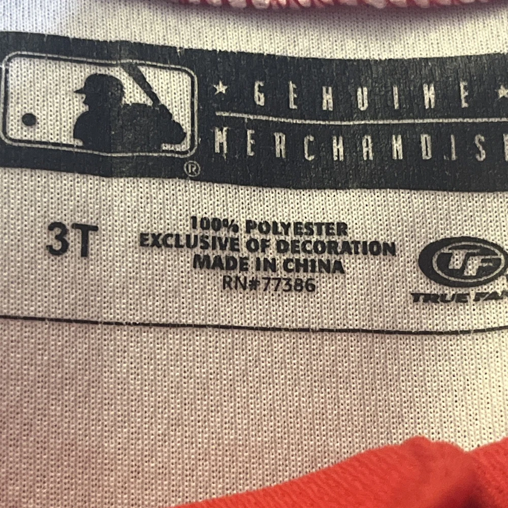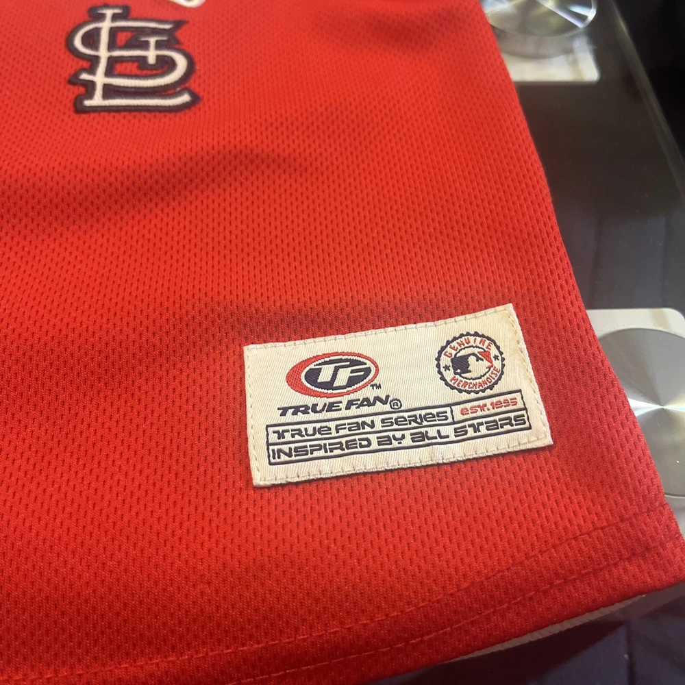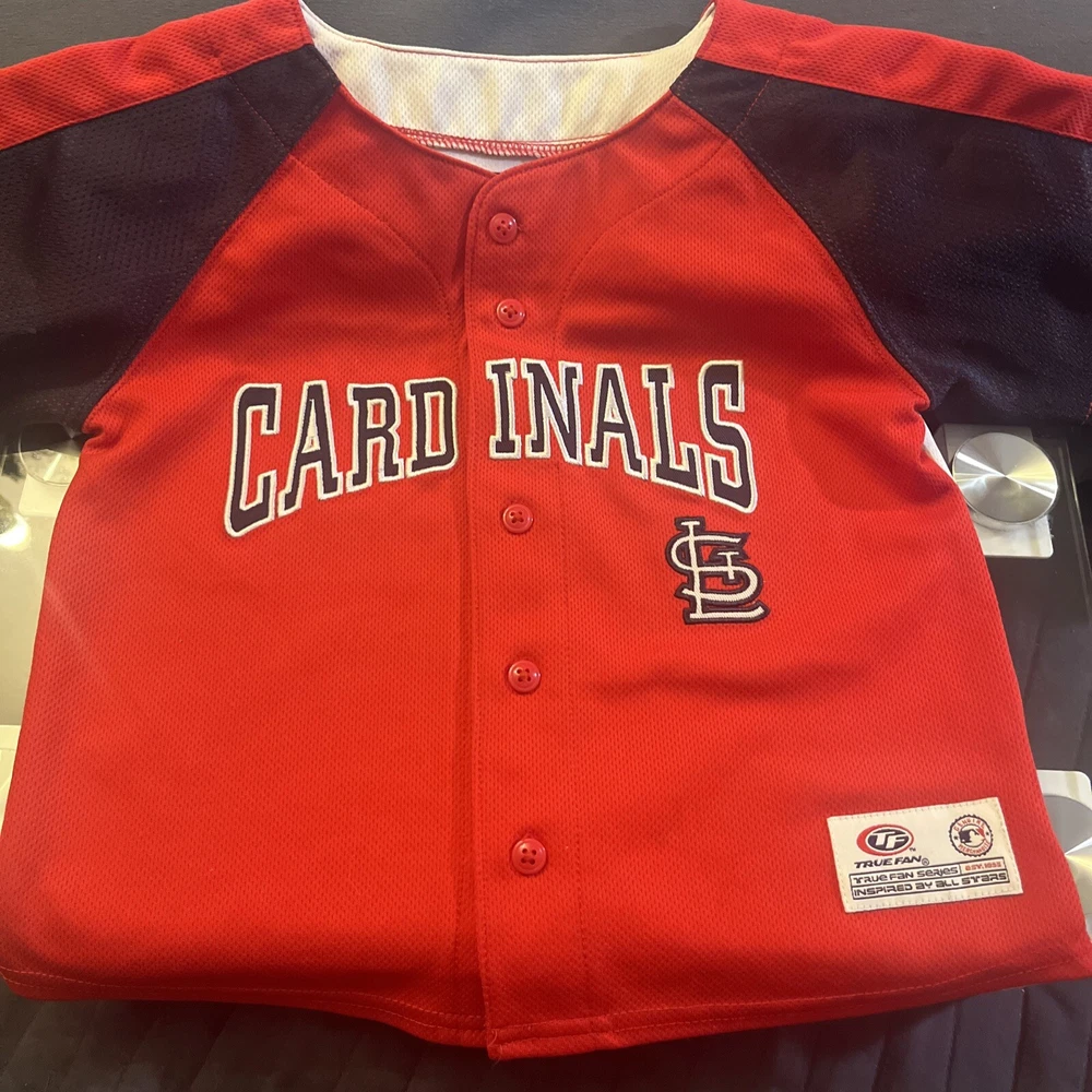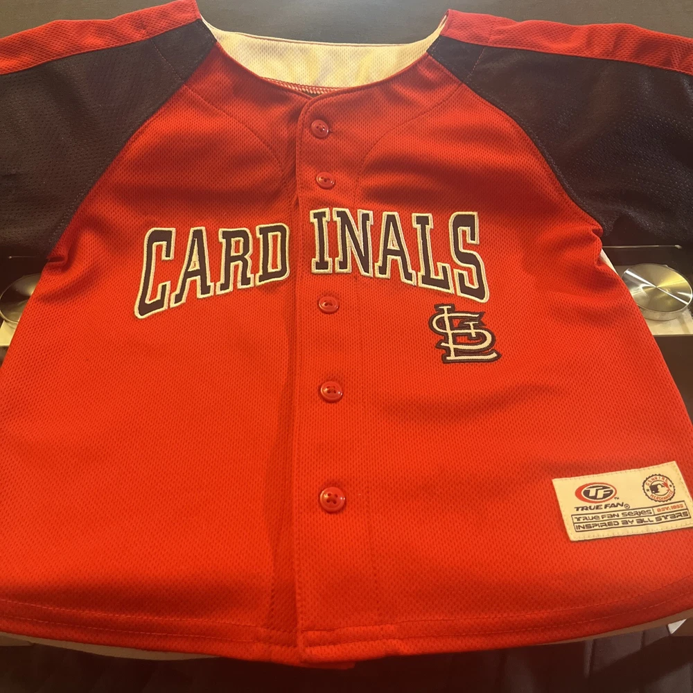 I have more Cardinal Merch, look in sellers other items. Discounts on multiple item purchases. 😉 Get your little one ready for game day with this officially licensed St. Louis Cardinals True Fan jersey. Made with high-quality stitching, this jersey is perfect for any young fan looking to show their team spirit. The bright red color and authentic team logo make it a must-have item for any baseball fan. This unisex children's jersey is designed to fit a size 4T and is made from genuine merchandise. It's perfect for regular season games and will help your child look and feel like a true fan. Don't miss out on this opportunity to show your support for the St. Louis Cardinals!