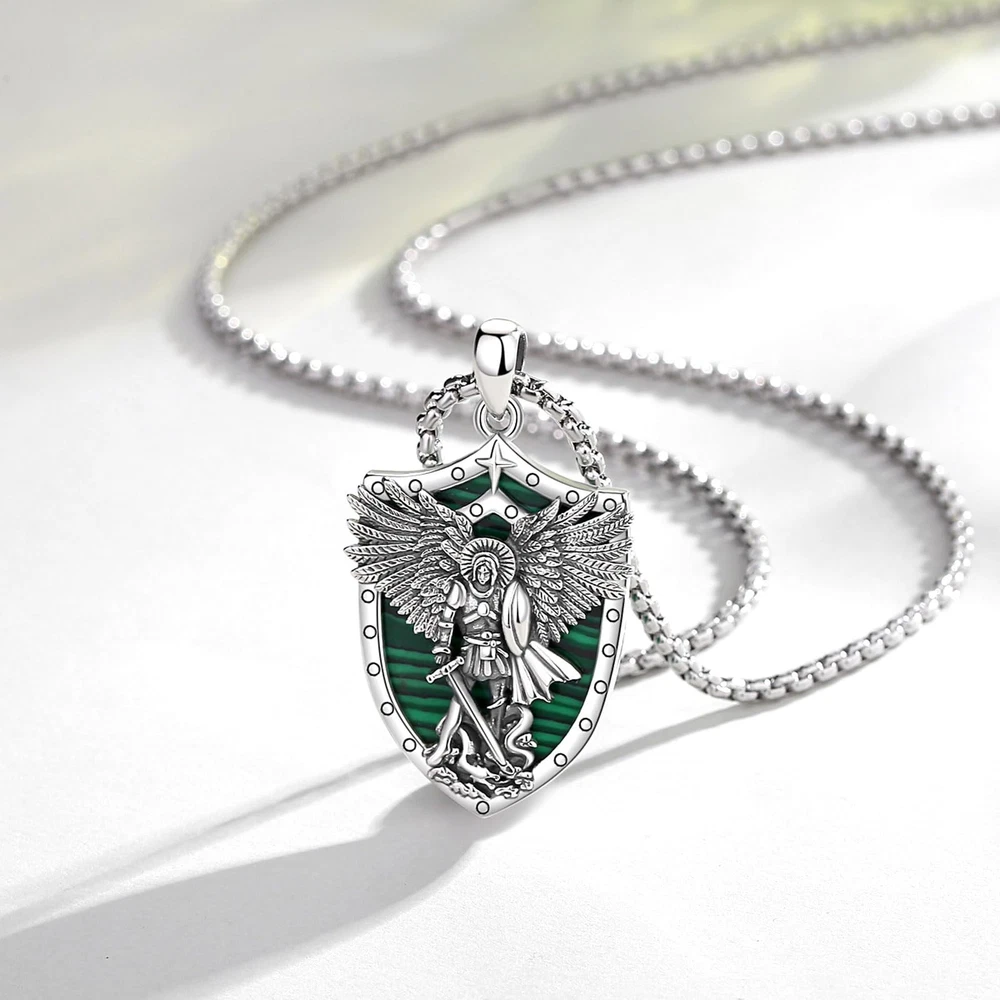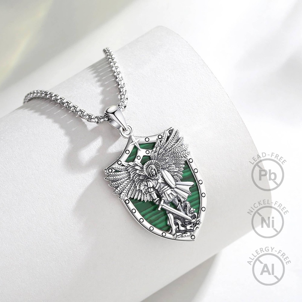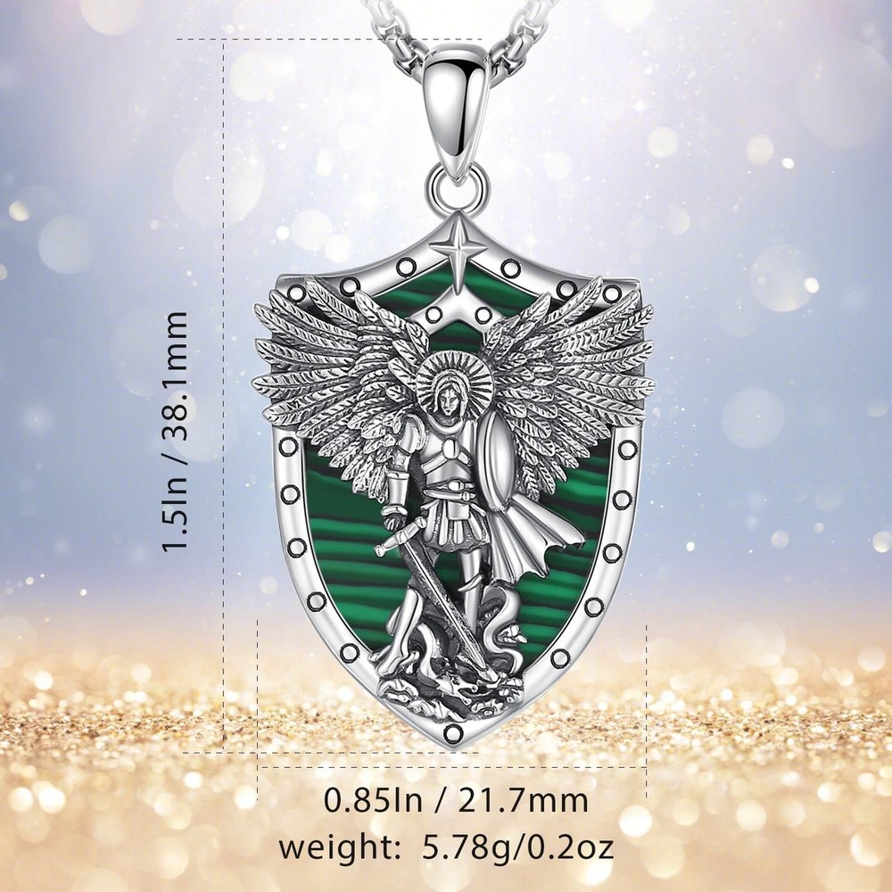 YOU WILL RECEIVE 1 X sterling silver pendant 1 X 24 inches chain 1 X silver cleaning cloth 1 X jewelry gift box --------- GET TO KNOW US BETTER --------- WHY CHOOSE JEWELRY COLLECTION? Our company is a collection of jewelry design, manufacturing, retail, wholesale business as one of the large modern enterprises. brand is committed to providing consumers with high-quality and fashionable jewelry and has been working hard for this. Our products are made of environmentally friendly and safe materials, which are colour-resistant, nickel, lead, cadmium free and contain no allergenic elements, suitable for long-term wear. WHAT CERTIFICATIONS DO WE HAVE? In addition to the Patents and Copyrights related to jewelry design, the ISO Certification is the assurance that we have robust, clearly defined procedures in place in all our business areas such as R&D, production, supply chain management, risk-management, handling of documents and data and strong business continuity processes. Wish our jewelries will be a gorgeous and elegant collection to you and your beloved him or her! Archangels Michael: St. Michael is often depicted as a warrior angel, clad in armor, symbolizing his role as a defender and protector against evil forces. He is considered the patron saint of warriors, police officers, and those in need of protection. Saint Michael holds a significant place in various religious traditions, representing strength, courage, and divine protection against evil. 925 STERLING SILVER: The archangel michael pendant is made of 925 sterling silver, nickel free and lead free, finest polish finished with excellent shining. The pendant size is 0.85"*1.5", weight:5.78 g. Chain Length: 22" with 2" extender. Material: Malachite is a green-colored mineral that is highly populared for its distinctive and vibrant appearance. Malachite is believed to possess properties that promote spiritual growth, transformation, and positive energy. It is considered a stone of healing, protection, and balance. Malachite is also often used to promote emotional well-being, amplify positive energies, and aid in spiritual development. IDEAL GIFT CHOICE: The packaging includes a soft polishing cloth, to ensure the sterling silver jewelry long-lasting shine. An Ideal gift for friends, loved one,family or maybe just as a treat to yourself! Ideal jewelry accessories for Birthday, Christmas, Valentine's Day, Wedding, Engagement, Anniversaries, Graduation. HOW TO MAINTAIN: Silver is so precious that have to be cleaned and maintained often to keep bright and shiny. Please wipe with silver polishing cloth and keep it away form humid circumstance and harsh chemicals to avoid changes on its color.
