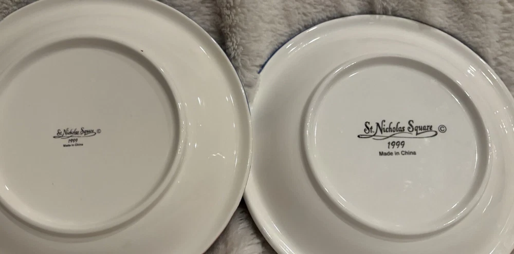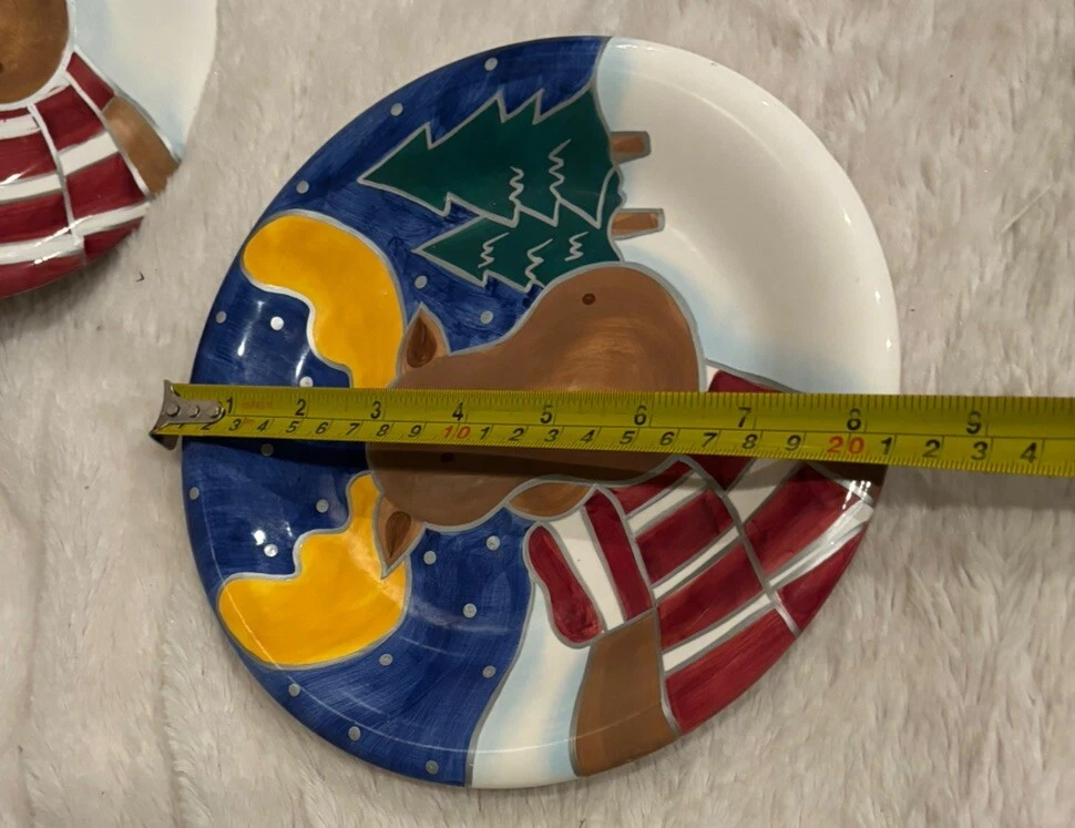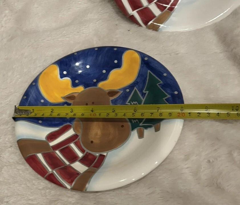 Elevate your holiday table settings with the St Nicholas Square 1999 Reindeer/Moose Salad-Dessert Plate Set. This charming set of two round ceramic plates features a vibrant multicolor design that captures the whimsy of winter. The plates are adorned with a unique St. Nicholas pattern that brings a festive touch to any occasion. Crafted during the 1990s, this original set is a testament to the timeless appeal of moose-themed decor. Made in China. Ideal for both everyday use and special events, these dessert plates are a delightful addition to your collection. No box