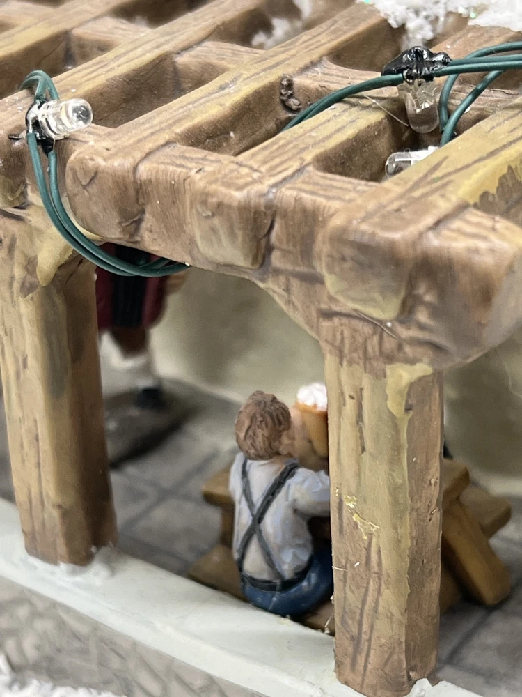 This St. Nicholas Square "Biergarten" Limited Edition Village Collection item from 2018 is a medium-sized ceramic beer garden house, hand-painted in a whimsical Mediterranean style. It features illuminated 3D effects and comes boxed. Ideal for a seasonal village display, this retired piece is perfect for Christmas and any room decor. It includes an adapter and is part of the St. Nicholas Square Village Collection, adding a festive touch to your holiday decorations. Absolutely incredible perfect pristine condition! Comes with all original perfect packaging, box like brand new , comes with A/C adapter and bulb . Lights over outdoor patio blink on & off . Beautiful item to add to your village!