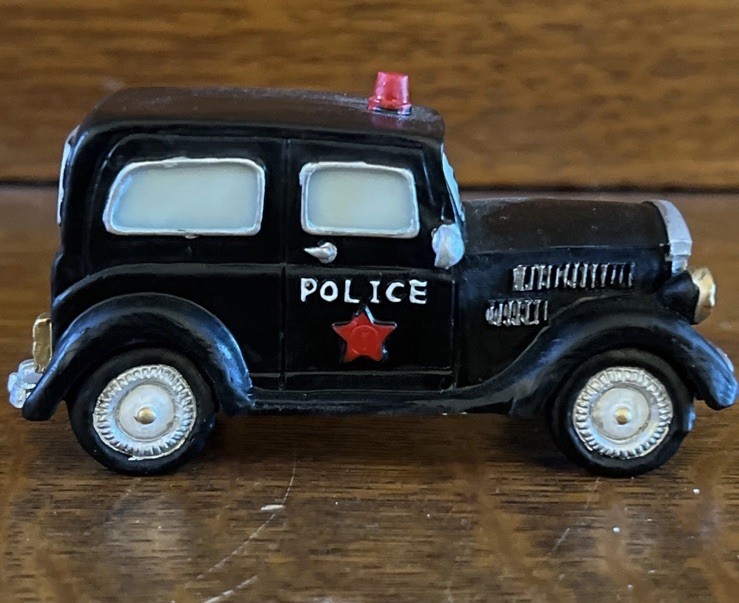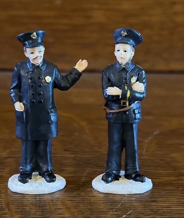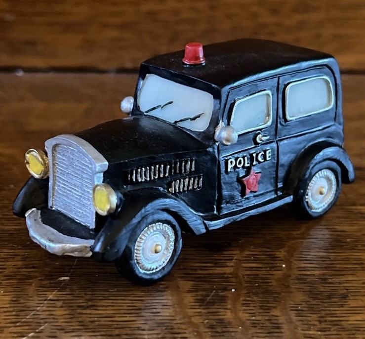 Add a festive touch to your Christmas Village with this St. Nicholas Square accessory featuring a "On The Beat" Police & Car set. The asymmetrical shaped resin set includes a police car and a police figure, perfect for creating a seasonal scene in any room. The multicolor set was manufactured in 1990 and comes in its original boxed packaging. The St. Nicholas Square Christmas Village Accessory is perfect for collectors and holiday enthusiasts of all ages. This original, boxed set is an ideal addition to any Christmas Village collection and features a police car suitable for display. Create a charming and festive scene with this unique accessory.