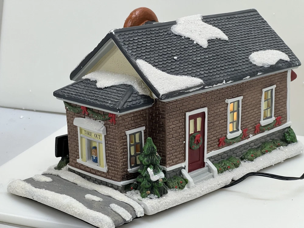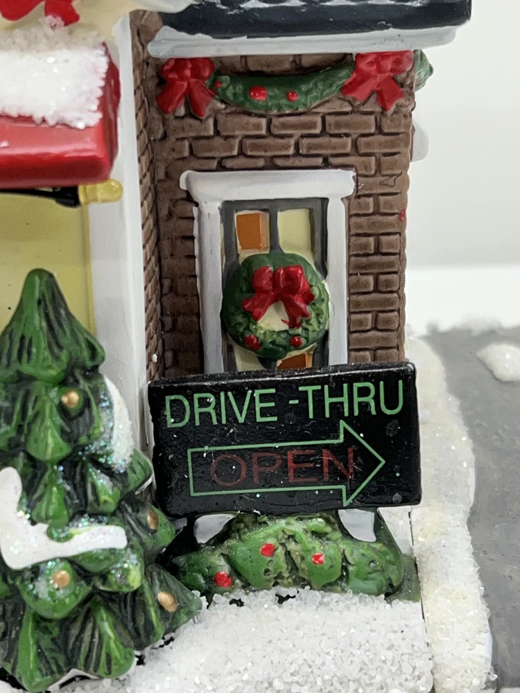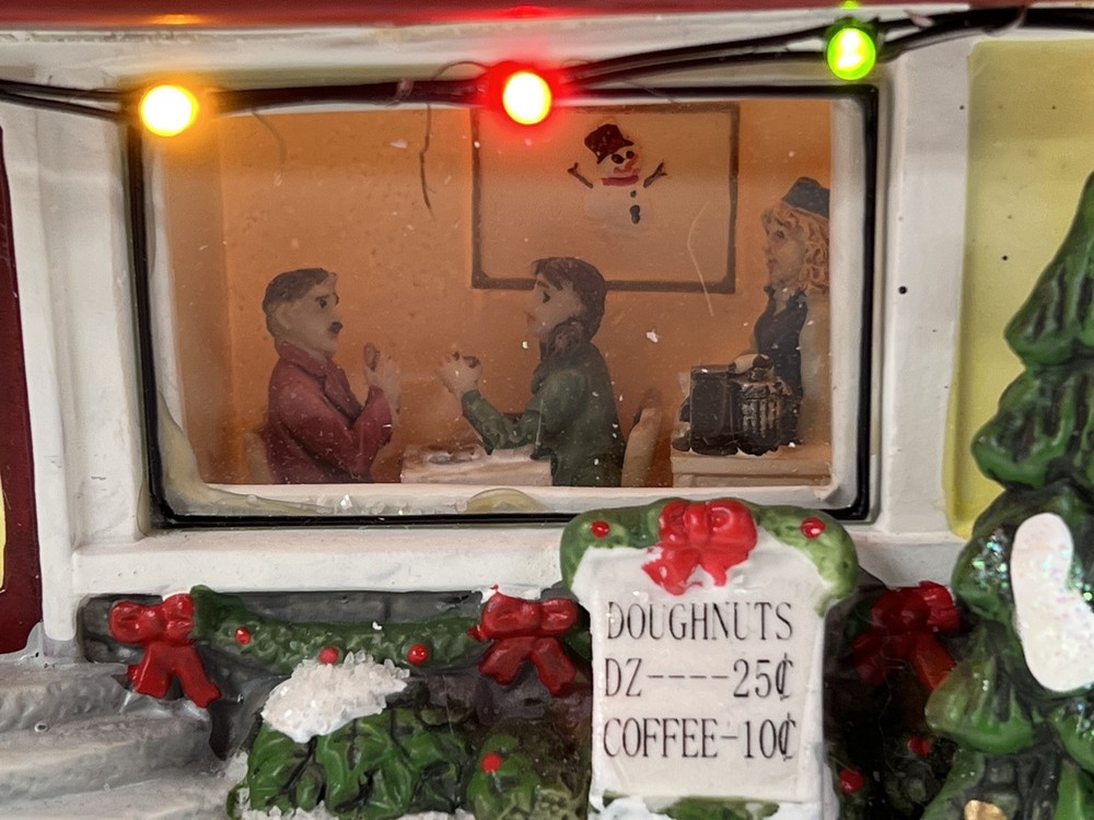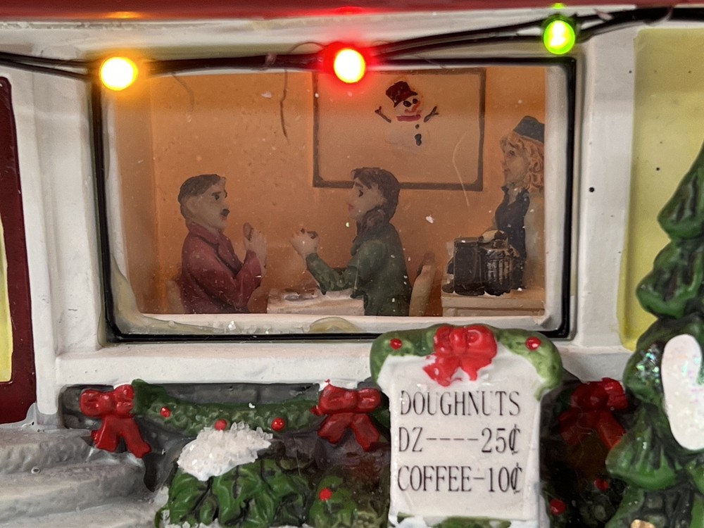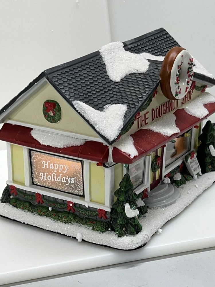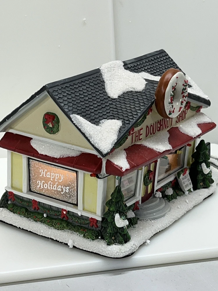 This St. Nicholas Square "The Donut Shop" Christmas village piece from 2011 is a large, asymmetrical, illuminated decoration featuring a whimsical donut shop design. It is suitable for a seasonal village display and includes LED lights with an A/C adapter. The hand-painted, American-style piece has a 3D effect and glitter accents. It is part of the St. Nicholas Square Village Collection and is designed for adults to enjoy in any room. Incredible detail and color ! Perfect pristine condition with all original packaging including light & cord and A/C Adapter