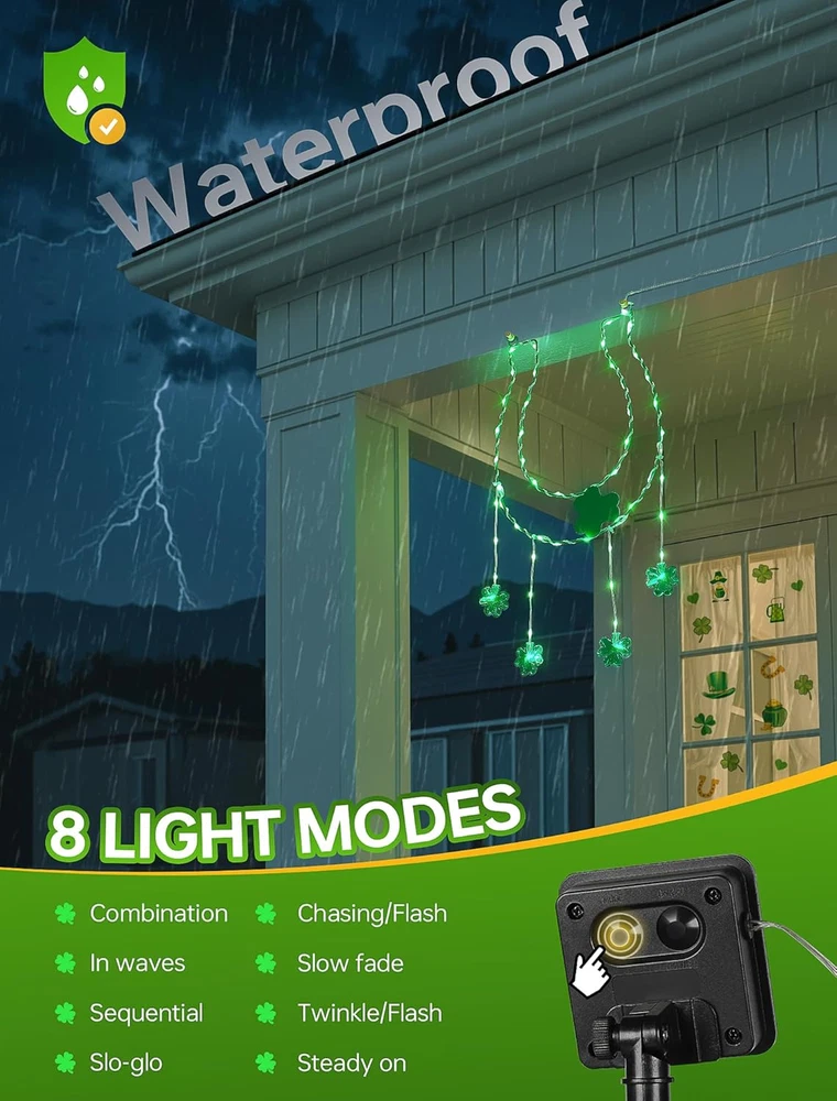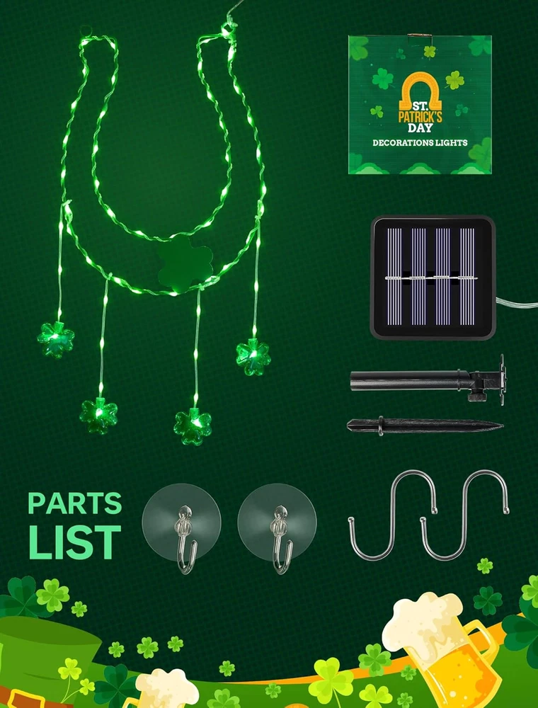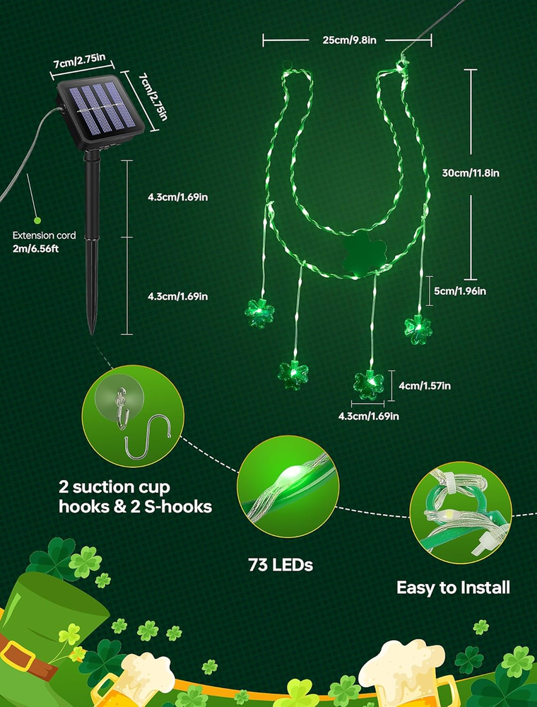 Store New Arrivals Add to Favorite View Feedback Contact Fast deliveries to the customer's home Quality customer service John Make the customers happy! St Patricks Day Solar Lights Outdoor,12In 59 LED Lighted Horseshoe Shamrock St. Patrick'S Day Decorations Window Lights,Hanging Green Light for outside Indoor Tree Yard Garden Wall Door Glass Description Unique St Patrick's Day Decoration Lights:BEEWIN 53 LED st patrick horseshoe lights is made of metal frames,tightly wrapped around with bright warm and green lights,creating eye-catching St Patrick's Day decorations for your home Solar-powered st patricks day lights outdoor:Built-in light sensor,auto on at dusk and auto off by day.Energy saving,no electricity bills,no cords or sockets 8 Modes:Switch the lighting modes of the green decor lights by pressing the button on the solar panel,Combination,In Wave,Sequential,Steady On,Chasing/Flash,Slow Fade,Twinkle/Flash and Steady On,meet different occasions Easy to Install:The horseshoe hanging light comes with extra S hooks,suction cup hooks,and the 6.6ft long lead allows the green lights for st patrick's day to hang directly wherever you want,easy and quick to decorate indoor and outdoor Wide Applications:Horseshoe shamrock st. patrick's day decorations window lights perfect for decorating wall,garden,yard,balcony,tree,terrace,gazebo,porch,also ideal St Patricks Day gifts for your relatives and friend Product Description 1 8 MODES 2 2 WAYS TO HANG 3 WATERPROOF Indoor Decoration Balcony Decoration Window Decoration Style Garden Number of Light Sources 59 Number of Items 1 Power Source Solar Powered Color Green Light Color Green Material Metal Type of Bulb LED Batteries Required? Yes Package Dimensions 12.99 x 10.16 x 1.14 inches Item Weight 11.7 ounces Theme st. patrick's day Batteries Included? Yes Voltage 3 Volts Recommended Uses For Product shamrock lights outdoor for garden,yard,window,wall,St. Patrick's Day,spring,balcony,porch,gazebo,glass,front door,tree,terrace,ceiling,parties Special Features Corded Included Components Metal,Fairy lights,Hooks Size Horseshoe ABOUT US We offer the best prices around on high quality products. Our E-store includes media such as books, movies, music and games while offering electronics, toys, sporting apparel, clothing, tools, general home, garden items and more. SHIPPING We are always working hard to ensure your package arrives as soon as possible. Please understand that some factors like weather, high postal traffic, and the performance of shipping companies are outside of our control. We offer free shipping to the lower 48 states and ship within 2 business days of payment, usually sooner. We do not accept P.O. Boxes. Please provide a physical address. For shipping outside of the continental USA, we only use eBay's Global Shipping Program. The item is shipped to KY and then sent to the rest of the world. International customers are responsible for all duties and taxes. Continue to 'check out' to calculate costs for shipping the item to your country. Messages regarding eBay's Global Shipping Program MUST be directed at eBay EXCLUSIVELY. RETURNS We offer a 30-Day Return Policy on items in which you are not completely satisfied with. You have the option of a full-refund or an exchange of the item. No returns are available on items shipped outside of the USA PAYMENT We accept PayPal. CONTACT US This page content is yet to come Please ad us to your favorite seller and visit again later Thank You CUSTOMER SATISFACTION We try our very best to make sure every customer is completely satisfied. If there's a problem, message us! We're happy to help. WE ACCEPT