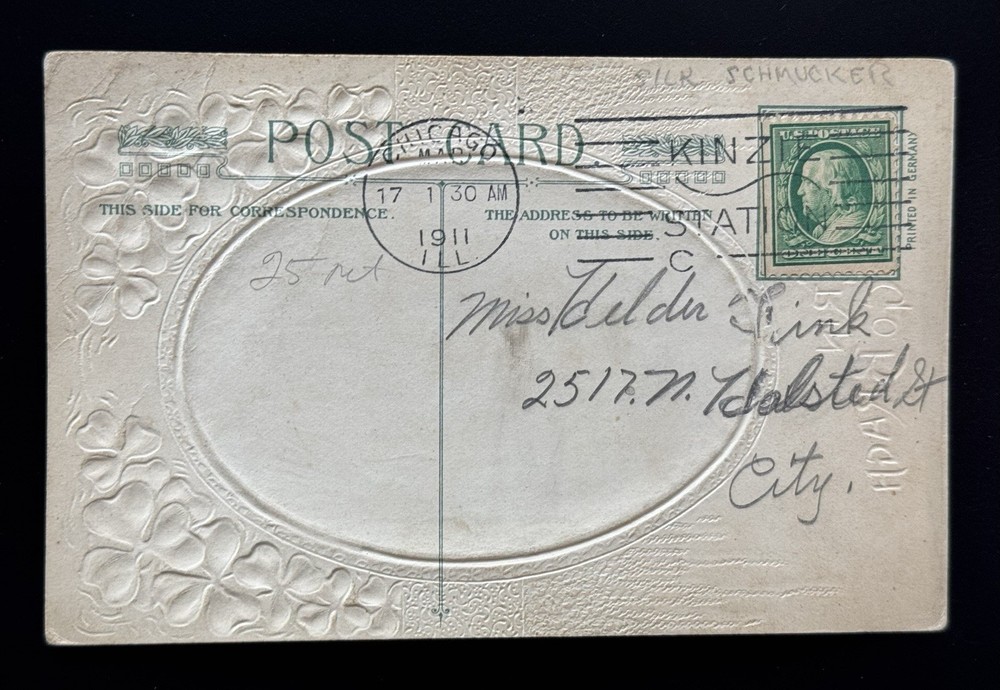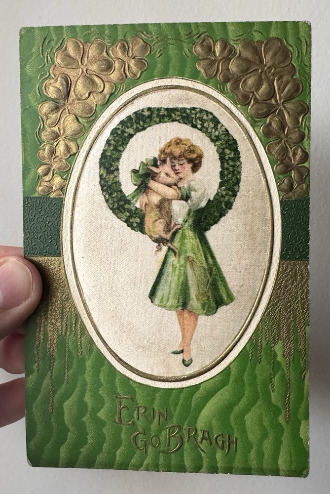 St Patrick's Day - Erin Go Brach Postcard - Silk Insert Girl Holding a Piglet