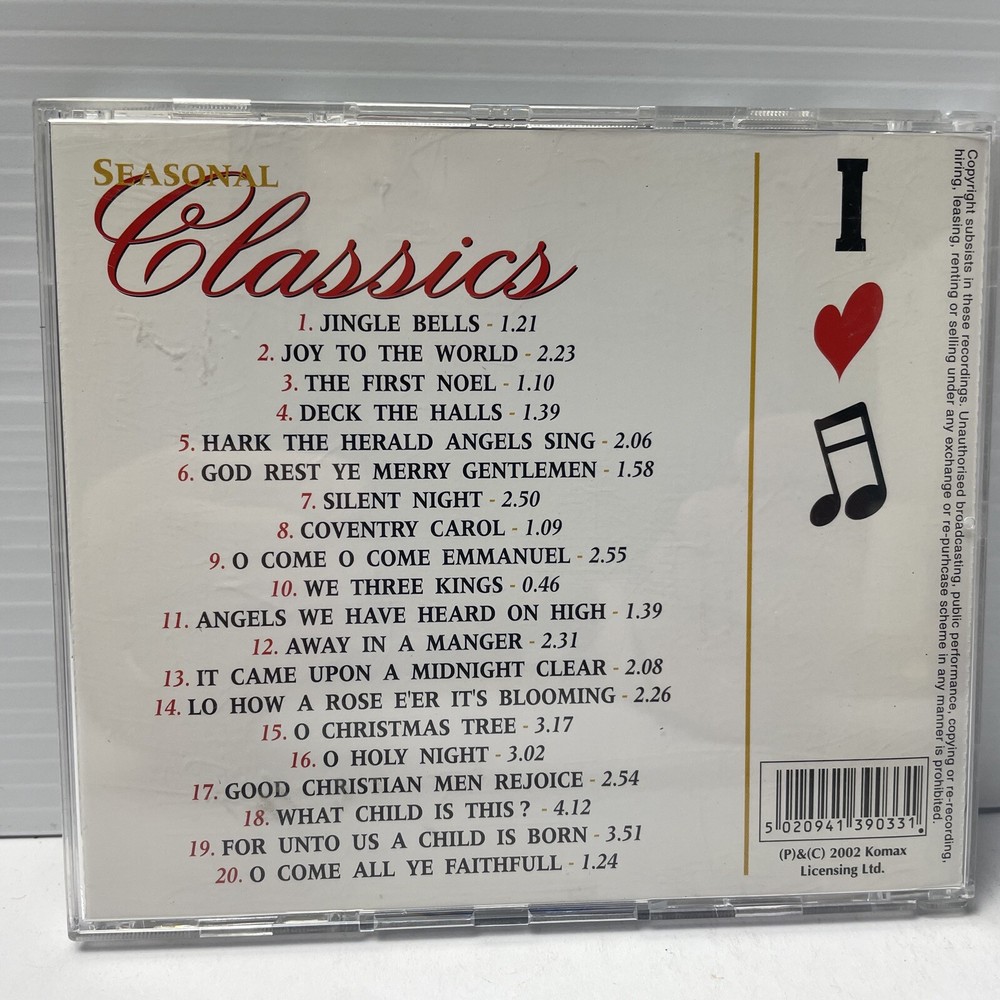Release Title: Seasonal Classics Edition: Standard CD Grading: Very Good (VG) UPC: 5020941390331 Case Type: Jewel Case: Standard Case Condition: Very Good (VG) Release Year: 2002 Record Label: Komax gtin13: 5020941390331 Style: Christian, Easy Listening, Christmas Type: Album Artist: St. Pauls Chamber Orchestra Colour: Multicoloured Features: Compilation Era: N/A Inlay Condition: Very Good (VG) Format: CD Genre: Classical, Religious & Devotional