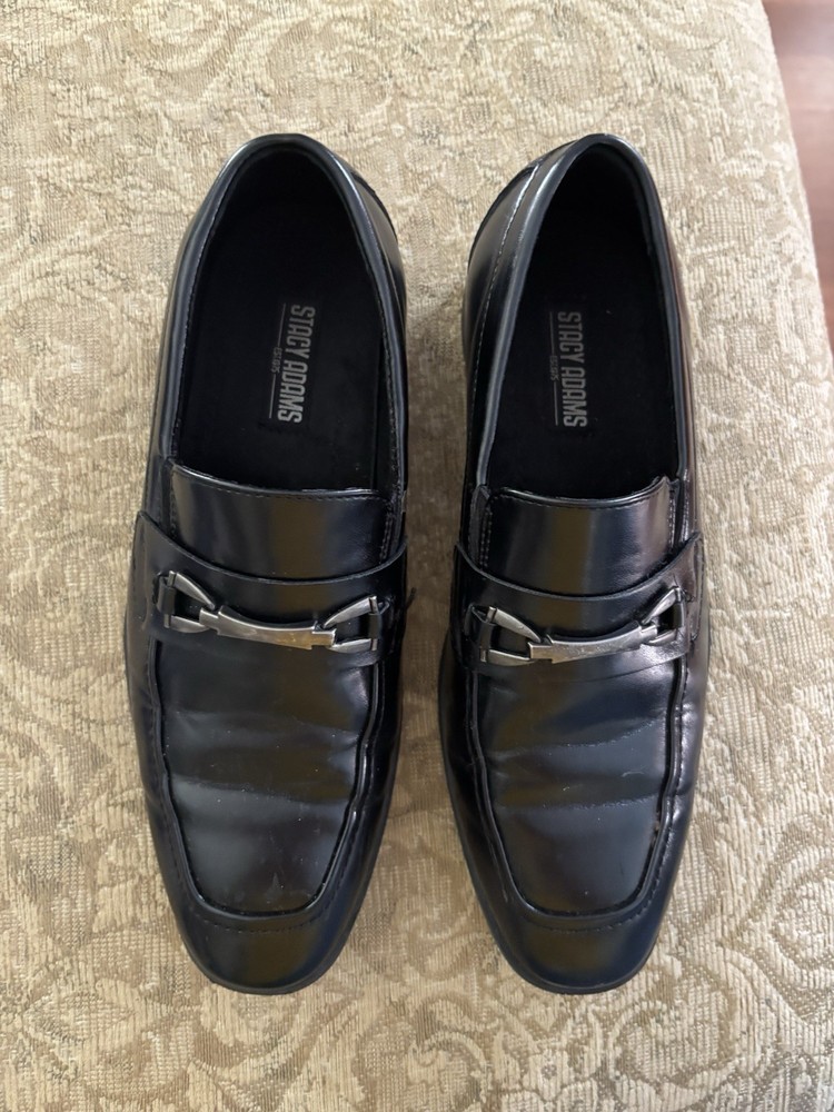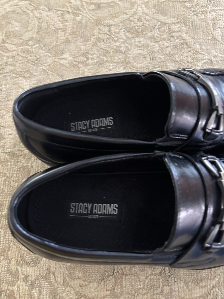 These Stacy Adams black dress shoes are brand new and feature a slip-on closure for easy wear. With a low top shaft style and square toe shape, these shoes are designed for formal occasions. Made with a rubber outsole for durability, they offer moderate cushioning and are suitable for summer, fall, and spring seasons. Perfect for young boys looking to put their best foot forward in a stylish and sophisticated way.