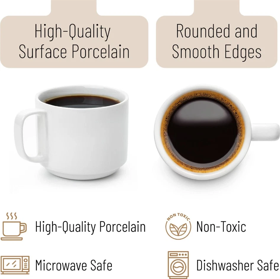 Our coffee mugs are made of porcelain and are a beautiful, bright, shiny white. They are very sublime and will make your morning coffee even more enjoyable. Our stackable coffee mugs would make a stylish addition to any kitchen, ideal as a birthday gift for the coffee lover in your life. Each mug holds 12oz, which is perfect for espresso drinks, hot chocolate, coffee in the morning, or having tea with your friends. The huge user-friendly handle is comfortable to grip, and the mugs are dishwasher and microwave safe. White is the color of simplicity. The stackable coffee mugs are designed with no elaborate patterns, making them look clean and appealing to the eye. If you are looking for a simple yet elegant design, this white porcelain mug will be your perfect choice. Our mugs are easy to store and take up minimal space, making them the perfect choice for anyone who wants to save some extra room in their kitchen.