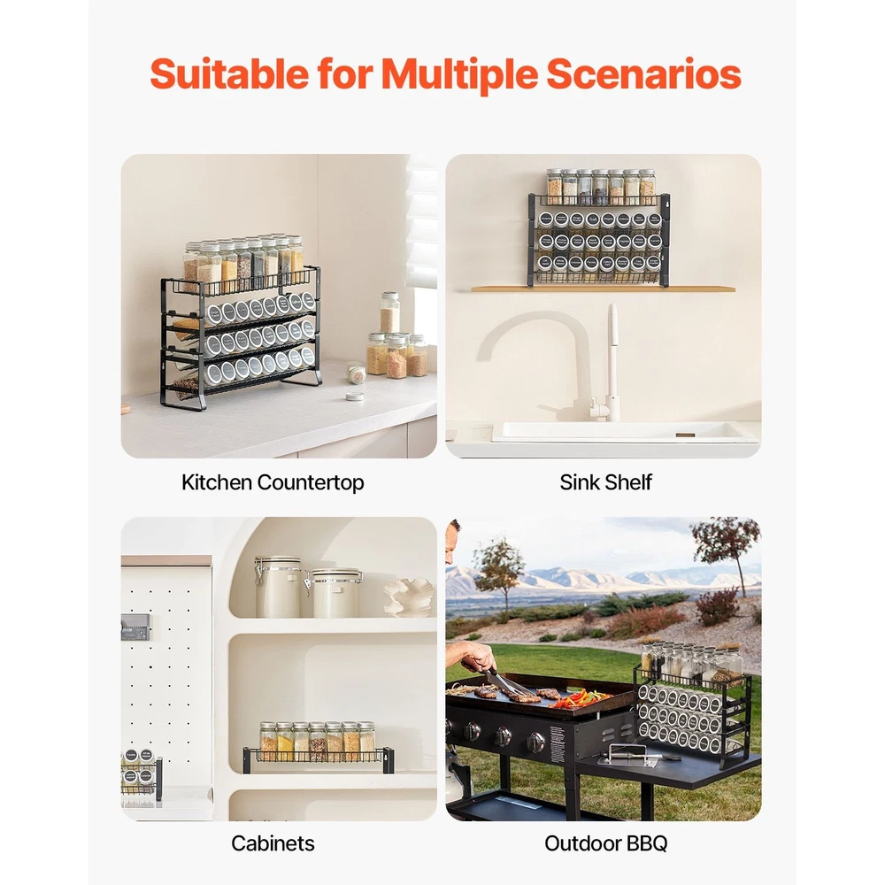 Multifunctional Spice Rack to Meet Various Needs The multi-layer structure provides ample storage space, accommodating multiple spice jars. Whether it's everyday items like salt and sugar or occasional specialty spices, there's a perfect spot for everything. The spice rack organizer features a stackable design, offering great flexibility and practicality. The two-tier main rack provides spacious storage for spices, while the additional 2 single-tier racks can be added or used separately as needed. This space-saving seasoning storage set supports both countertop and wall-mounted installation. Place it on your countertop to save cabinet space or mount it on the wall to make full use of vertical space, keeping your countertop tidy and organized. The multi-tier structure neatly organizes and displays your spice bottles, reducing clutter while maximizing countertop space for daily cooking and other activities. Every detail has been carefully considered, from the user-friendly design to the high-quality materials used. The easy to assemble shelf provides exceptional care to ensure a comfortable and convenient experience during use.
