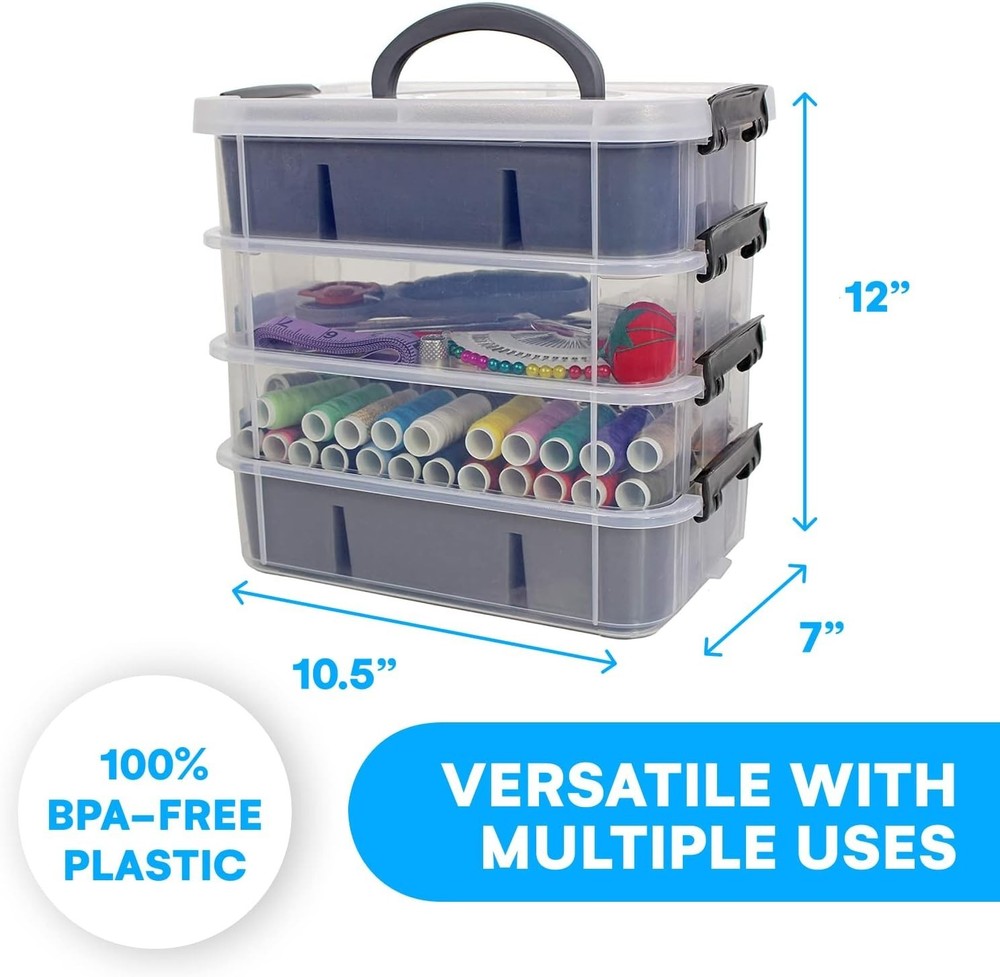About this item Organize Large and Small Supplies Easily: This craft storage box includes 4 deep compartments plus 2 trays with 12 dividers; ideal for thread, pins, tape, buttons, and other crafting materials Custom Divider System for Precision Storage: Adjustable slots let you sort beads, bobbins, needles, and tools; this craft organizer box helps keep your DIY or sewing supplies neatly arranged Stackable and Compact for Small Spaces: With dimensions of 10.5 x 7 x 12 inches, this sewing storage organizer fits perfectly in cabinets, closets, or shelves without taking up too much space Travel-Friendly with Built-In Handle: Designed as a portable sewing box for sewing supplies, this case has a sturdy top handle and secure clasps, perfect for classes, travel, or studio work Multi-Purpose Craft and Sewing Utility: This craft organizers and storage bin also works as a sewing supplies organizer, jewelry box, or bead case; ideal for hobbyists, tailors, or kids' crafts