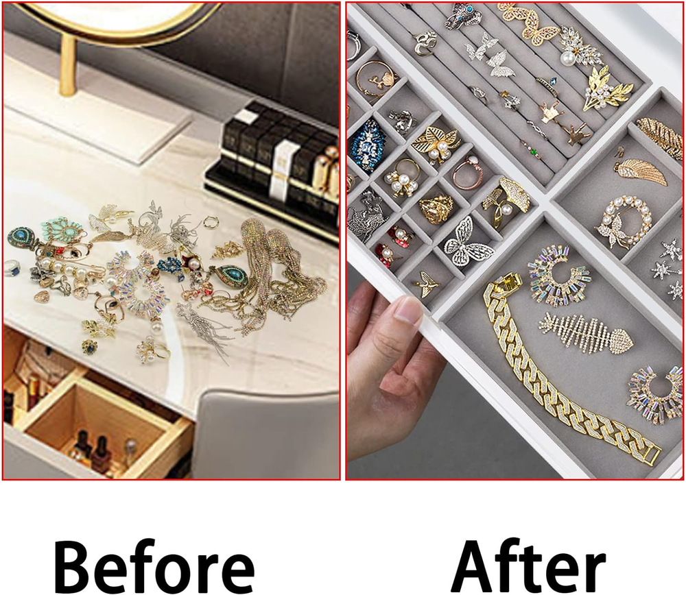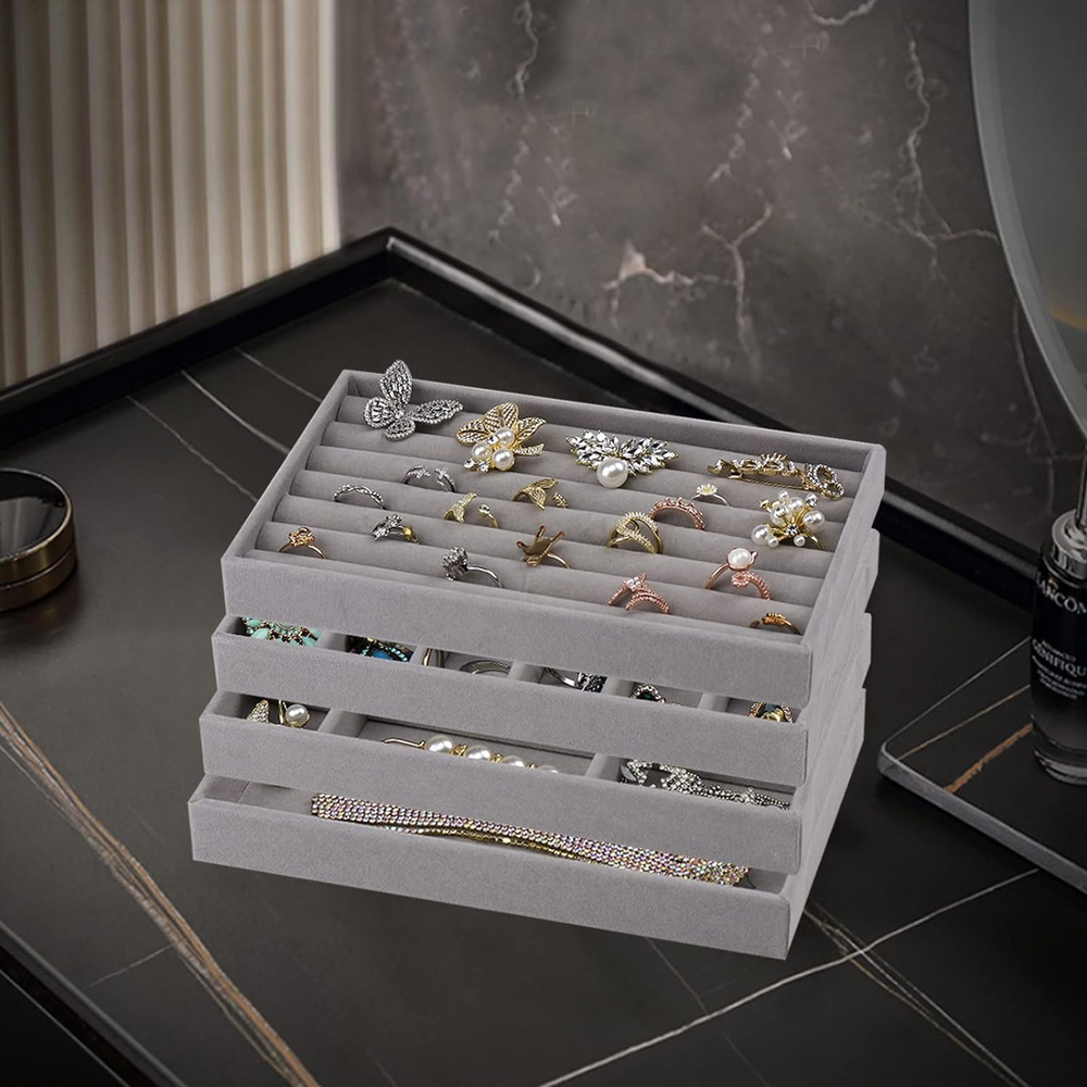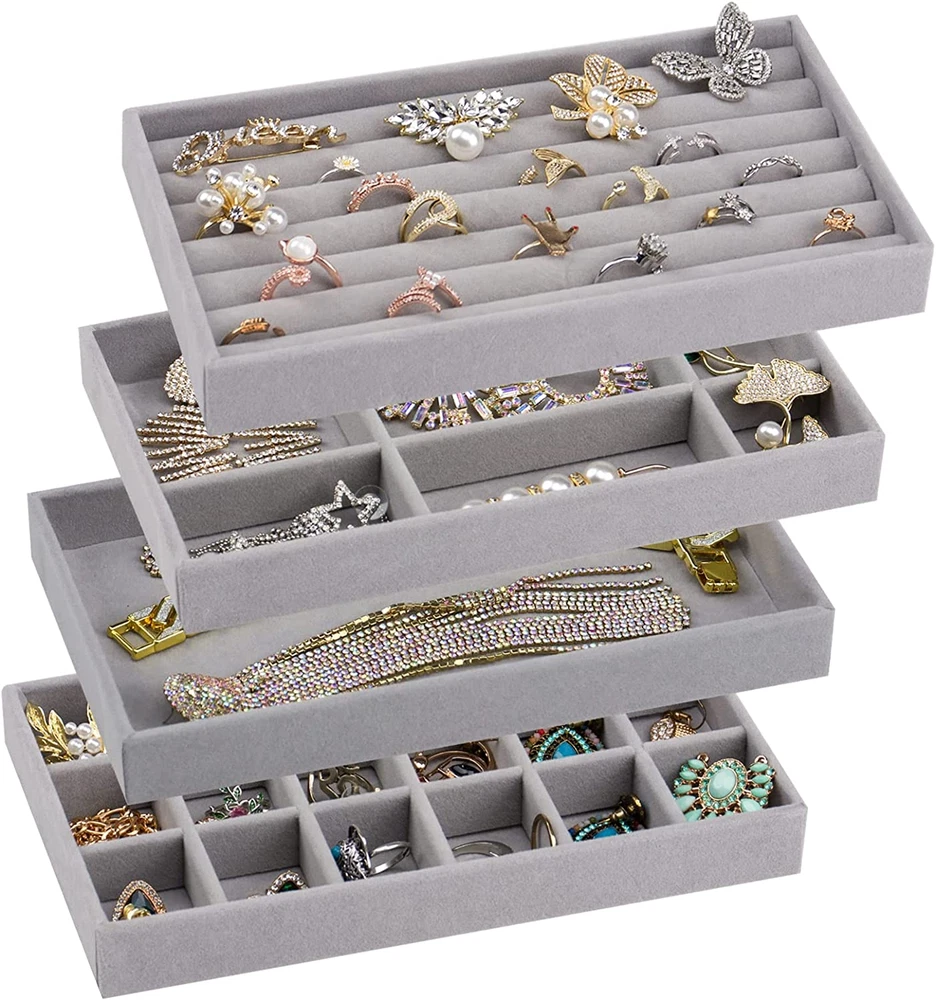 Store New Arrivals Add to Favorite View Feedback Contact Stackable Velvet Jewelry Trays Organizer for Drawers, Small Jewelry Drawer Organizer Display Tray for Earring Ring Watch Bangle Bracelet Necklace, Set of 4, Gray Description Style Modern Number of Compartments 2 Number of Items 1 Color Gray Target Audience Women Item Dimensions D x W x H 4.92"D x 8.3"W x 0.98"H Material Plastic Inner Material Velvet Item Weight 0.49 Kilograms Shape Square Recommended Uses For Product Earring Occasion Wedding, Birthday, Mother s, Valentine's Day Special Features Stackable Jewelry Storage Type Jewelry Tray Special Feature Stackable Product Dimensions 4.92"D x 8.3"W x 0.98"H Velvet Jewelry Drawer Organizer: jewelry trays are fully covered with soft velvet, simple and practical; removable dividers of two compartment trays help adjust grid sizes to accommodate jewelries of various sizes. Set of 4: the jewelry trays set comes in 4 pieces with different layouts, includes 6-Grid Tray(1 pc), Rings Display Tray (1 pc) , 18-Grid Tray(1 pc) , Blank Tray (1 pc); easily stores different jewelries like earrings, rings, necklaces, watches, bracelets, bangles, breast pin, brooches, hair accessories, etc. Small Jewelry Trays for Drawers: each tray measures 8.30" x 4.92" x 0.98" (LxWxH), fits in most drawers, dressers or shelves. Perfect gift for women and girls for Christmas, Birthday, Anniversary, Valentine's Day, Mother's Day. Stackable Jewelry Organizer Trays: 4 jewelry trays are stackable, perfect for home storage, trade shows or retail shops, can be Stacked to create more space for storage; making jewelries well organized and orderly stored. What You Get: 4 stackable jewelry organizer trays; if you're not satisfied with the trays set in anyway, if it breaks, if it's damaged in shipping, we'll help you the fastest to solve the problem. Product Description Ptaedex Velvet Jewelry Tray Set provides a wonderful display of your daily jewelry essentials in one place, small but sturdy, perfect to organize your bracelets, rings, earrings, watches, and necklaces, while eliminating tangled jewelry. Package Included: 4 small jewelry trays 18-Grid Tray x 1 Blank Tray x 1 Rings Display Tray x 1 6-Grid Tray x 1 Stackable Jewelry Trays Organizer 4 jewelry trays are stackable, perfect for home storage, trade shows or retail shops, can be Stacked to create more space for storage; making jewelries well organized and orderly stored. Velvet Jewelry Trays for Drawer Small dresser drawer organizers are fully covered with soft velvet, perfect for you to protect your jewelry from damages and scratches. DIY the Storage Space The inner dividers of the 6 and 18 compartment jewelry trays are removable, you can adjust the size and number of compartments to store large jewelry. Best Gift for Her A perfect gift for your girlfriend, wife, mother, daughter, friends and so on. It is also a good idea of Valentine's Day Gift, Birthday Gift, Mother's Day Gift, Christmas's Gift, Wedding Gift, Engagement Gift, Anniversary Gift and etc. Quick Access to Everyday Jewelries Designed to keep the daily needed jewelries stored conveniently and organized. Making it easy to find the jewelry you want in seconds. ABOUT US We offer the best prices around on high quality products. Our E-store includes media such as books, movies, music and games while offering electronics, toys, sporting apparel, clothing, tools, general home, garden items and more. SHIPPING We are always working hard to ensure your package arrives as soon as possible. Please understand that some factors like weather, high postal traffic, and the performance of shipping companies are outside of our control. We offer free shipping to the lower 48 states and ship within 2 business days of payment, usually sooner. We do not accept P.O. Boxes. Please provide a physical address. RETURNS We offer a 30-Day Return Policy on items which you are not completely satisfied with. You have the option for a full-refund or an exchange of the item. No returns are available on items shipped outside of the USA. PAYMENT We accept PayPal. CONTACT US This page content is yet to come Please ad us to your favorite seller and visit again later Thank You CUSTOMER SATISFACTION We try our very best to make sure every customer is completely satisfied. If there's a problem, message us! We're happy to help.
