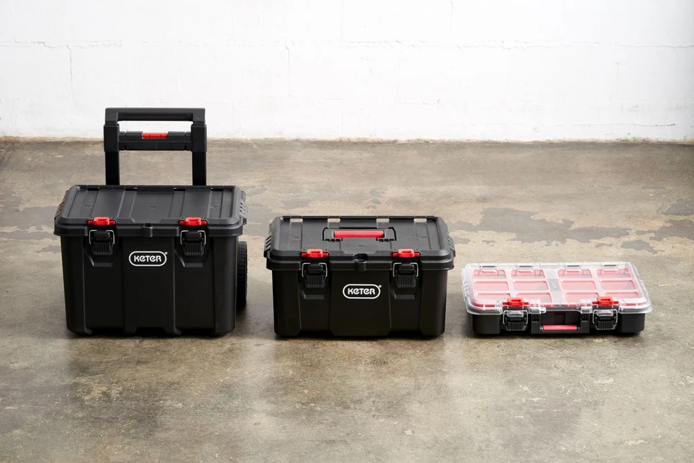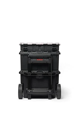 The Stack-n-Roll Modular Tool System offers a practical storage solution for your hand tools, power tools, and all types of hobbies or home DIY use. It is perfect for keeping your important stuff organized and accessible at the same time. The biggest feature is its interlocking modular connectivity within all 3 pieces included. This allows you to finidh your job and put away all your tools that minimizes space and will keep you organized. A drawer lock bar means you’ll never have to worry about drawers slipping out when you’re on the move (lock not included). Made from sturdy and durable resin, this lightweight drawer unit is built for frequent use. Durable and Lightweight construction makes this modular tool storage system perfect for home use The system is an interlocking, customizable, mobile workshop that includes a cart, toolbox and organizer Snaps close wit audible latches that confirm your contents are secure Metal telescopic handle with 7” durable wheels and side grips for maximum mobility to your next project or jobsite Features a transparent polycarbonate lid on the small parts organizer