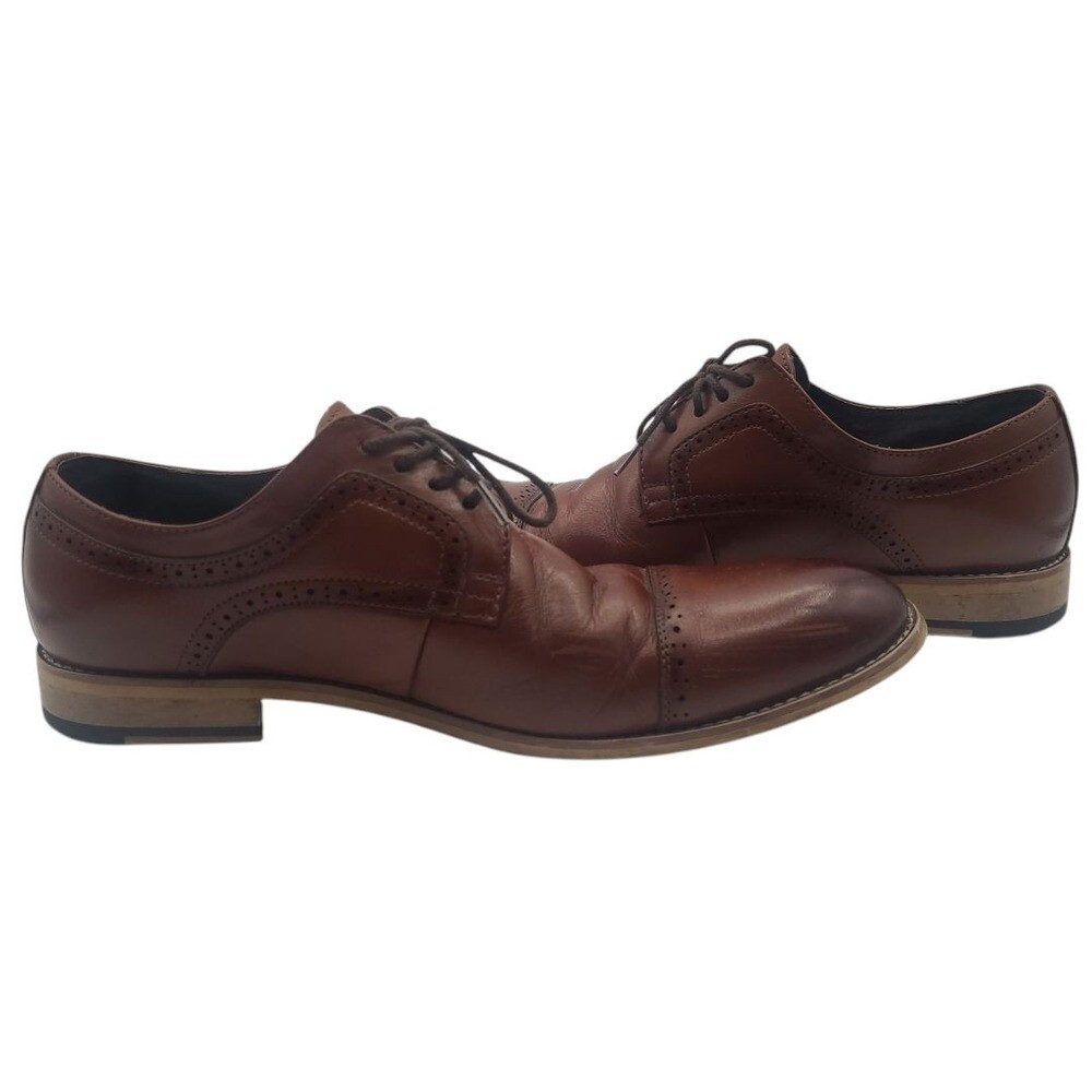 Crafted for the discerning gentleman, these Stacy Adams Dickinson men's dress shoes blend classic style with modern sensibilities. In a rich cognac hue, the cap toe oxfords feature a sharp pointed toe and are meticulously constructed with a leather upper, insole, and outsole, promising both durability and comfort. The cotton lining ensures your feet stay comfortable throughout the day, whether you're at the office or out for an evening event. Lace-up closure allows for a secure and adjustable fit, while the solid brown color offers versatility to complement a variety of attire. Designed to be a staple in any wardrobe, these shoes support a sophisticated theme and are suitable for all seasons. The size 10M width ensures a perfect fit for most, making these oxfords a practical choice for the fashion-conscious man.