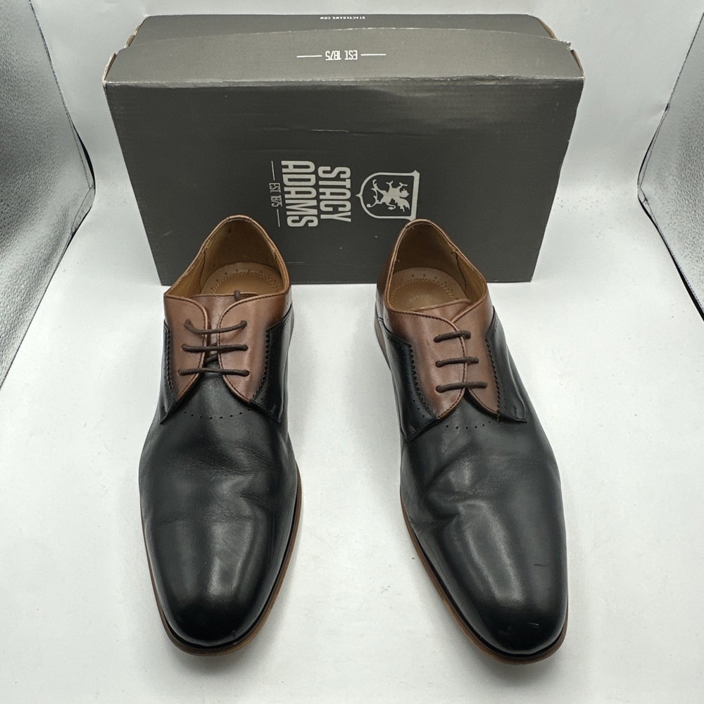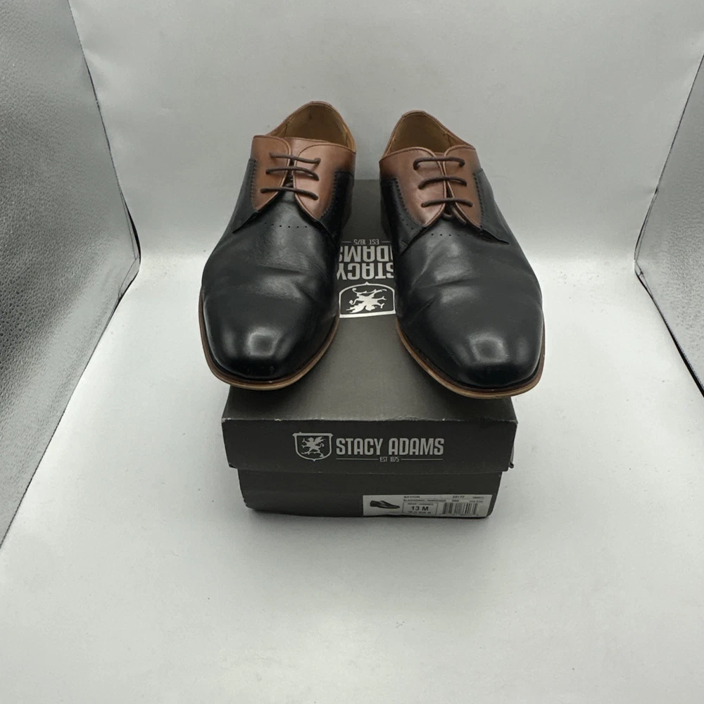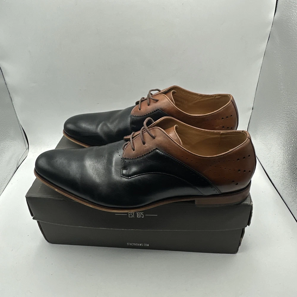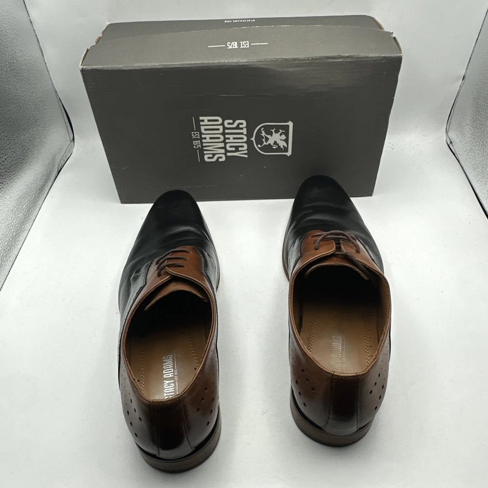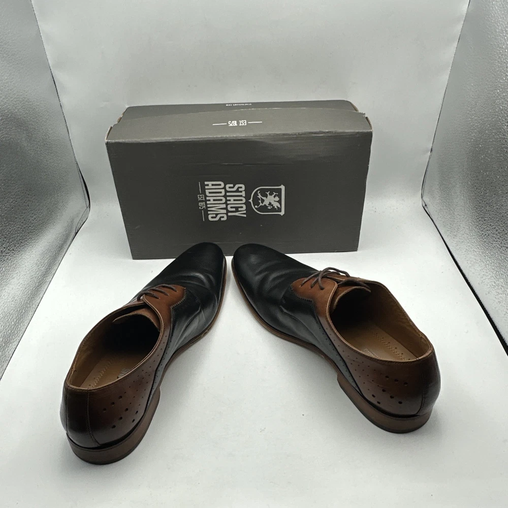 These Stacy Adams Men's Size 13 Shoes in Black Brown Leather with a Plain Toe Savion Office Dress are a stylish and versatile addition to any man's wardrobe. The almond toe shape and lace-up closure give them a classic and modern look, perfect for various occasions. Made with high-quality leather, these shoes are durable and comfortable for year-round wear. The solid black color and leather lining and outsole add a touch of sophistication to any outfit, making them a great choice for the office or a night out on the town.