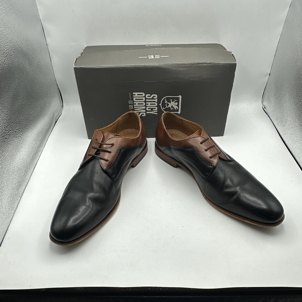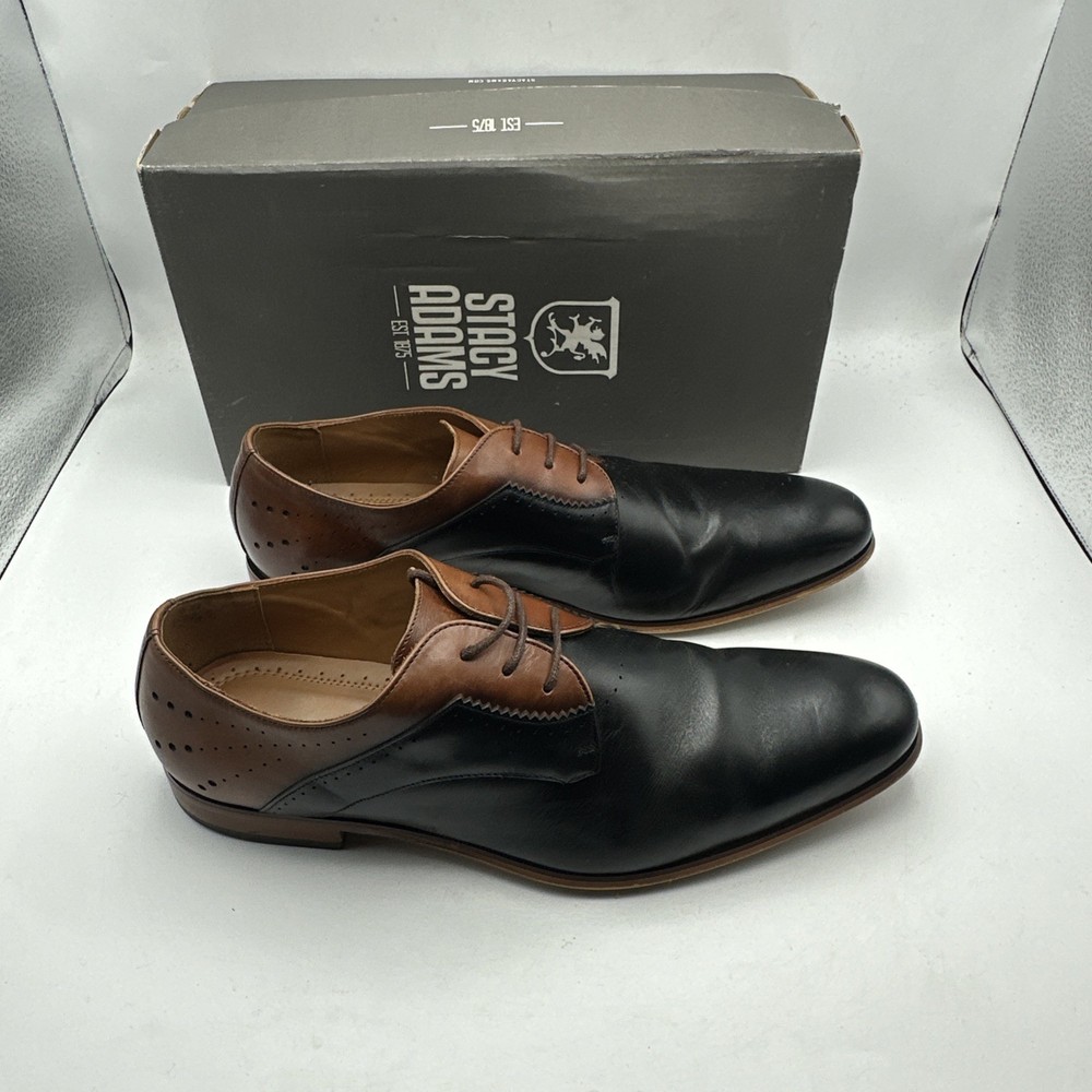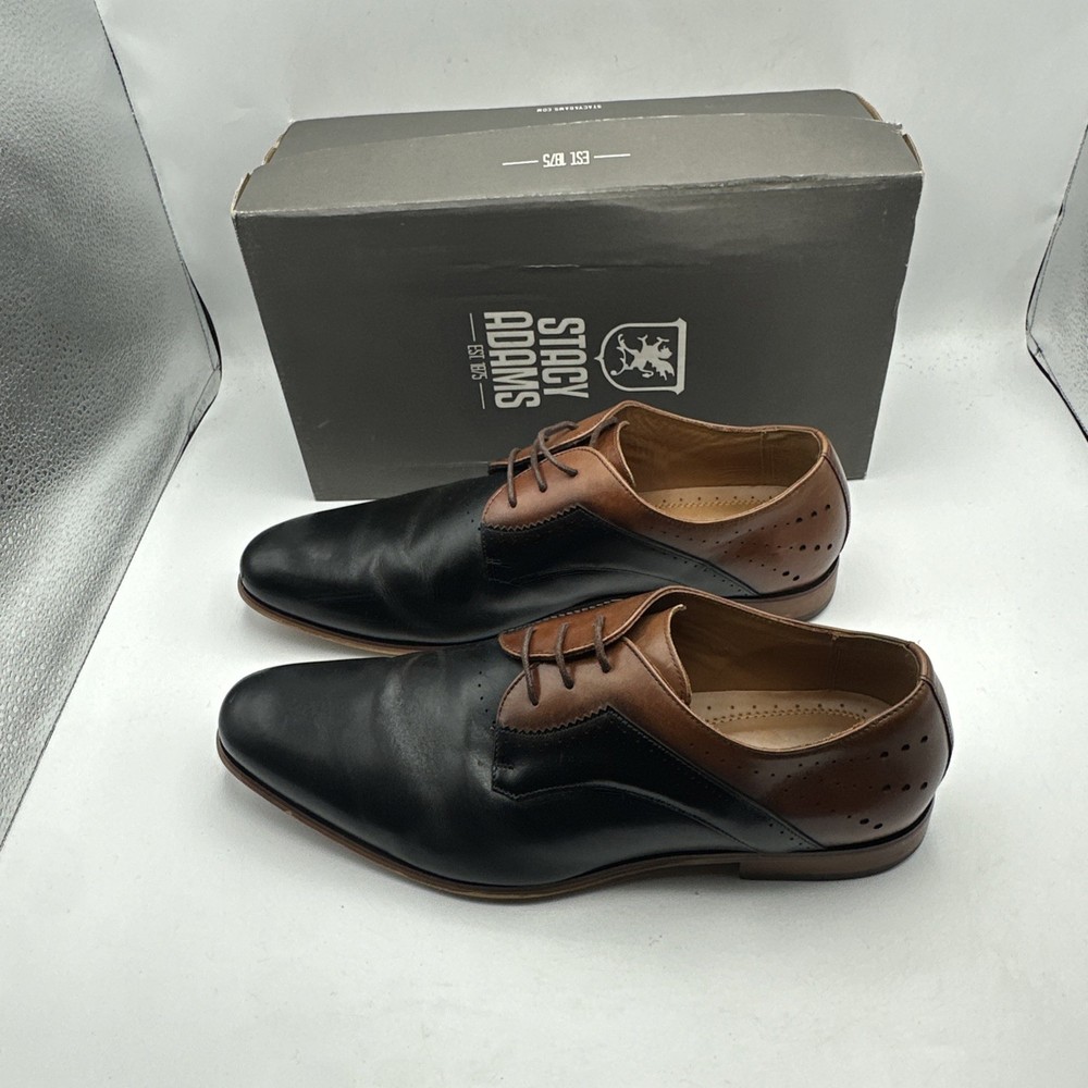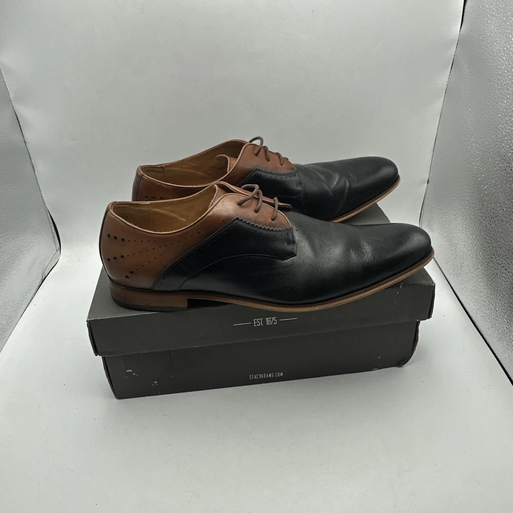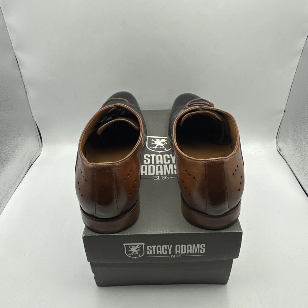 These Stacy Adams Men's Size 13 Shoes in Black Brown Leather with a Plain Toe Savion Office Dress are a stylish and versatile addition to any man's wardrobe. The almond toe shape and lace-up closure give them a classic and modern look, perfect for various occasions. Made with high-quality leather, these shoes are durable and comfortable for year-round wear. The solid black color and leather lining and outsole add a touch of sophistication to any outfit, making them a great choice for the office or a night out on the town.