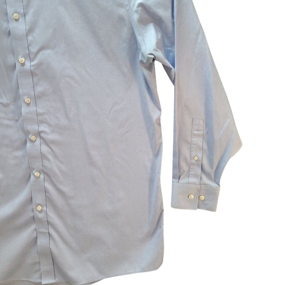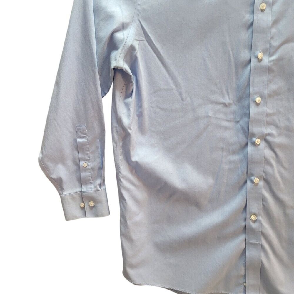 Stafford Dress Shirt Men's Sz 17.5 Long Sleeve Button Up Oxford Non Iron Blue Elevate your formal or casual wear with this Stafford dress shirt. The collared neckline and button-down closure make it suitable for any occasion, whether it be workwear or a business meeting. The shirt is made of a comfortable and durable polyester, cotton, and cotton blend fabric, with a solid blue pattern and long sleeves. It features a non-iron material, making it easy to maintain and machine washable. The shirt has a regular fit, with a chest size of 48 inches and a neck size of 17.5 inches. The top cuff style is a barrel cuff, with accents of buttons and a classic theme. This dress shirt is perfect for any man who wants to look sharp and feel comfortable.