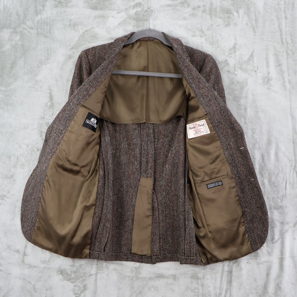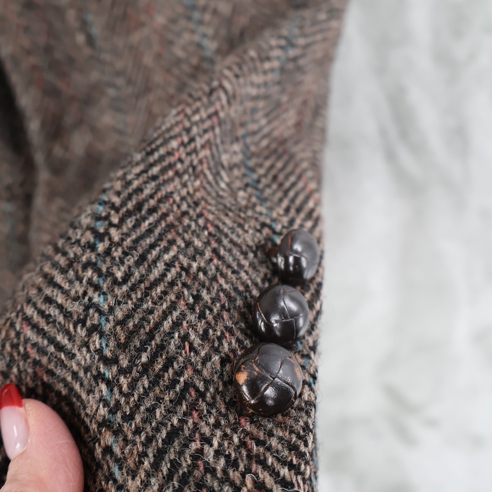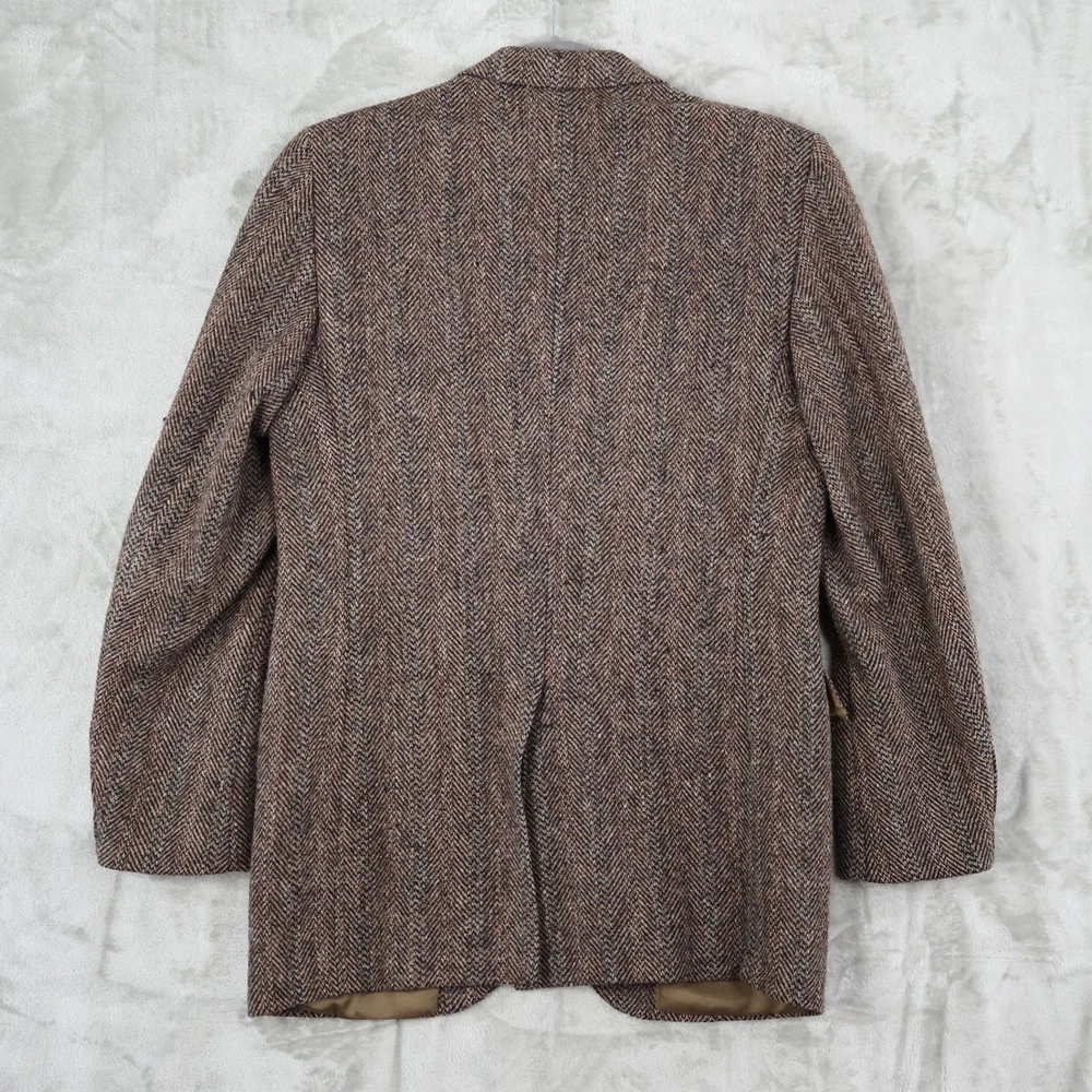 Classic mens blazer, a handsome fusion of heritage and style. This sophisticated piece features a timeless herringbone pattern in rich, earthy tones, complemented by a classic three-button closure and notched lapel. The blazer is fully lined, and includes functional pockets for added practicality. The handwoven Scottish wool provides warmth and durability, making it a versatile layering piece. Perfect for smart-casual events, weekend getaways, or adding a touch of refinement to your everyday ensemble. Size has been estimated based on measurements: Chest: 20.5" Shoulder to Shoulder: 17.5" Waist: 19" Length: 31.5" Sleeve Length" 26.5" Keywords: Preppy, Academia, Professor, Classic, Old Money, Country Club C3 •All clothing items have been steam sanitized or washed. •Please compare the measurements to something you already own.