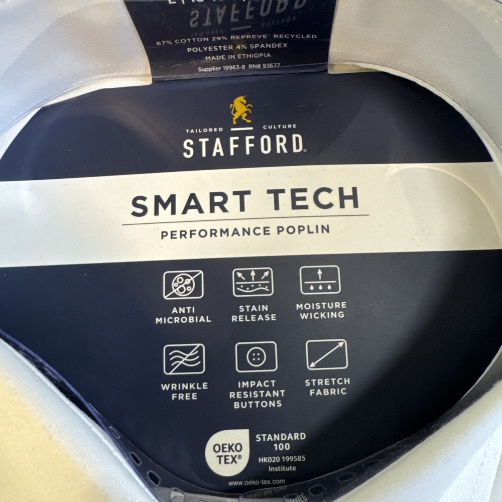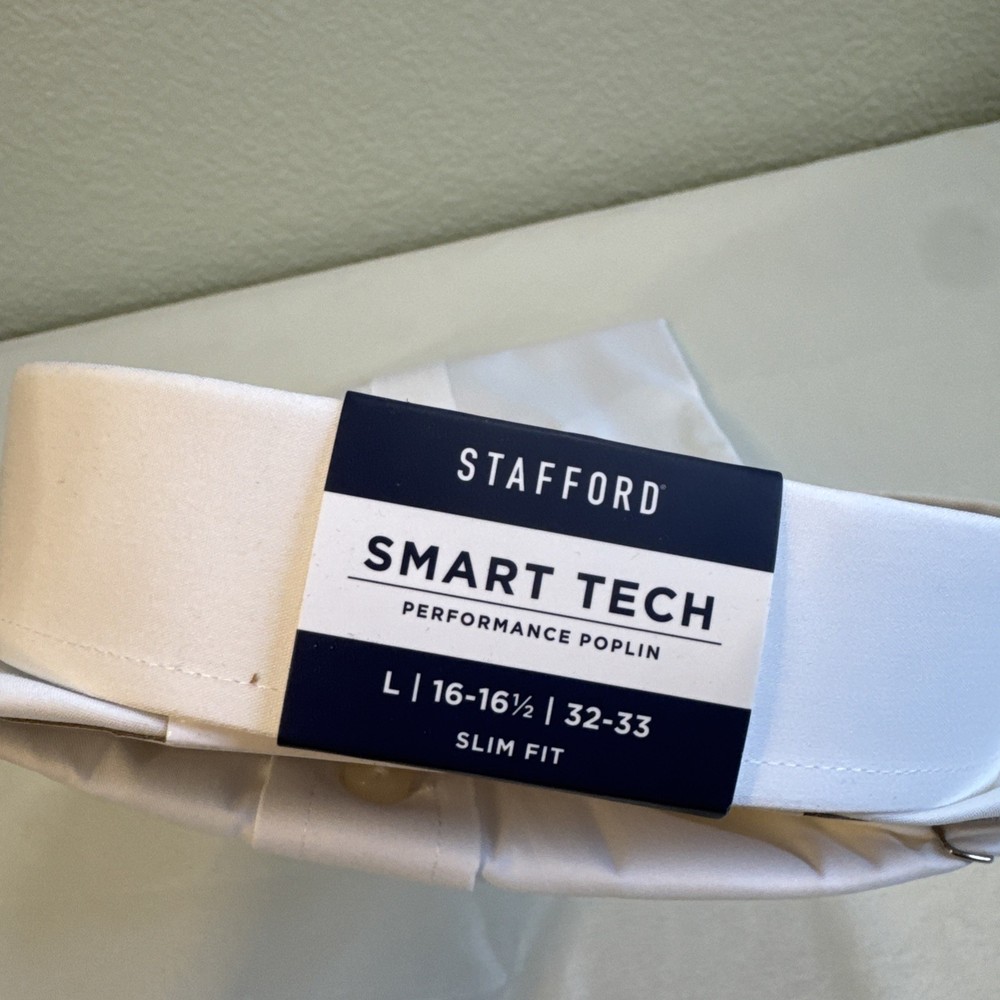 The Stafford Men’s Smart Tech Dress Shirt in size L offers a slim fit design in a crisp white color. This dress shirt is perfect for men looking for a sleek and stylish option for formal or professional settings. With its slimming features, this shirt is sure to provide a polished and tailored look for any occasion. Made by the brand Stafford, known for quality men's clothing, this dress shirt is a versatile and essential piece for any man's wardrobe.