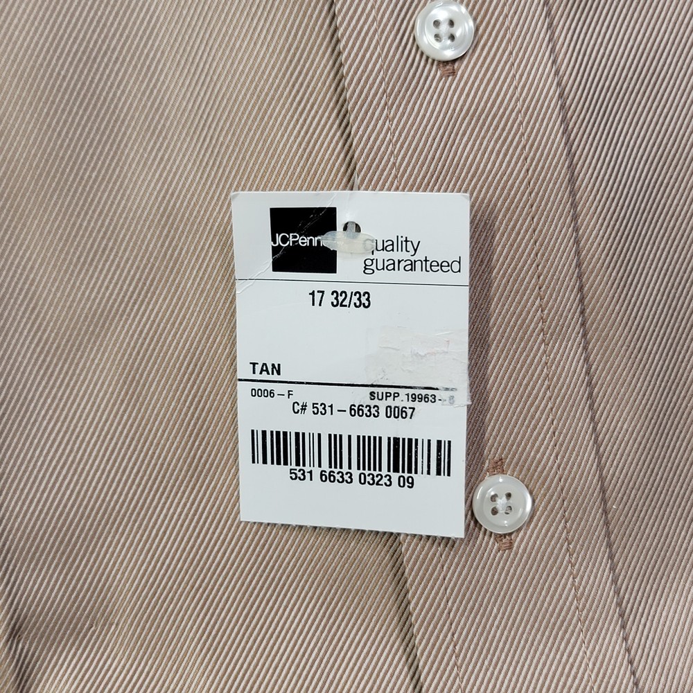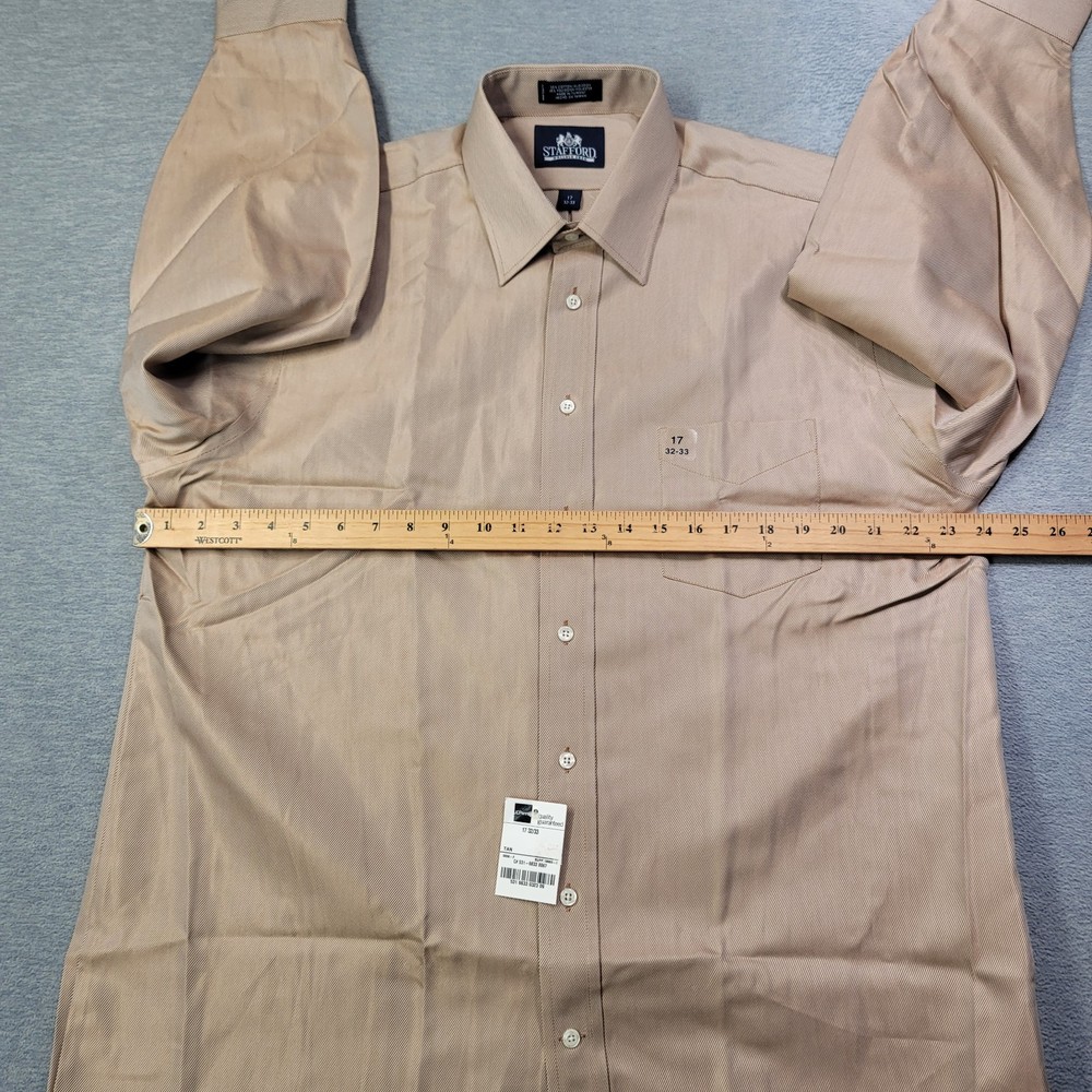 The Stafford Shirt is a classic men's dress shirt in a solid tan color, featuring a collared neckline, button closure, and long sleeves with a 32/33 sleeve length. Made from a blend of polyester and cotton, this wrinkle-free shirt is designed for a classic fit and includes a chest pocket for added functionality. The spread collar and barrel cuff add a touch of sophistication to this timeless piece, perfect for any formal or professional occasion.