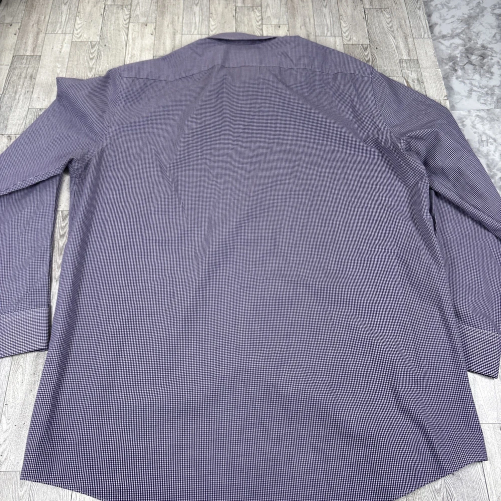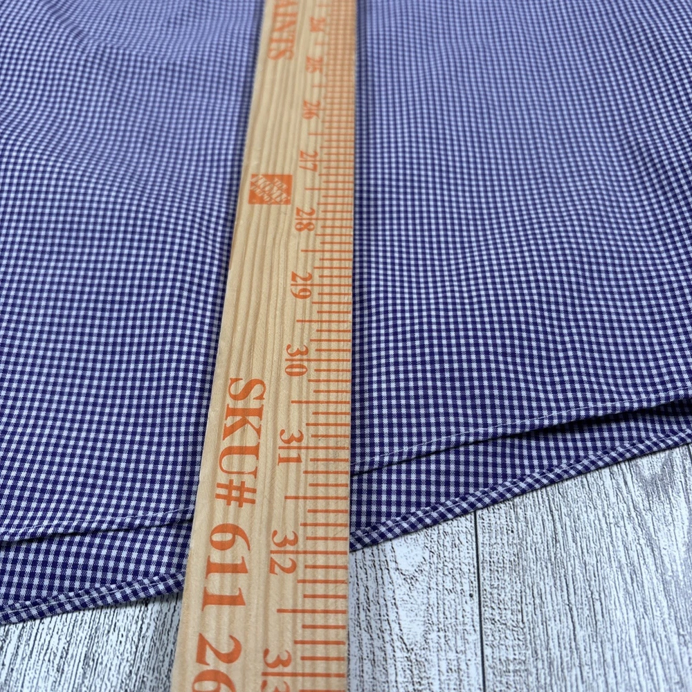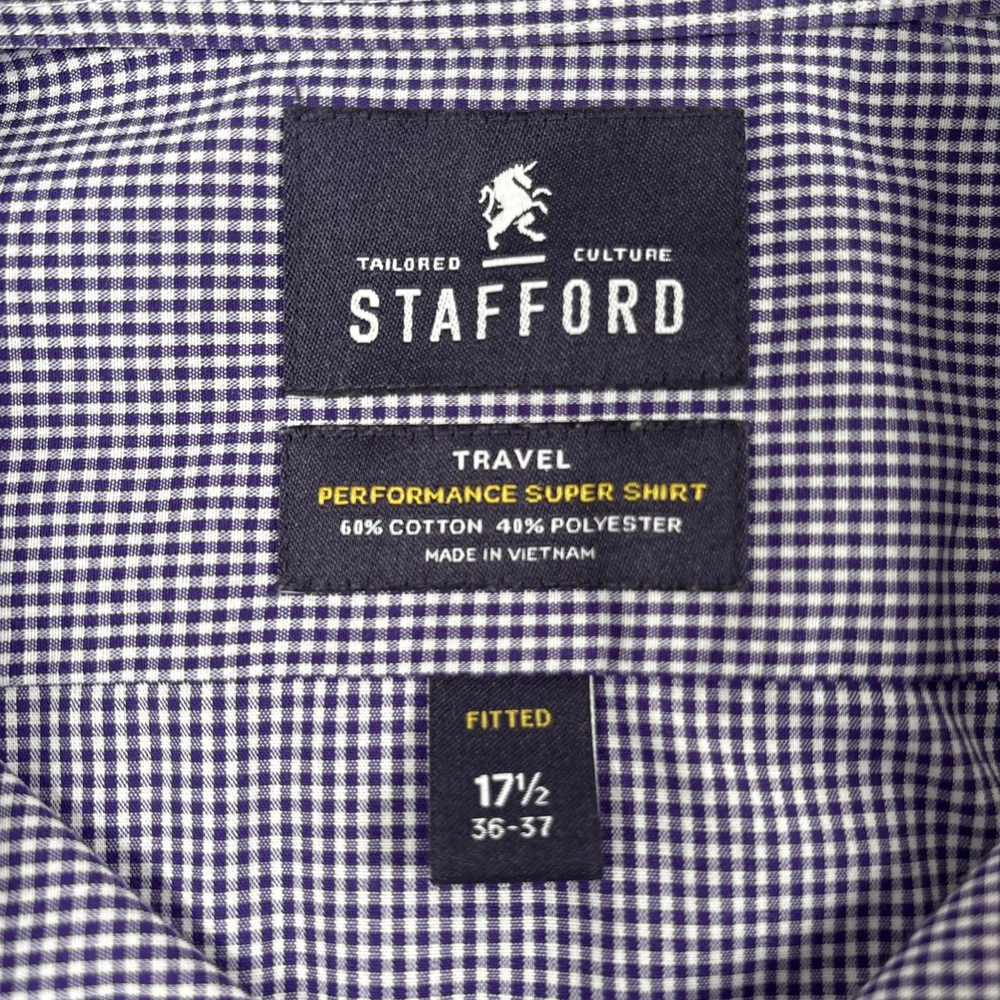 See photos for condition and measurements. Classic Stafford Travel Performance men’s dress shirt in a purple gingham check pattern. Preowned and in excellent condition with no stains, holes, or fabric wear. Features wrinkle‑resistant fabric, and a comfortable performance stretch blend. Perfect for office, business casual, or travel.