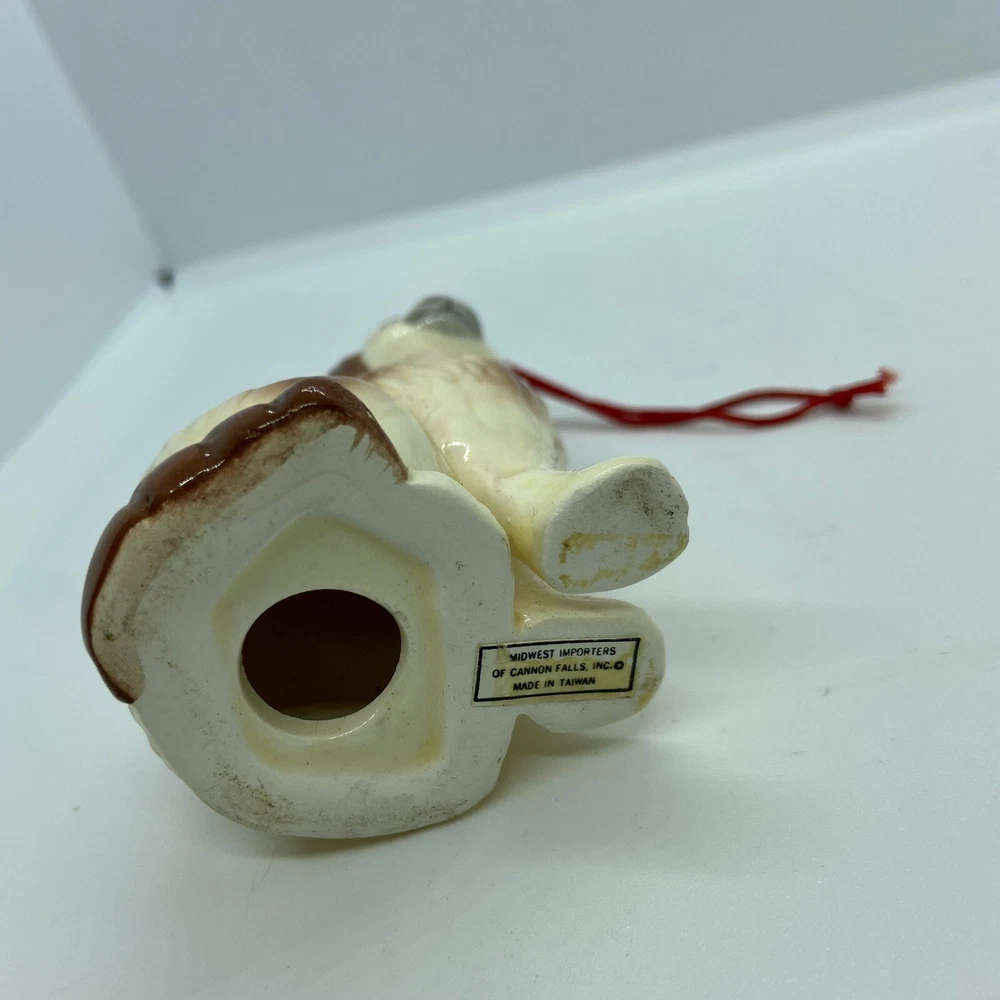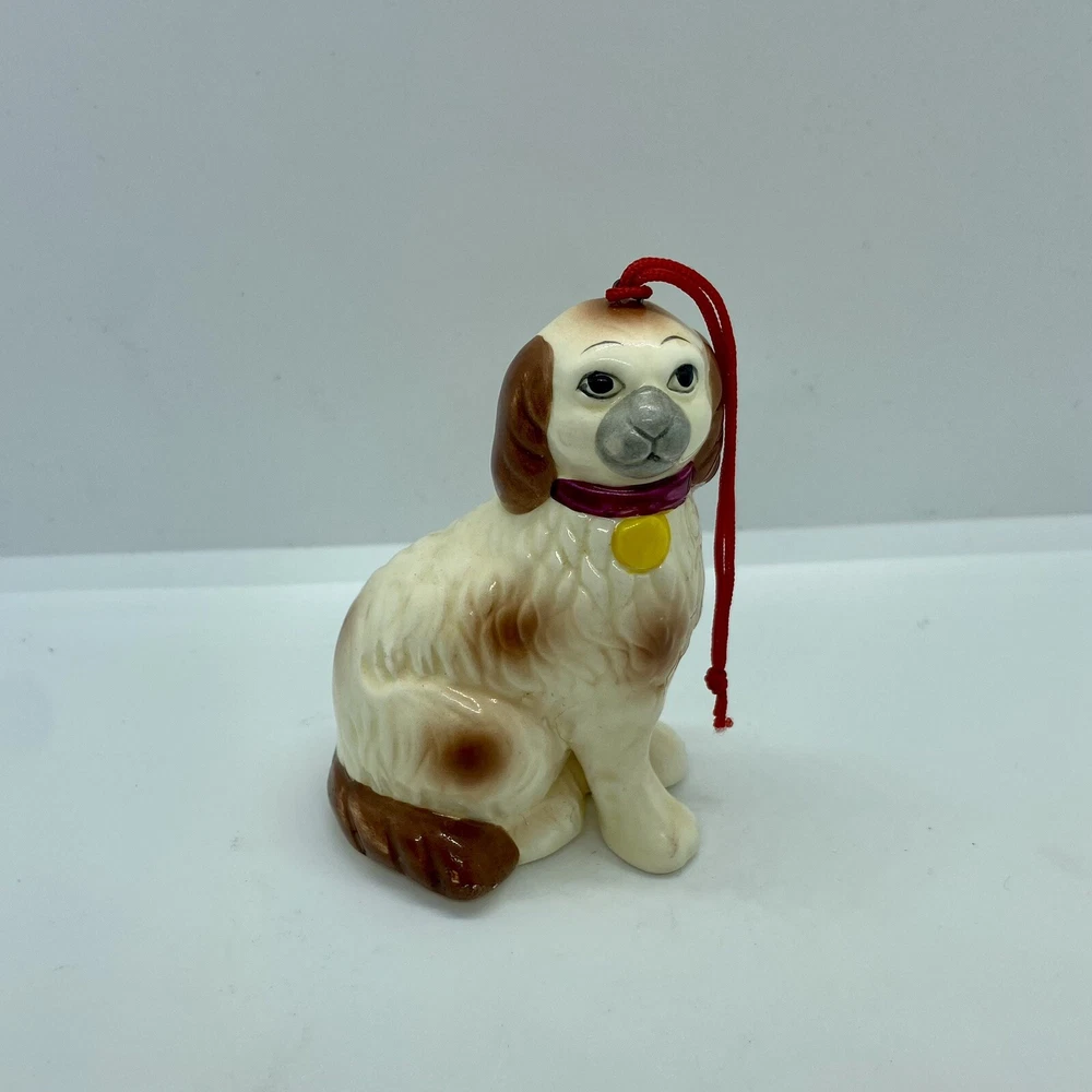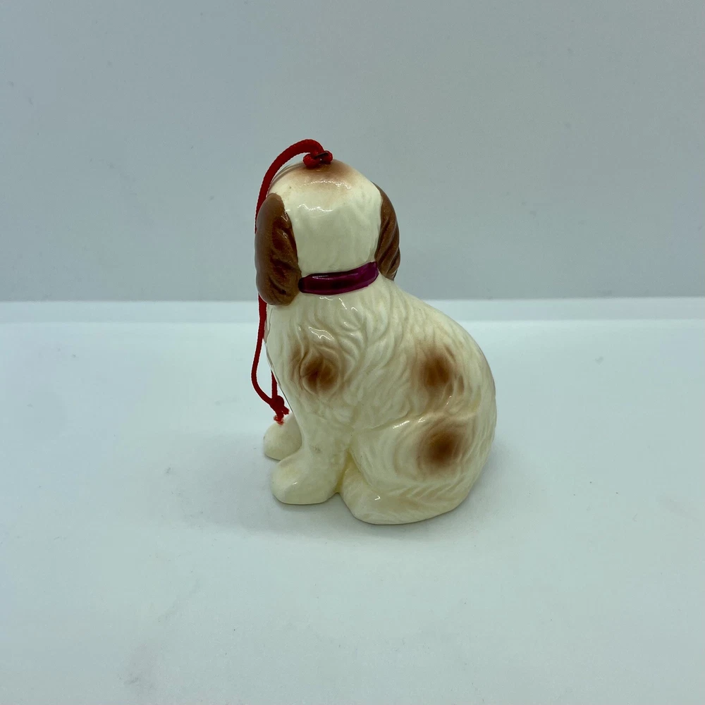 Staffordshire Style Dog Christmas Ornament Cavalier King Charles White and Rust. In good pre owned condition. A hairline crack is pictured. See photos for details.