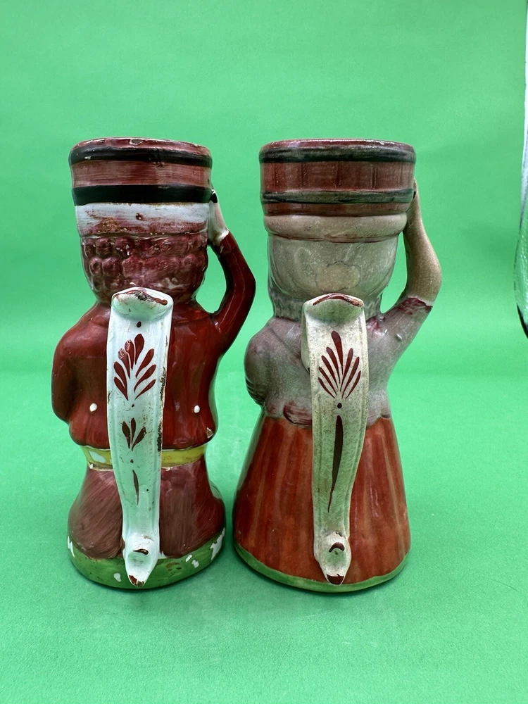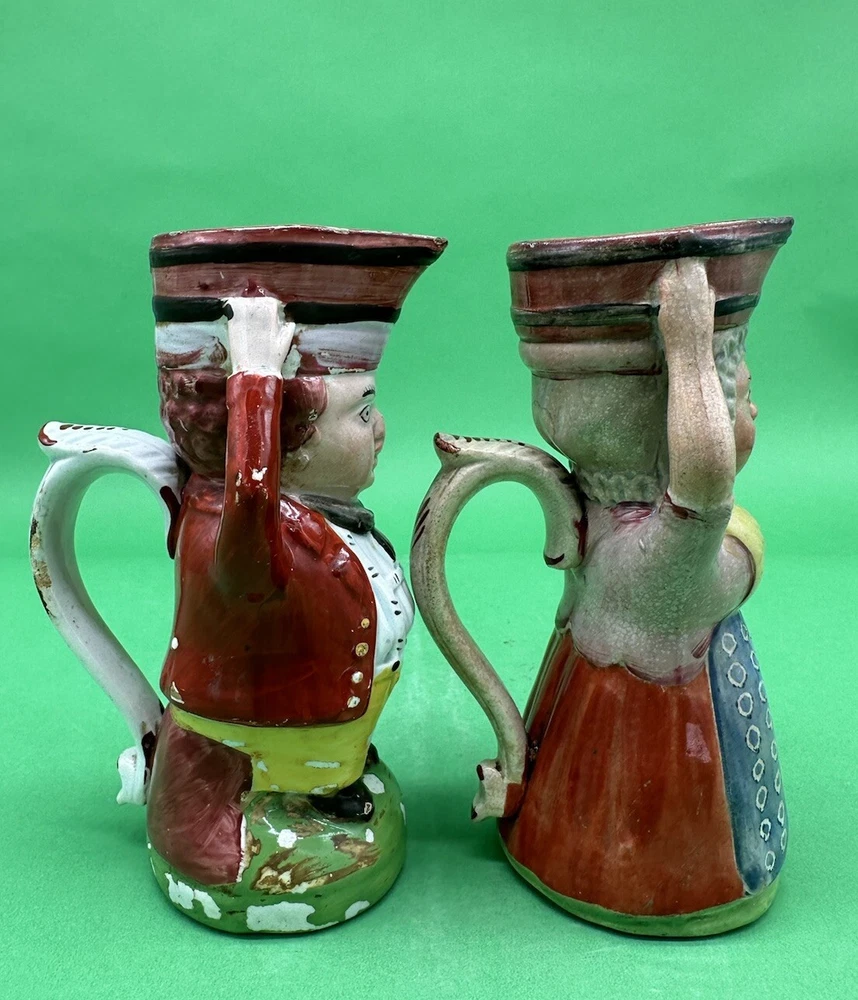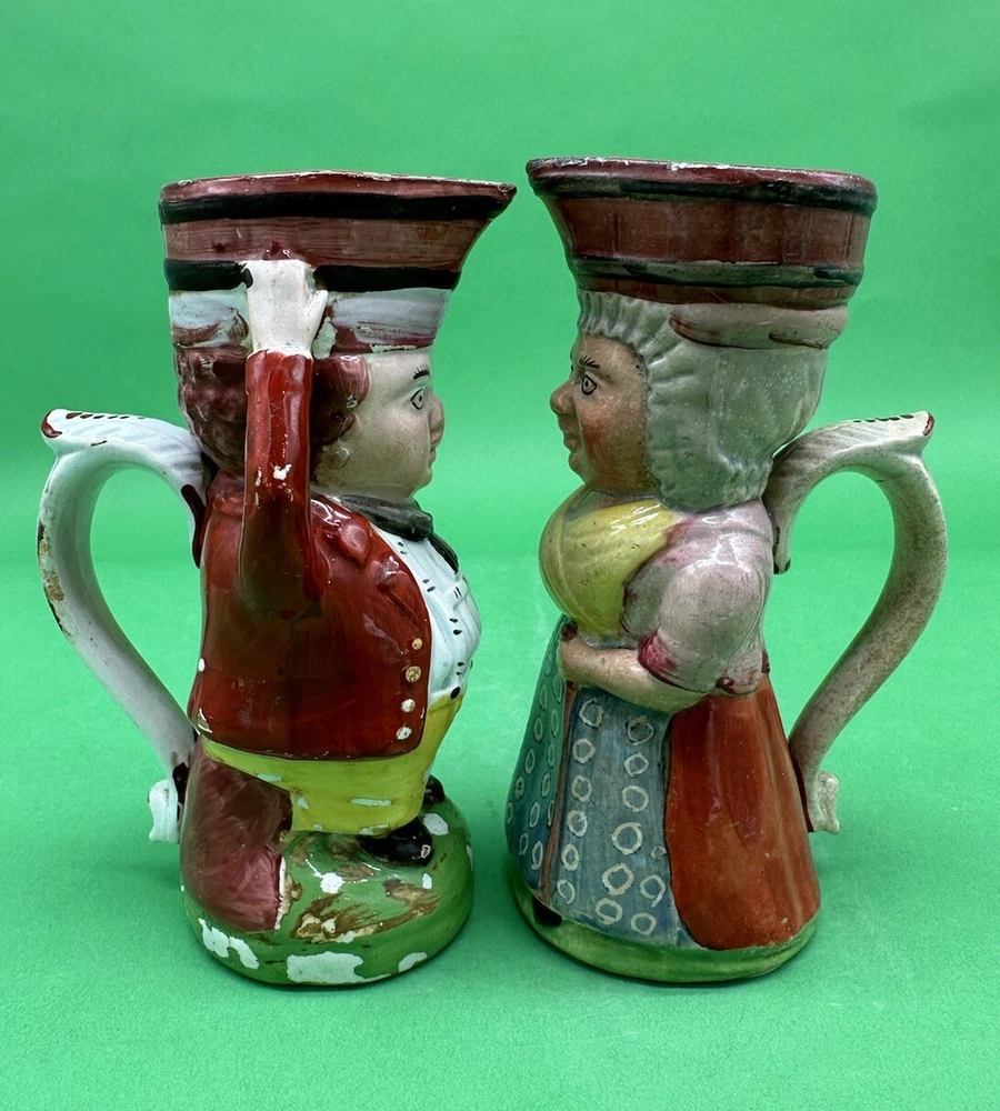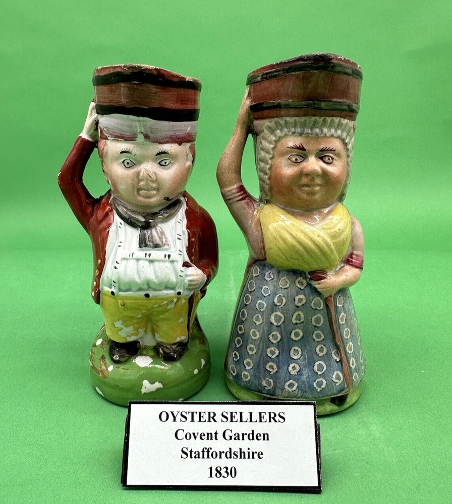 Staffordshire Covent Garden Oyster Sellers Pair of Toby Jugs c.1830 Height: 5.5" Darling Male & Female Pair of Oyster Seller toby jugs produced in Staffordshire England circa 1830. The Oyster Seller was one of the many street vendors common throughout England in the 1800s especially Covent Garden. She is dress in the common garb of the day and is carrying a basket on her head with the oysters. We offer combined shipping discounts on multiple purchases. Your new favorite tiny Tobies will be securely wrapped and packed, and a full guarantee is given on all sales. *British Collectibles is owned and operated by The American Toby Jug Museum Curator Kevin Pearson of Kevin Francis Ceramics . Please check out the rest of our shop's Toby & Character Jugs, Majolica Pitchers, Royal Bayreuth, Banksy Street Art and Kevin Francis Face Pots. If you have any further questions please do not hesitate to ask. Cheers!