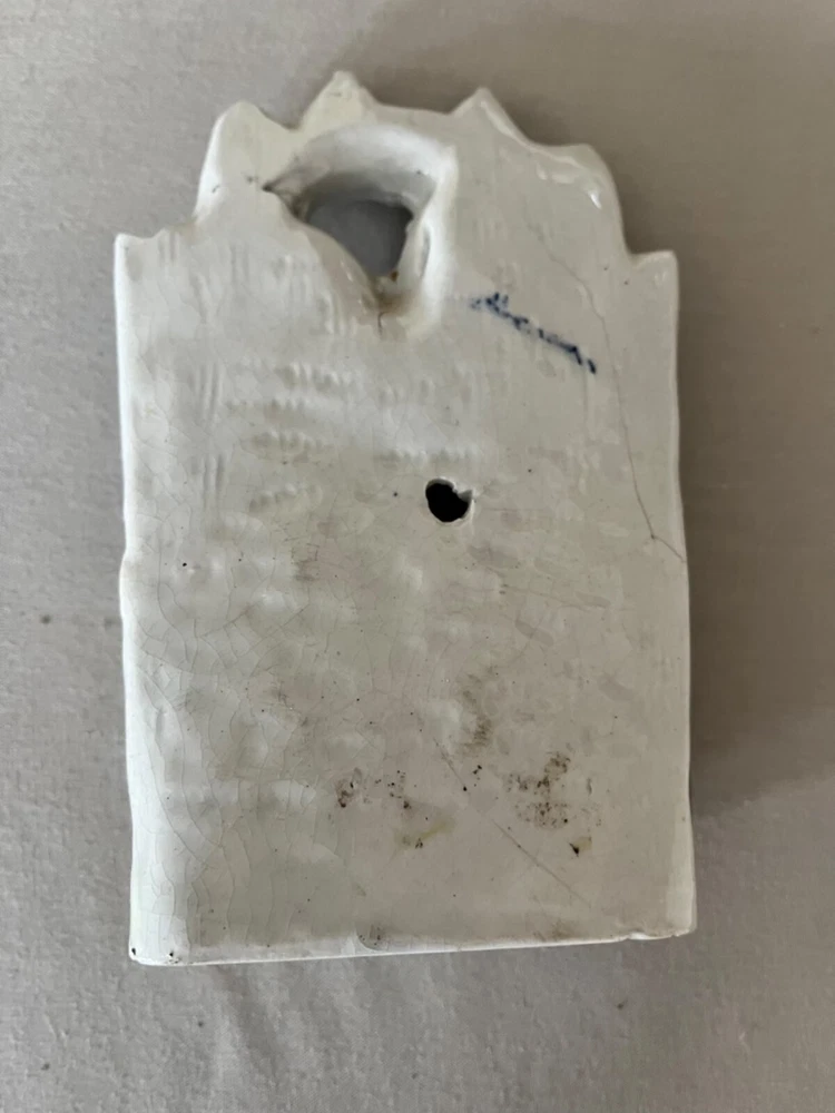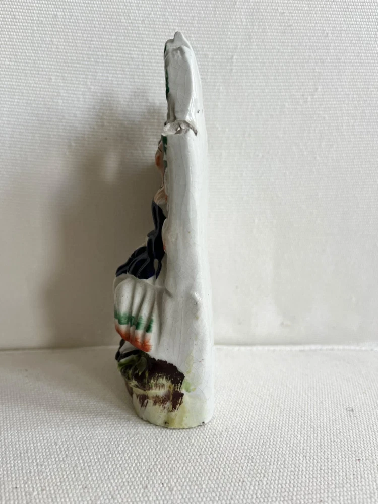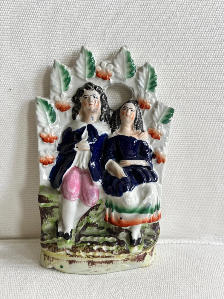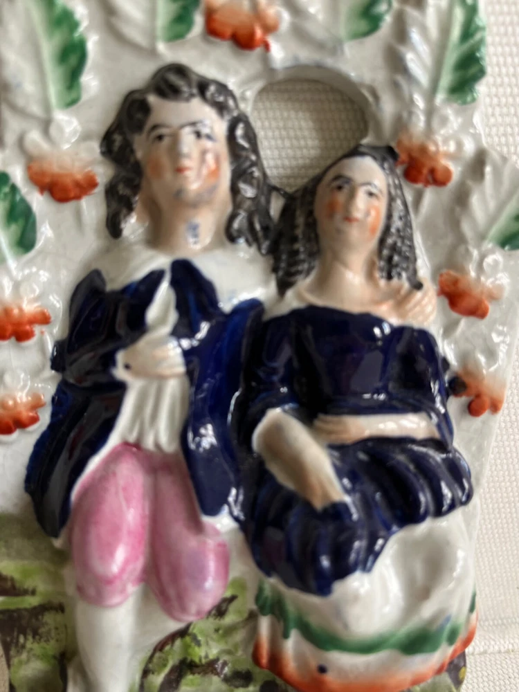 Staffordshire figures of man and woman on bench, 6" x 4", notice missing right leaf tip