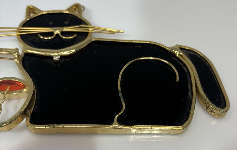 This Stained Glass Art Cat with Goldfish Bowl Decoration Sun Catcher is a small, multicolored piece made from glass that adds a touch of whimsy to any room. The glossy finish and intricate design featuring a cat and goldfish bowl make it a charming decoration for teens, adults, and kids alike. To clean, simply wipe with a damp cloth. Perfect for hanging in any room, this suncatcher brings a unique and artistic flair to your home décor. This has some corrosion see pictures.