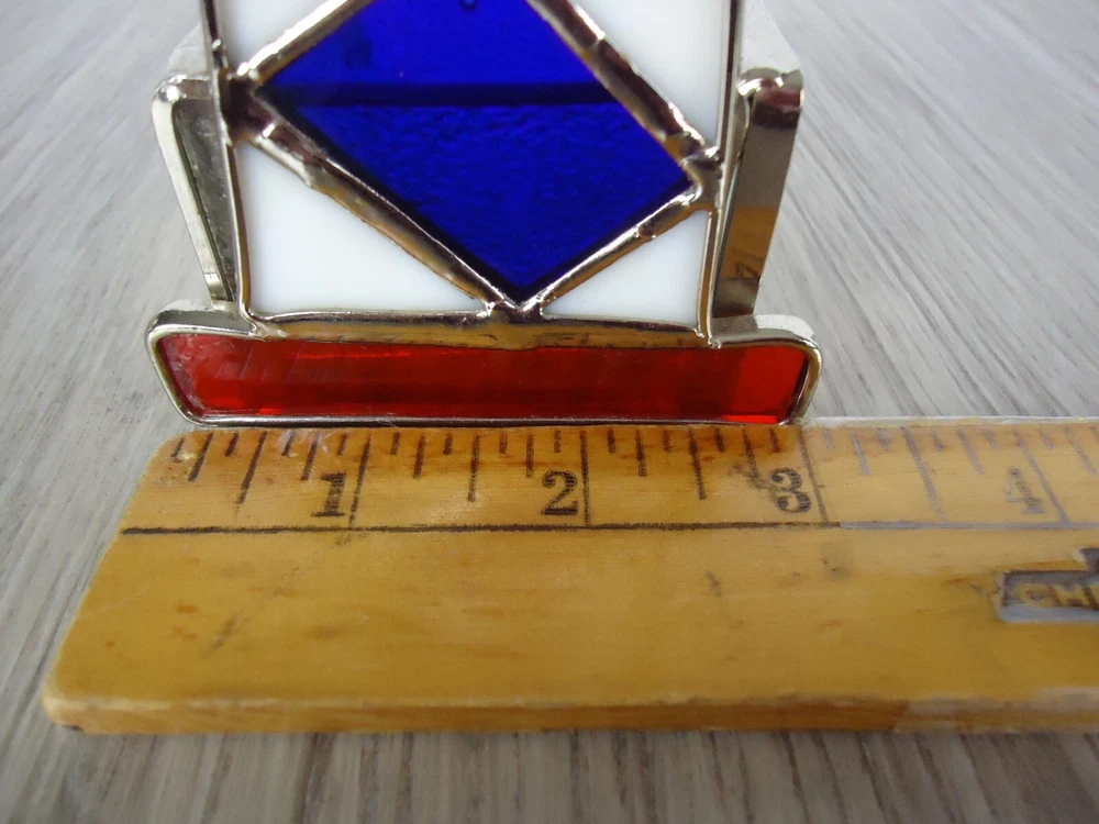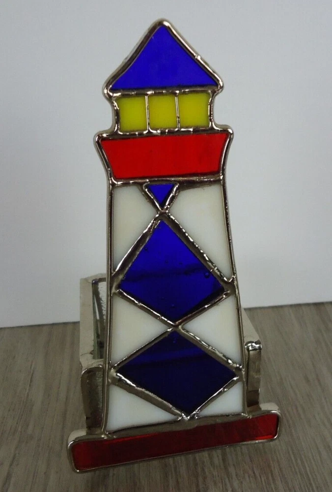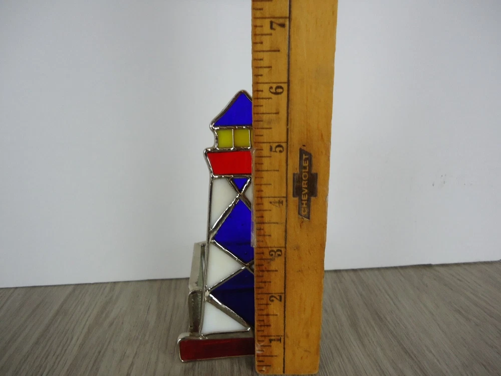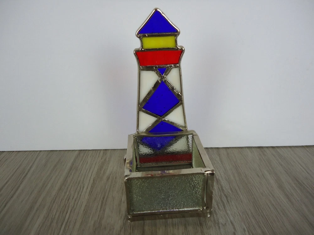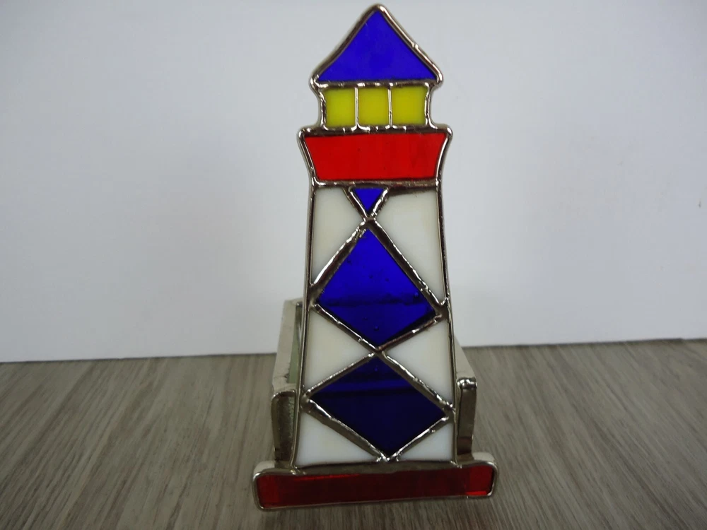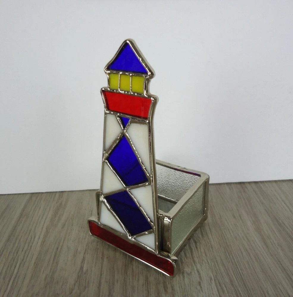 Country/Region of Manufacture: Unknown Theme: Nautical, Lighthouse, Beach, Ocean, Coastal, BOHO, VTG, Handmade, Handycraft, Art Glass Occasion: All Occasions Room: Any Room Suitable For: Furniture, Mini Candle Brand: Unbranded Care Instructions: Clean with Damp Cloth Features: Tabletop Finish: Stained Item Width: 3 in Size: Small Style: Nautical/Lighthouse/Beach/Ocean/Coastal Character Family: Lighthouse Character: Light House Original/Reproduction: Original Packaging: Unboxed Number in Pack: 1 Handmade: Yes Antique: No Item Height: 5.75 in Customized: No Subject: Lighthouse Color: Red, White, Blue Type: Candle Holder Engraved: No Material: Stained Glass Shape: Abstract Pattern: Lighthouse