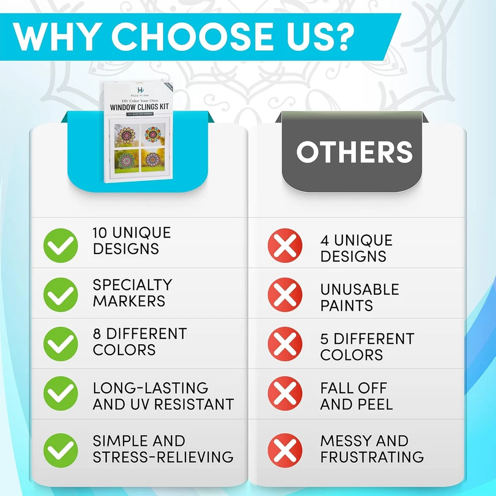 【10 Unique Clings & 8 Colors】These specialty arts and crafts kits for adults and teens include 10 Blank Window Cling Vinyls for you to color (with 10 Unique Designs), 8 Upgraded Specialty Markers (with 8 Different Colors) and a Manual with Coloring Guides for inspiration. We have included everything you need in these DIY kits to enjoy a calming, stress-relieving coloring experience and create a stunning stained glass style end product to boot! 【New and Upgraded Markers】Our new fine tip custom markers have been selected to ensure that even complete beginners can relax and enjoy this kit fully! No more streaking: beautiful, bright colors only! There is nothing more frustrating than the useless bottles of paint that come with similar kits, especially when this is supposed to be stress-relieving.. Running colors, endless drying times, colors that crack and peel off, dried in bottles, stains and huge messes? No, thank you! 【Reduce Stress and Anxiety】Sit back and unwind while creating something beautiful! The mental and psychological benefits of coloring are well-known, including not just stress-relief, but also improved motor skills, vision, sleep and focus. But why just color in a book when you could color these stunning suncatchers instead? Dress up any mirror or window with your gorgeous finished mandalas, or gift your unique handmade window clings to your loved ones and spread the joy! 【Easy to Remove & Sticks to All Windows】Our vinyls are made only of the highest quality materials, to ensure that they are easy to put up and remove, washable, UV-resistant and built to last. The finished window clings can be applied easily to any glass or mirror surface - make sure to check out our photos and video for application tips! Your stunning creations will catch the sun and sparkle in gorgeous colors like mosaics or gallery glass, filling you with pride at every glance! 【The Perfect Gift】This kit is the perfect unique gift for that crafty person in your life, whatever their age (children 6+ years to seniors)! Whether you’re searching for a present for Mother’s Day, a Birthday, Christmas, are looking for an ideal activity for Women’s Club or to ensure some quality inter-generational bonding time with your elderly loved ones or your tweens, our kit is for you! Product Description