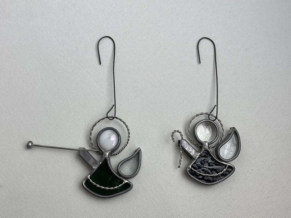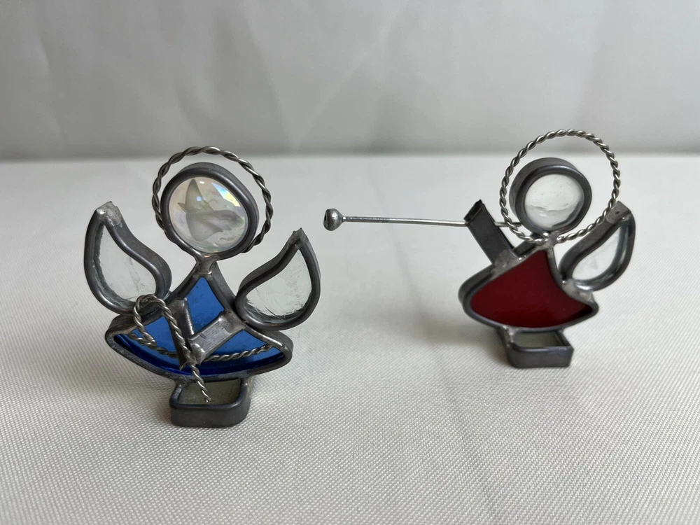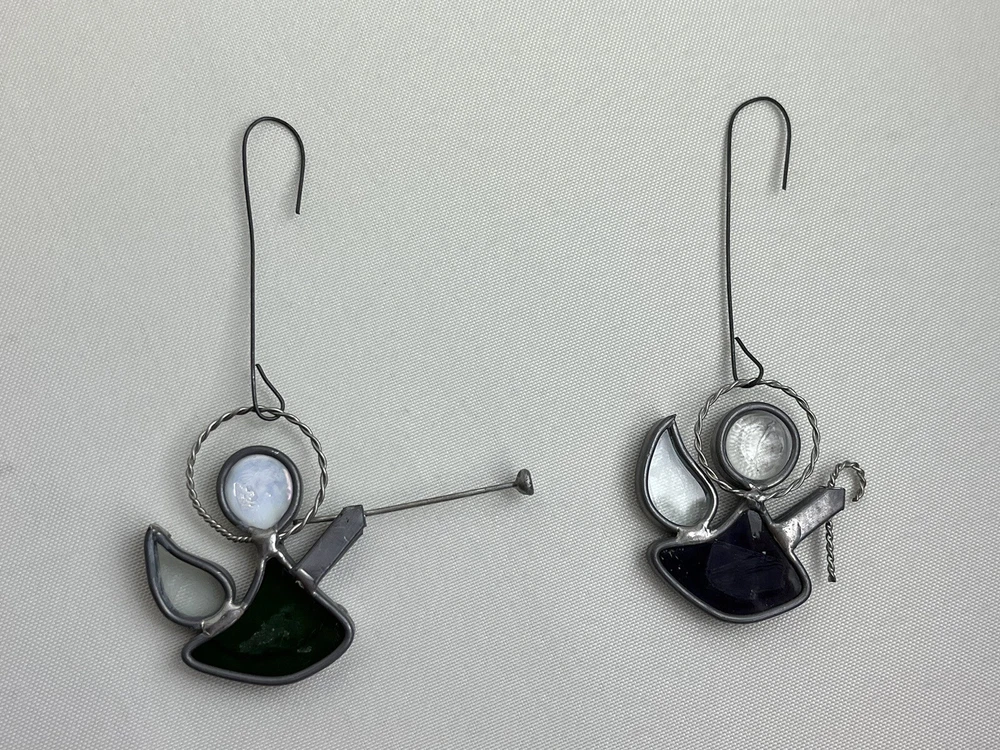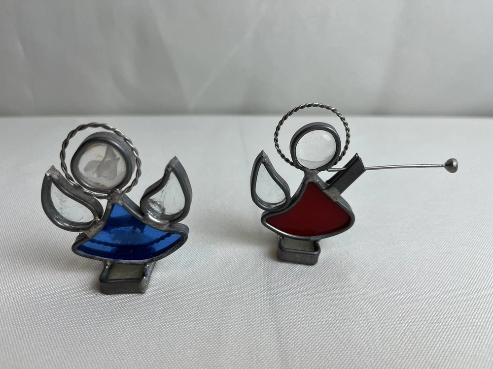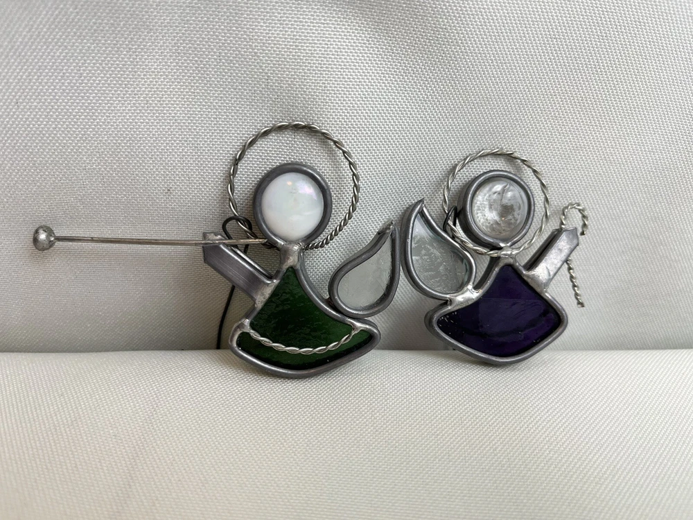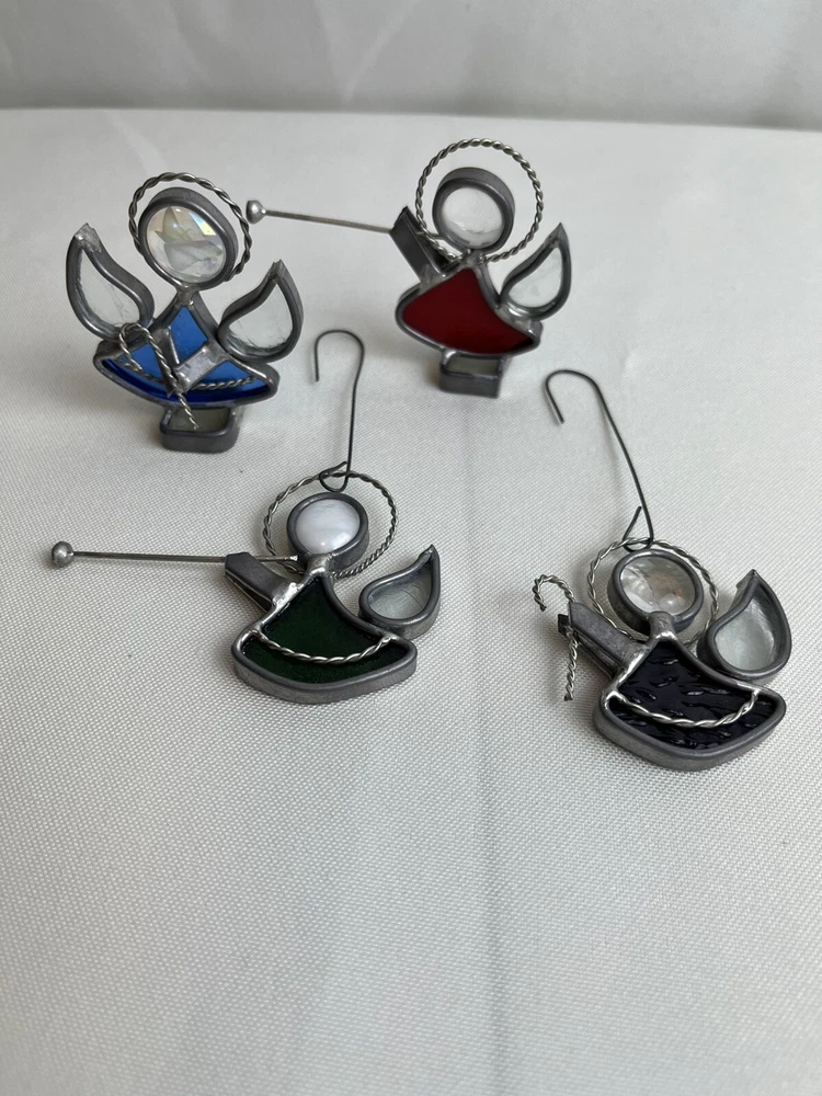 Stained Glass & Metal Angel Ornaments - Lot of 4. Purple & green hanging angels. Blue & red free standing.