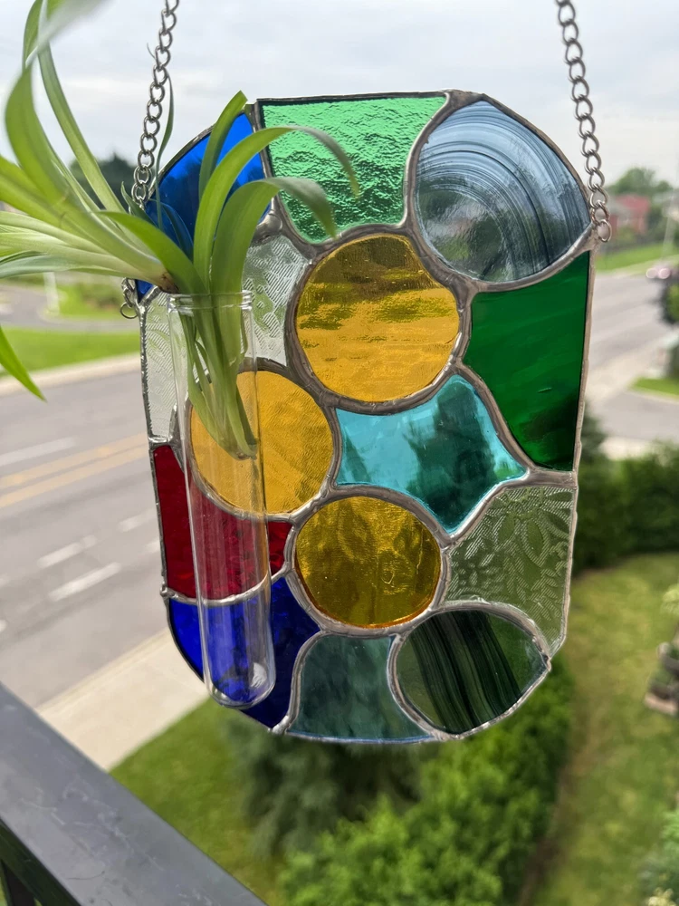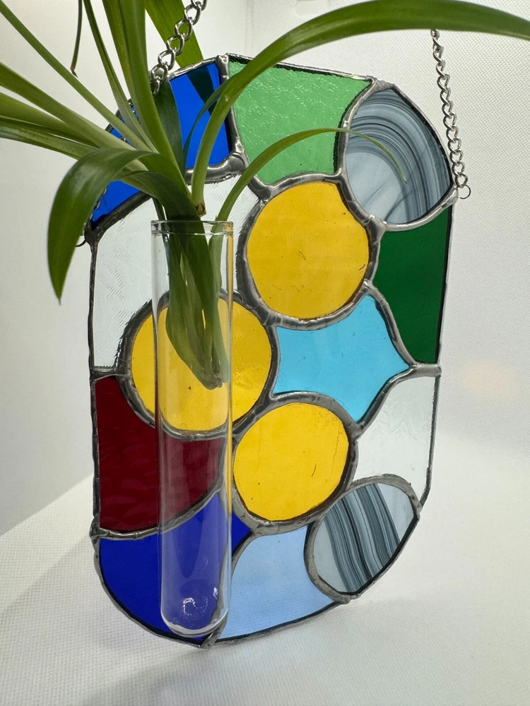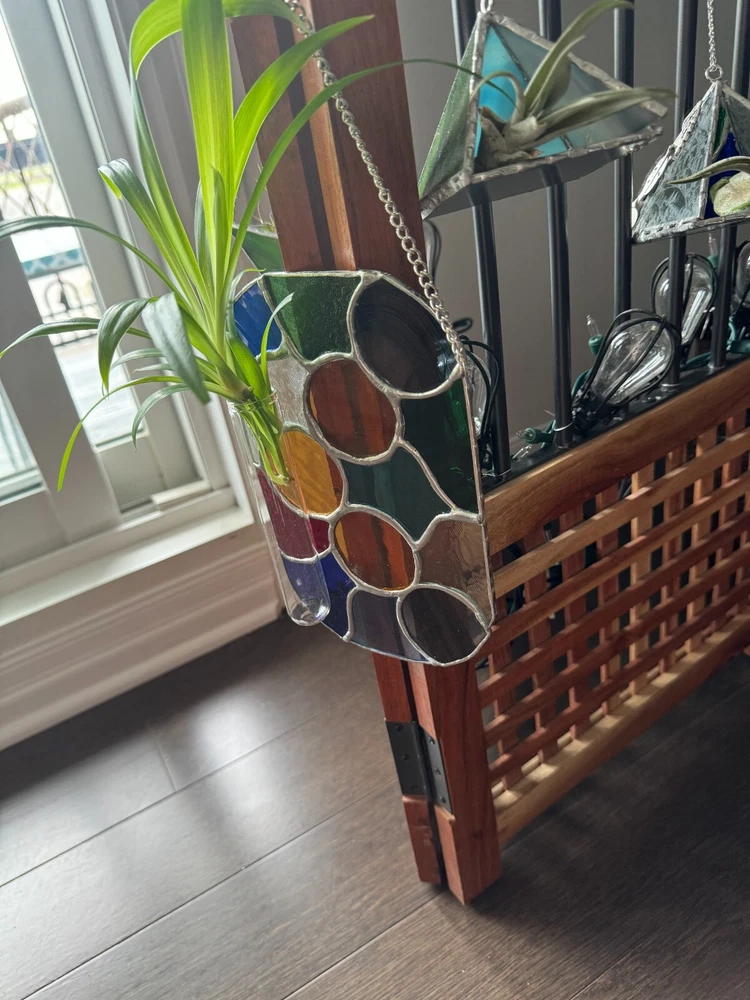 Enhance your living space with this stunning Stained Glass Tiffany Abstract Handmade Panel. Handcrafted in Canada, this large suncatcher features a vibrant multicolour design with intricate cuttings that create a beautiful abstract pattern. Made from high-quality stained glass, this suncatcher has a shiny finish that adds a touch of elegance to any room. Perfect for adding a pop of color and style to your home decor, this unique piece is sure to be a conversation starter.Ideal for those who appreciate handmade craftsmanship and unique home accessories, this suncatcher is a true work of art. Bring a touch of creativity and sophistication into your home with this one-of-a-kind stained glass piece, showcasing a blend of traditional Tiffany style with a modern twist. Perfect for hanging in a sunny window or as a decorative accent on any wall, this suncatcher will brighten up your space and infuse it with charm and personality. Measurements are approximate: W 5.5" x H 8.5". 14 cm x 22 cm. Chain. 15" 38 cm