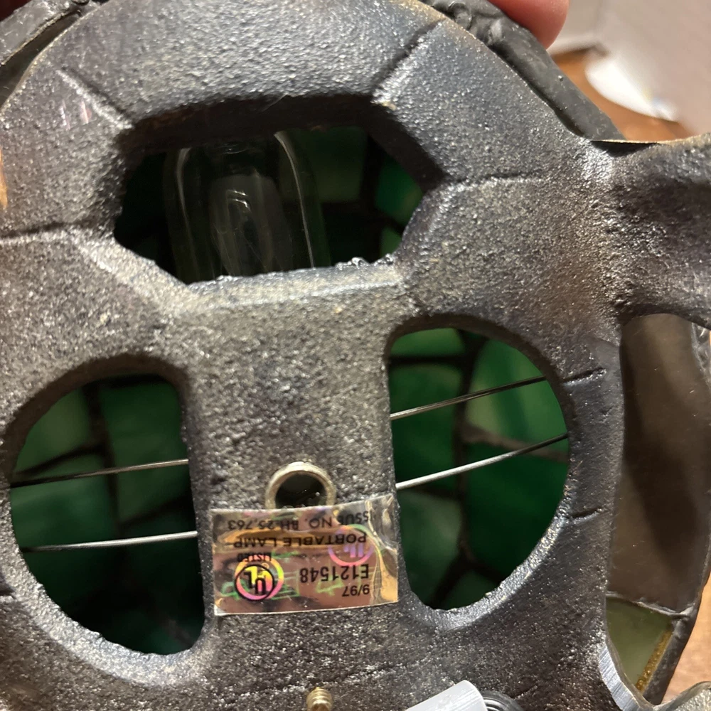 Shade Shape: Oval gtin13: Does not apply Type: Table Lamp UPC: Does not apply Cord Color: Black Light Color: Clear Material: Metal, Stained Glass Power Source: Corded Electric Vintage: Yes Control Style: Rotary Knob Finish: Antique Brass Color: Green Style: Art Deco Design: Stained Glass Brand: Unbranded Sensor Type: Light
