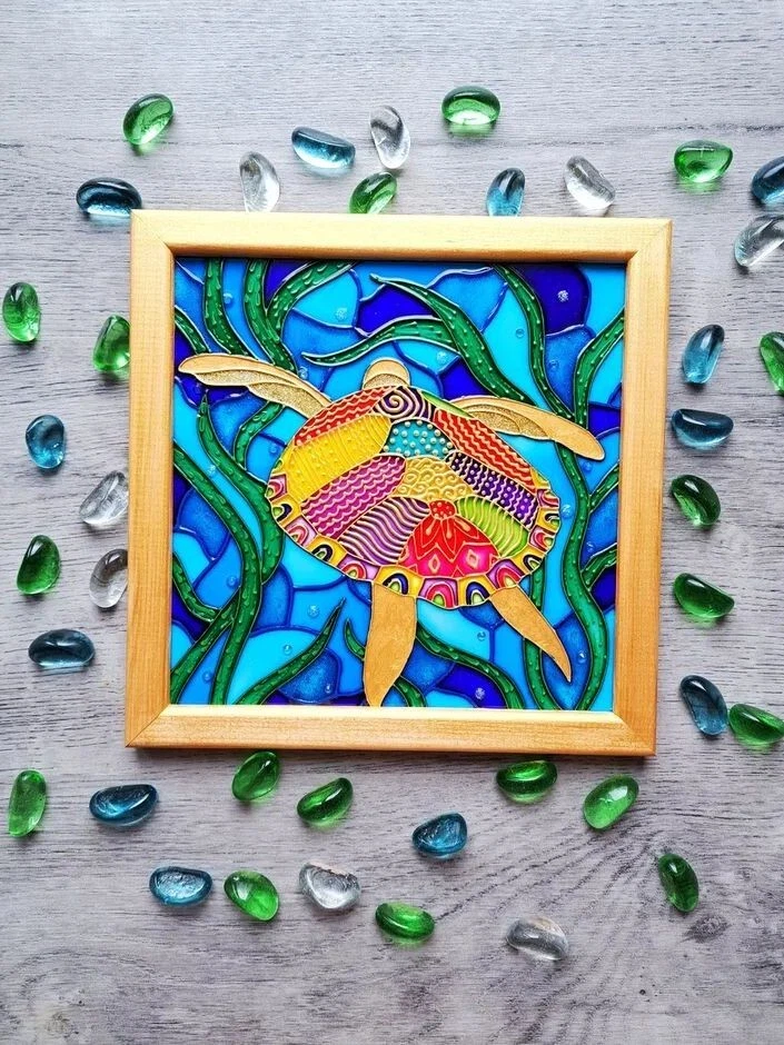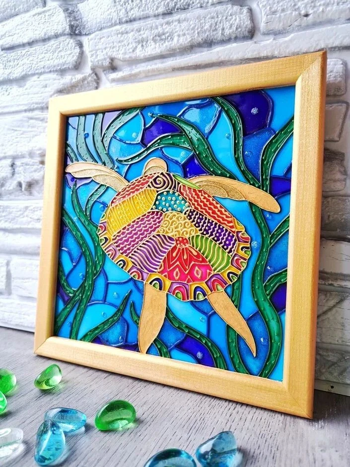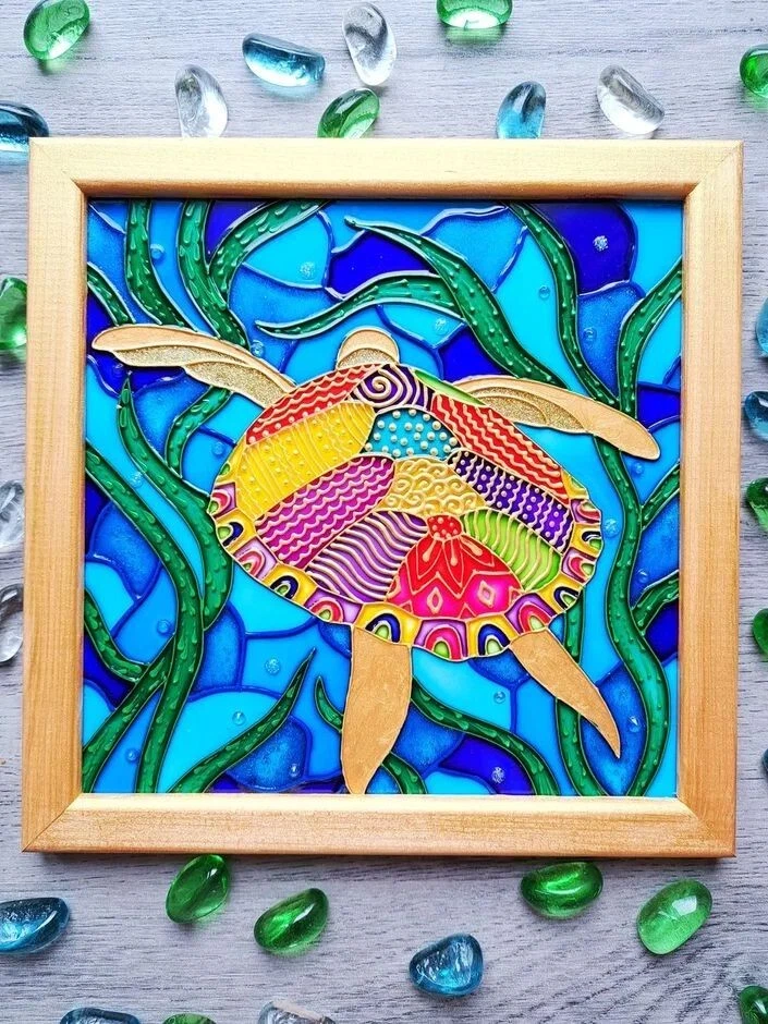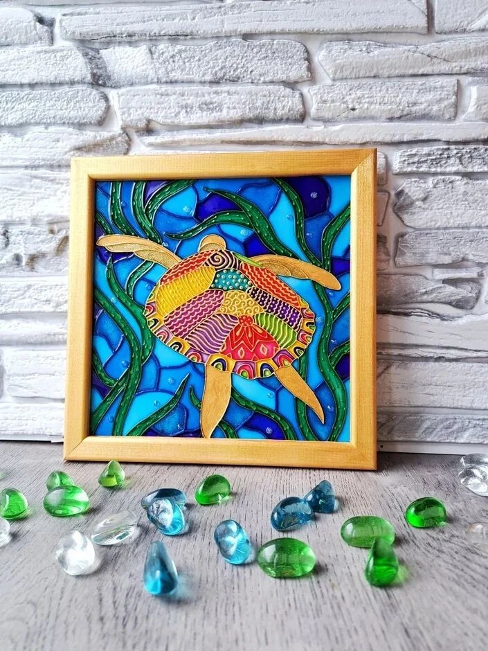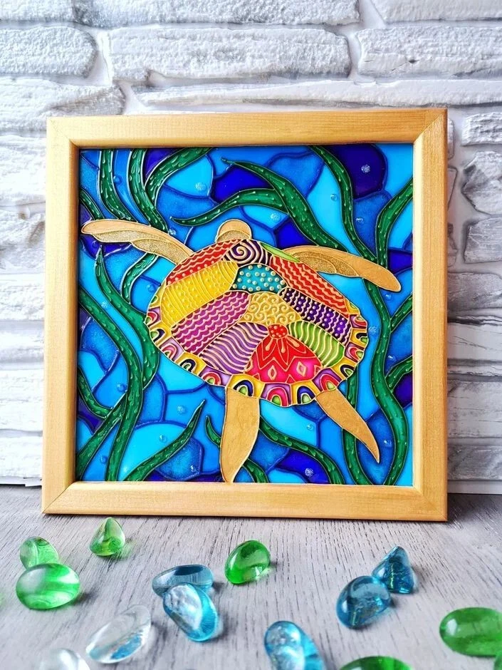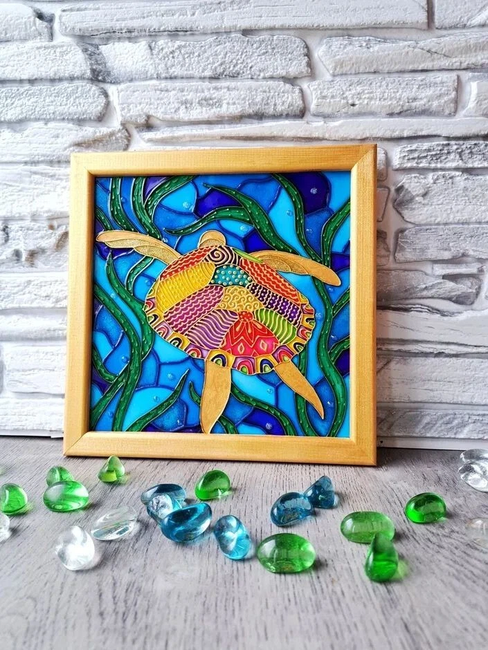 This beautiful piece of art is a unique addition to your home decor. It features a stunning rainbow turtle with intricate details, made from high-quality stained glass. The colorful design brings the ocean life into your room, providing a relaxing atmosphere. This suncatcher is hand-painted and has a contemporary original production style. It is perfect for collectors of decorative pottery and glassware. The material is durable, ensuring that it lasts for many years. Add this eye-catching piece to your collection or give it as a gift to a loved one. Original Rainbow turtle painting on glass A good idea to give a touch of modern taste to your home, living room, kitchen, bedroom or office…perfect gifts for your relatives and friends *Title: Rainbow turtle *Size Painting: 8"x8" (20x20 cm) (On request I can paint this subject in other sizes. Please, contact me) *Original handmade stained glass painting *Style: Modern, Abstract *Fast Shipping