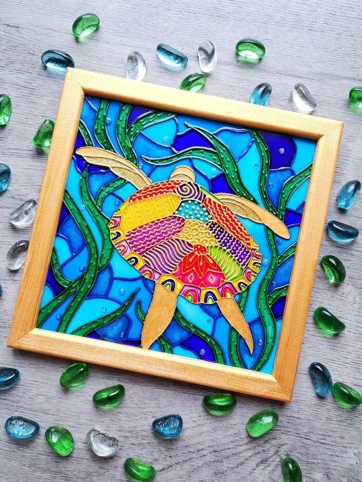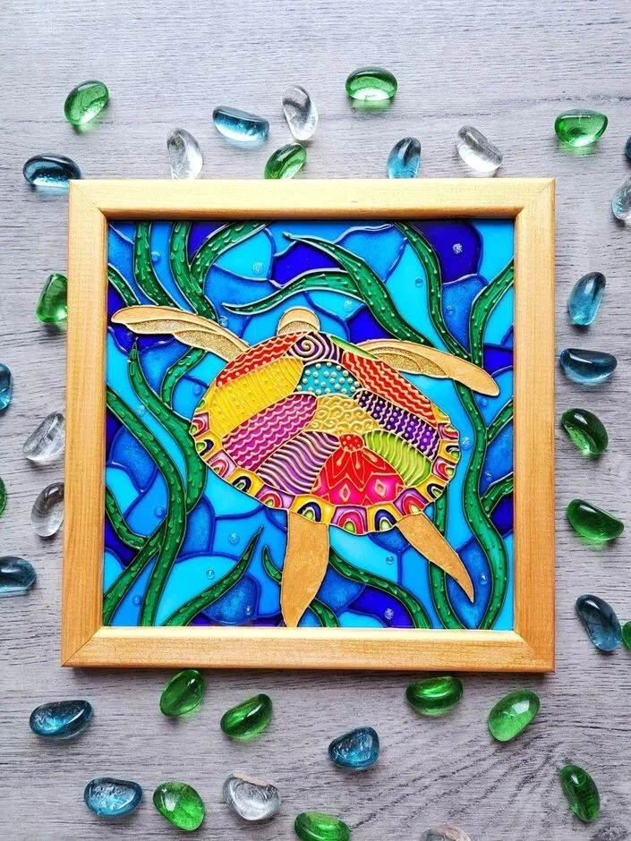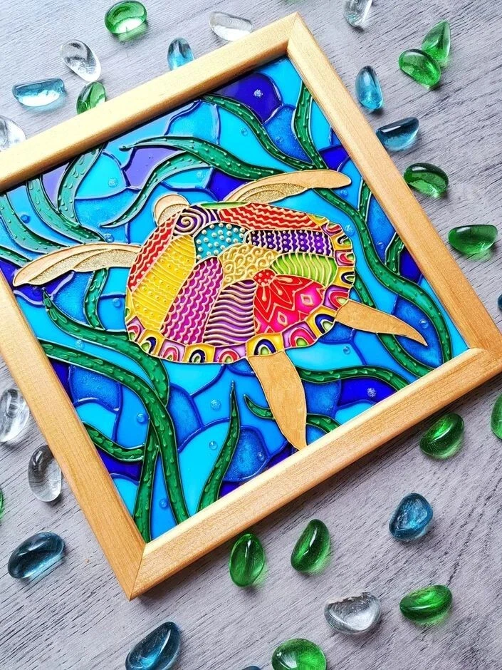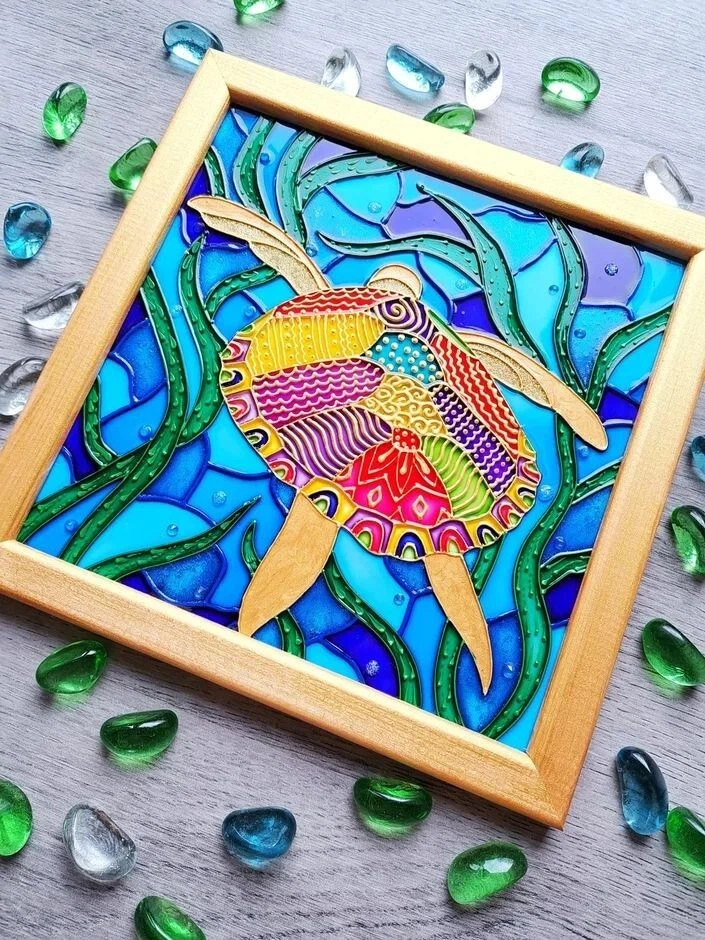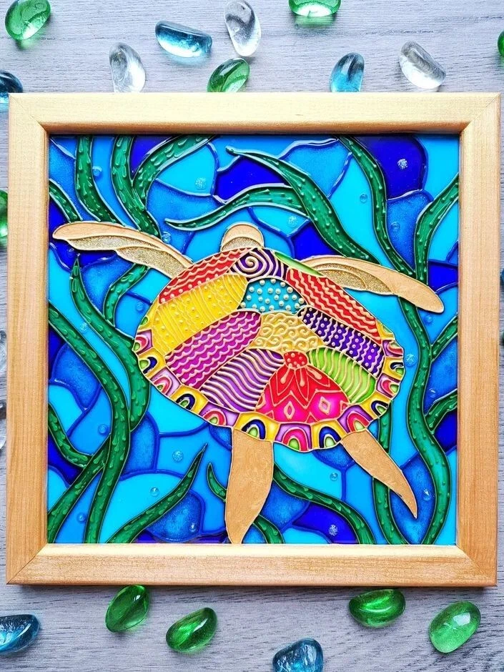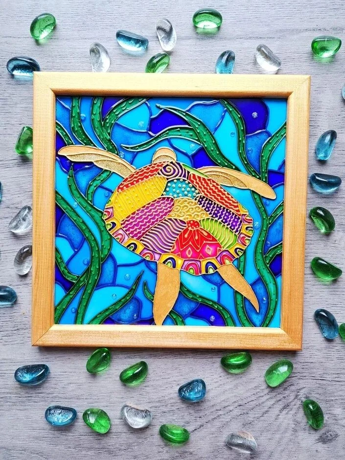 This beautiful piece of art is a unique addition to your home decor. It features a stunning rainbow turtle with intricate details, made from high-quality stained glass. The colorful design brings the ocean life into your room, providing a relaxing atmosphere. This suncatcher is hand-painted and has a contemporary original production style. It is perfect for collectors of decorative pottery and glassware. The material is durable, ensuring that it lasts for many years. Add this eye-catching piece to your collection or give it as a gift to a loved one. Original Rainbow turtle painting on glass A good idea to give a touch of modern taste to your home, living room, kitchen, bedroom or office…perfect gifts for your relatives and friends *Title: Rainbow turtle *Size Painting: 8"x8" (20x20 cm) (On request I can paint this subject in other sizes. Please, contact me) *Original handmade stained glass painting *Style: Modern, Abstract *Fast Shipping