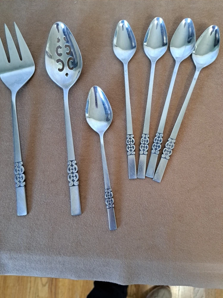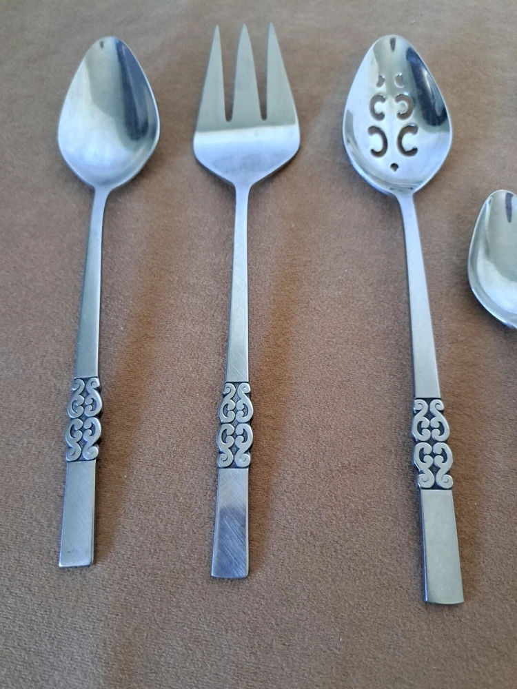 International Deluxe Stainless Serving Ware Silverware Serving spoon 9 inch, slotted serving spoon 9 inch, serving fork 9 inch, 4 parfait spoons 7.5 inch, 1 spoon 6.5 inch. Scroll design, see pics.