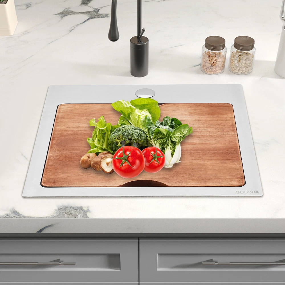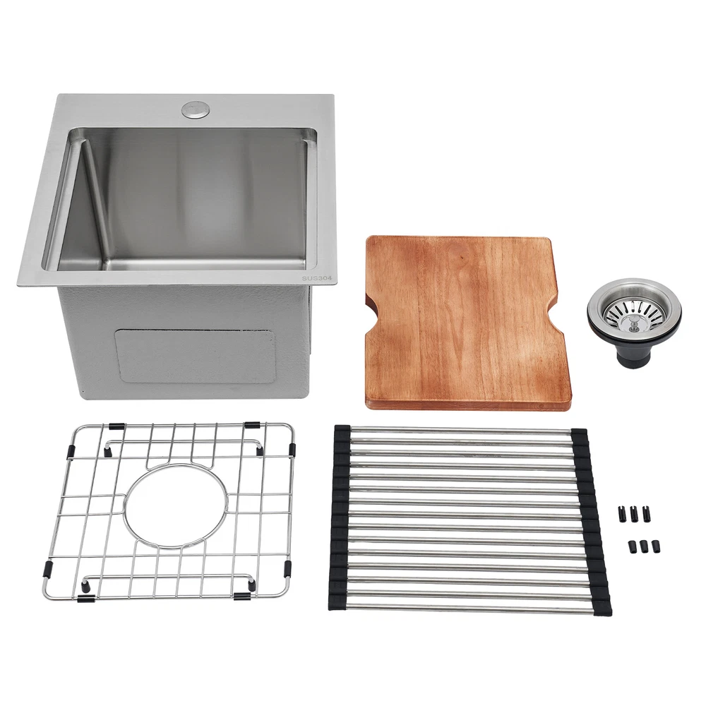 Specification Material: 304 Stainless Steel Color: Silver Style: Modern Process: Brushed Shape: Rectangular Mount Type: Topmount, Undermount, Flushmount Assembly Required: Yes Thickness: 100mm/0.39in Drain Hole Diameter: 8.9cm/3.5in Cutting Board Size: 33*28cm/13*11in Product Size: 38.1*38.1*24.5cm/15*15*9.6in Package Size: 43*43*27cm/16.93*16.93*10.63in Gross Weight: 8kg/17.64lbs Net Weight: 7.5kg/16.53lbs Package Included 1* Stainless Steel Kitchen Sink 1* Cutting Board 1* Bottom Rinse Grid 1* Strainer 1* Roll-up Dish Drying Rack All Accessories for Use Stainless Steel Drop-in Bar Sink Topmount Kitchen Sink Single Bowl 15 x 15 Inch Description Made of high-quality 304 stainless steel, this kitchen sink is exquisitely crafted, wear- resistant , and corrosion- resistant . Its enlarged and deepened sink not only alleviates the splashing problem but also increases space utilization for cleaning numerous cookwares. The design with a cutting board, bottom rinse grid, and roll-up dish drying rack allows you to wash and cut fruits and vegetables simultaneously, with which you can enjoy a more convenient life. Key Features Strong and Durable: Made of premium 304 stainless steel through the brushed process, it is corrosion and heat- resistant and will remain as good as new for a long time, even in the face of frequent daily use and all kinds of kitchen utensils collision. Space Optimization: The workstation sink is designed to hold the cutting board on a single track, maximizing the available space on the countertop. Large Capacity: Its large washing size ( 13*11in ) allows you to clean large amounts of plates, dishes, and pots, and wash fruits, and vegetables at one time without splashing, saving time. Life Assistant: This sink with a cutting board, bottom rinse grid, and roll-up dish drying rack cleverly combines washing and meal preparation functions, allowing you to enjoy a convenient life. Invisible and Beautiful: It supports three mount types: top mount, flush mount, and under mount, which will not affect the aesthetics when the sink is flush with the countertop, and the smooth lines and low-key silver-colored appearance can also add a touch of simplicity and elegance to the kitchen. Hassle-free Cleaning: The brushed surface is not easy to leave marks, you can remove surface dust and grease by wiping with a damp cloth and detergent (not included). User Friendly: The rubber mute mat can effectively reduce the noise generated by the faucet water release and the collision of dishes, creating a quiet kitchen environment. The anti-condensation coating effectively prevents excessive temperature differences and protects the cabinet from moisture. Rapid Drainage: The X-shaped water guidelines and enlarged 3.5-inch drain hole help drain water quickly. Customer Service: We aim to provide quality products and services. If you have any problems, please feel free to contact us. We will reply to you and solve the problem for you as soon as possible. Details Rounded Corners: They are not easy to leave hygiene blind spots, making it convenient for you to clean the sink. Bottom Rinse Grid: With protective covers, it can prevent scratches on the kitchen utensils and sink. Utensils can be placed on the rinse grid for fast drainage. Roll-up Dish Drying Rack: It facilitates you to quickly clean your cookware and drain the bowl quickly to prevent bacteria growth. Thoughtful Handles: Two curved handles on either side of the cutting board make it easy to reach and move. Application It can be widely used in homes, restaurants, laundries, basements, bars, kitchens, food trucks, dessert stores, coffee shops, hotels, garages, gardens, etc. for washing dishes and cutting vegetables and fruits. Specification Material: 304 Stainless Steel Color: Silver Style: Modern Process: Brushed Shape: Rectangular Mount Type: Topmount, Undermount, Flushmount Assembly Required: Yes Thickness: 100mm/0.39in Drain Hole Diameter: 8.9cm/3.5in Cutting Board Size: 33*28cm/13*11in Product Size: 38.1*38.1*24.5cm/15*15*9.6in Package Size: 43*43*27cm/16.93*16.93*10.63in Gross Weight: 8kg/17.64lbs Net Weight: 7.5kg/16.53lbs Package Included 1* Stainless Steel Kitchen Sink 1* Cutting Board 1* Bottom Rinse Grid 1* Strainer 1* Roll-up Dish Drying Rack All Accessories for Use Notes Please check the style and size before purchasing. Please do not scratch its surface with sharp objects to prolong its service life. If you want to get a better installation effect, we suggest you ask professional workers to install it. Please allow the slight color difference caused by the shooting light and 1-3cm error due to manual measurement and make sure you do not mind before ordering. Payment Delivery details Terms of sales About us Contact us Payment We accept ebay payment 。 Fees such as import duties, taxes are not included in the item price or shipping costs. These charges are the buyer's responsibility. Delivery details Shipping: 2-9 working days to: USA Terms of sales We maintain high standards of excellence and strive for hundred percent customer satisfaction. Feedback is very important to us. We hope that you contact us immediately before you give neutral or negative feedback, so that we can address your concerns. It is impossible to address issues if we do not know about them! About us Your satis faction is our ultimate goal. We work hard to earn your trust and future business. Our certified technicians have tested each item before shipping. The unit comes with 1 year limited warranty on all manufacturing defects. a) If you receive a defective item, you may return it or ask for a discount. Please contact us within 14 days after you receive the package. b) What you returned must be intact and in its original packaging as re? u. Customer is responsible for shipping costs of the returned item. c) We will cover the cost of shipping back t with the shipping rate indicated in the registration page. We will send you a new unit or refund the full payment you pai