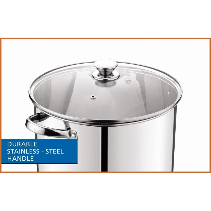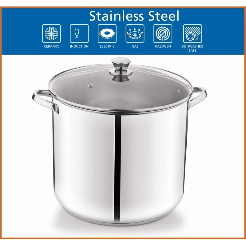 You may also like Stainless Steel 3 Qt Cooking Pot W/ Tri-Ply Base & Straining Lid Saucepan 21.94 USD 23.1 USD Free shipping 5% off 12 Quart Large Enamel-on-Steel Stock Pot Durable New Oven-Safe Kitchen Stockpot 41.43 USD 43.61 USD Free shipping 5% off Stainless Steel 8Qt Multi-Cooker Stock Pot w/Colander Steamer Basket & Glass Lid 26.01 USD 27.38 USD Free shipping 5% off 27.5Qt Aluminum Steamer Pot Ideal for Cooking Tamales Soups Seafood Tray Lid New 31.76 USD 33.43 USD Free shipping 5% off 12-Quart Stainless Steel Stock Pot with Glass Lid for Preparing Amazing Sauces 26.01 USD 27.38 USD Free shipping 5% off Prepare amazing sauces, soups, pastas, and more with the sizable Stainless Steel 20-Quart Stock Pot with Glass Lid. This extra-large stock pot measures 15. 6”L x 12. 4”W x 10. 7”H and is perfect for cooking family meals for any occasion. Constructed with stylish stainless steel and glass, it’s sure to coordinate with your existing cookware. This sturdy stock pot features riveted, stay-cool handles, a transparent glass lid, and an encapsulated bottom for even heat distribution. It’s suitable for all cooktops, including induction, and it’s also dishwasher safe. Ideal for helping you feed your family and friends at get-togethers, backyard barbecues, celebrations, and other special events, the Stainless Steel 20-Quart Stock Pot with Glass Lid is a must-have cookware item in any kitchen. Sizable stock pot is perfect for preparing amazing sauces, soups, pastas, and more Materials: Stainless steel, glass Dimensions: 15. 6”L x 12. 4”W x 10. 7”H Encapsulated bottom for even heat distribution Suitable for all cooktops, including induction Ideal for cooking for family meals or large gatherings for any occasion Features riveted, stay-cool handles and transparent glass lid Weight: 6. 1 lbs Stylish stainless steel and glass construction coordinates with your existing cookware Dishwasher safe. Wash before first use. Do not boil dry. Do not use cookware on high heat or high flames; use medium or lower heat settings. Match base of pan to stove burner size. High heat, high flames, or boiling dry can cause cookware to turn black or red. Handles and knobs may warm during heating. It is recommended to use oven mitts or pot holders when handling. You may also like Transparent Storage Box W/ 16 Cases Photos Crafts Organizing & Small Items New 42.39 USD 44.62 USD Free shipping 5% off Soft Warm Fuzzy Microplush Thermal Fleece Blanket Lightweight Couch Bed Gray New 50.95 USD 53.63 USD Free shipping 5% off Space Saving Compression Storage Bags Zipper Organizer Bedding Clothes 4 Pack US 45.33 USD 47.72 USD Free shipping 5% off 4 Tier Corner Shower Caddy Tension Pole Adjustable Rustproof Stainless Steel New 45.12 USD 47.49 USD Free shipping 5% off Smart Humidifier Voice Control Top Fill Aroma Diffuser Auto Shut Off 360 Nozzle 49.87 USD 52.49 USD Free shipping 5% off Tile Leveling System Kit W/ 1000 Tile Spacers 200 Reusable Wedges Plier Mallet 47.49 USD 49.99 USD Free shipping 5% off 12-Piece Dinnerware Set Eco-Friendly 100% BPA Free Modern Dishwasher Safe NEW 17.65 USD 18.58 USD Free shipping 5% off 2 Pack Large Rattan Storage Baskets Tapered Design W/ Cut-Out Handles Durable US 39.13 USD Free shipping 50oz Mr. Sprayer Full Function Pressure Atomizer Pump Detailing Liquids Sprayer 33.01 USD 34.75 USD Free shipping 5% off Mini Fridge 2.5 Cu ft Energy Efficient Reversible Door 2 Shelves Freezer Compact 136.8 USD 144.0 USD Free shipping 5% off Stackable Banquet Chairs Cushioned Padded Seating Durable Steel Frame Events New 52.35 USD 55.1 USD Free shipping 5% off Nonstick Dutch Oven Pot W/ Lid 3.6qt Induction Compatible Heat Resistant New 38.23 USD 40.24 USD Free shipping 5% off
