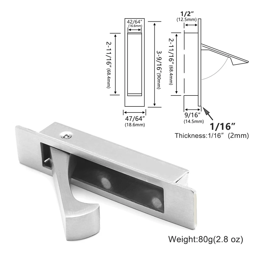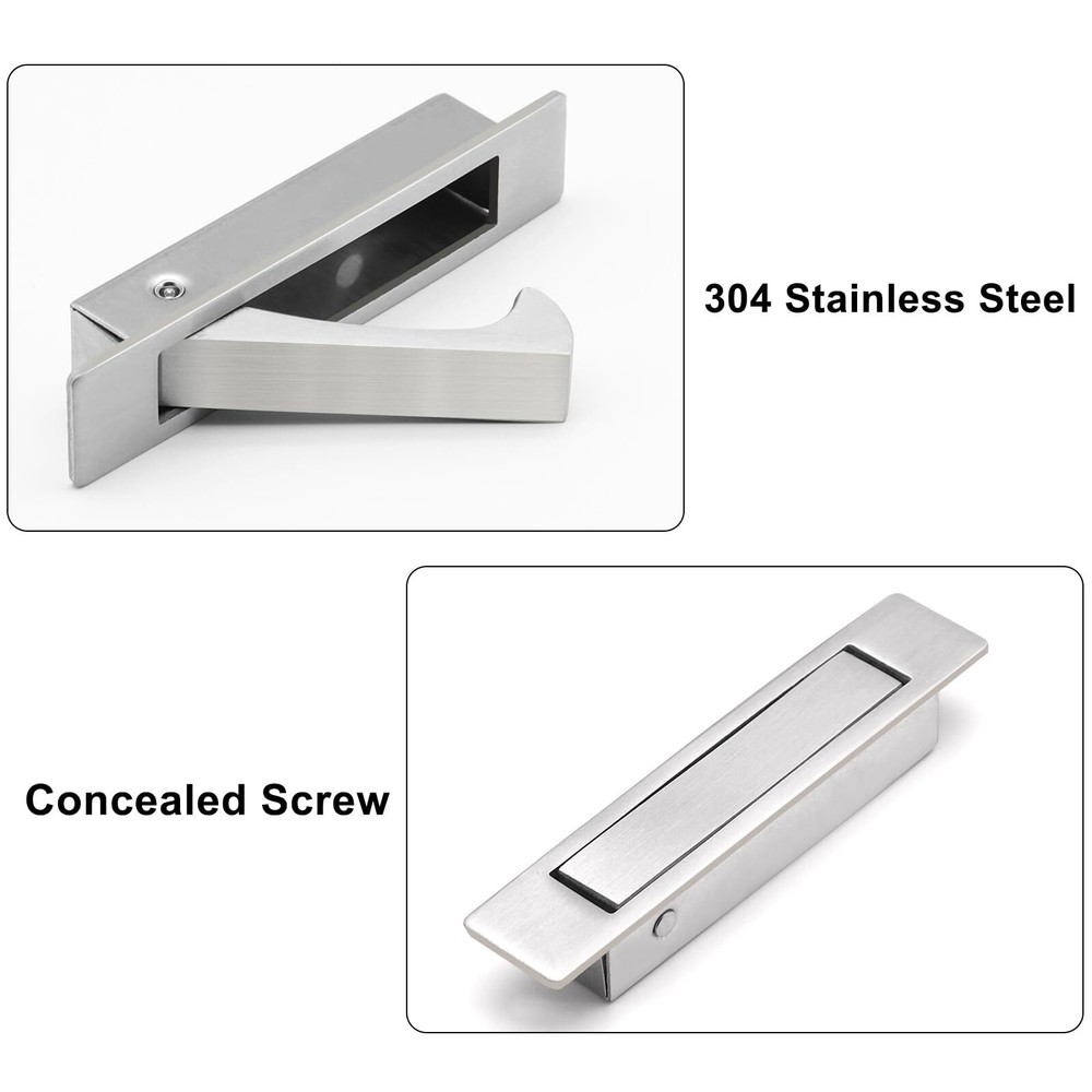 Pocket Door Pull Handle, Edge Pull, Stainless Steel 304, Flush Mount for Sliding Door, 2 Pack, Silver 304 Stainless Steel Material: Solid piece with a satin finish, these handles are rust and weather-resistant, making them suitable for outdoor use Beautiful and Low Profile: With a smooth, clean, and elegant design, these pulls add a sophisticated touch Flush: The self-retracting mechanism ensures the lever closes flush with the door panel Hidden Screws: At 11/16 inch width, these pulls allow installation on both narrow and standard doors and cabinets, providing a clean, hidden pull look Solid Piece: Made from solid material, these pulls feature a unique design for maximum strength and durability Pocket Door Pull Handle, Edge Pull, Professional Stainless steel 304, Flush Mount Door Pull for Pocket Sliding Door Shipping We offer FREE shipping on all orders! We ship within Three business days of payment, usually sooner. We use a selection of shipping services such as UPS, FedEx, USPS etc. We only ship to the lower 48 states, no APO/FPO addresses or PO Boxes allowed. Local pickups and combined shipping options are not provided at this time. Return You can return a product for up to 30 days from the date you purchased it. Any product you return must be in the same condition you received it and in the original packaging. Please keep the receipt. Payment We accept payment by any of the following methods: PayPal Please pay as soon as possible after winning an auction, as that will allow us to post your item to you sooner! Feedback Customer satisfaction is very important to us. If you have any problem with your order, please contact us and we will do our best to make you satisfied. Contact Us If you have any queries, please contact us via ebay. We usually respond within 24 hours on weekdays. Please visit our eBay store to check out other items for sale! Thank you for shopping at our store.