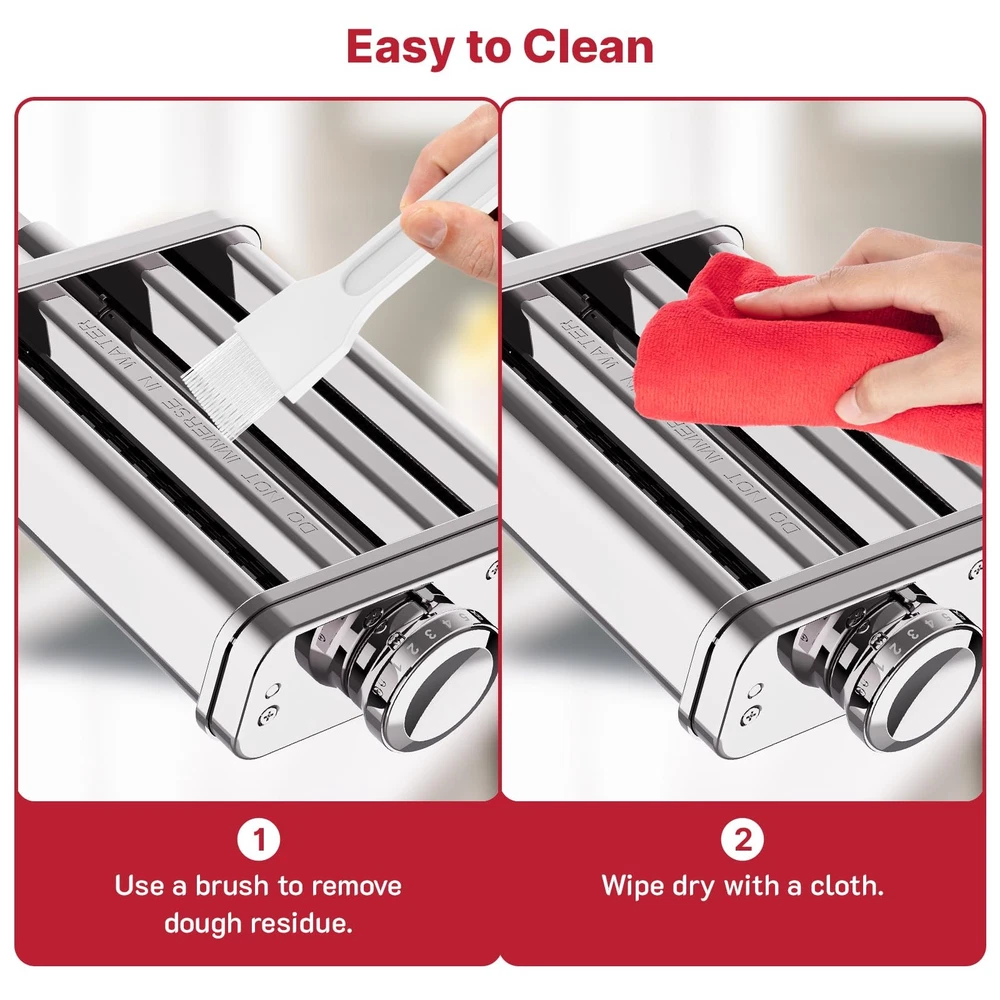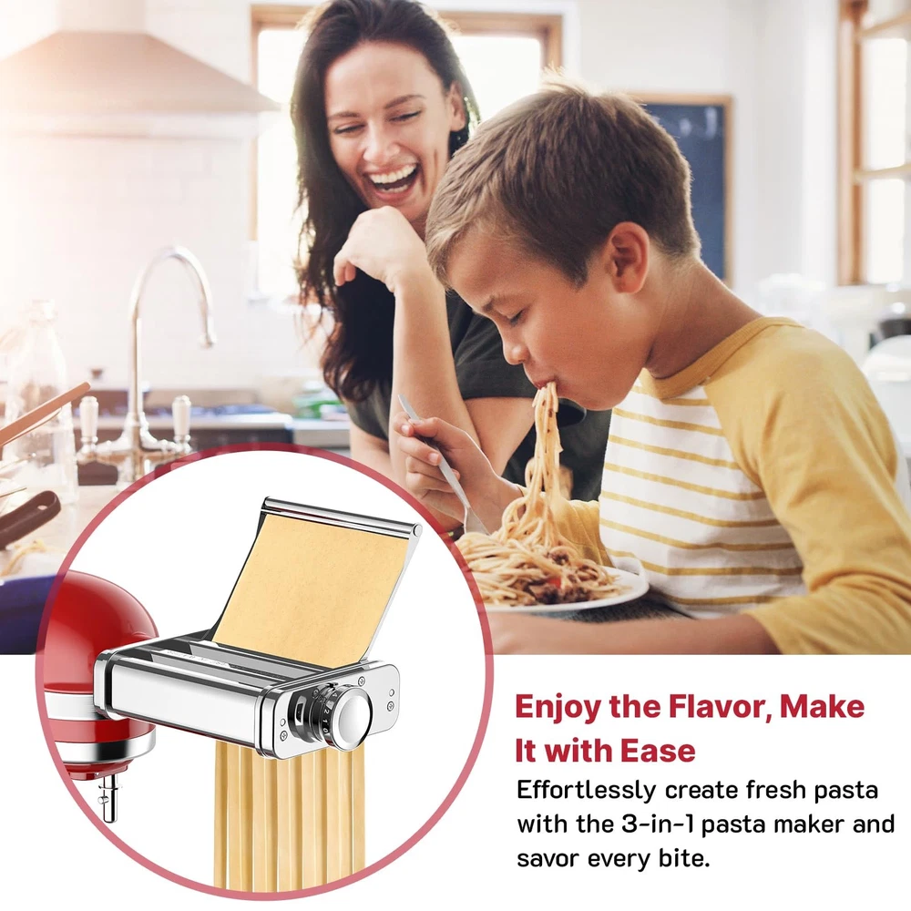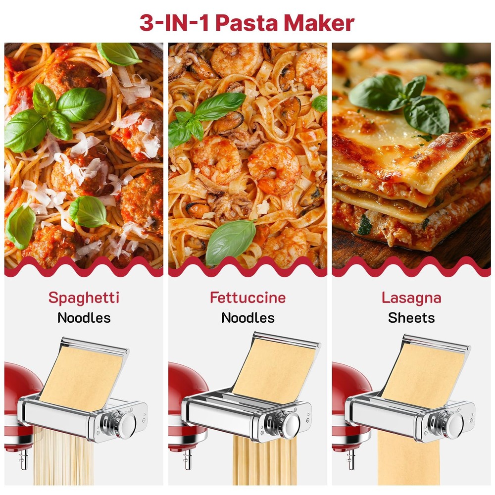 All Stainless Steel Build – Durable and Safe: Crafted entirely from stainless steel, this pasta maker attachment for KitchenAid stand mixers is built to last. It resists deformation and rust, even with frequent use. With direct food contact on a clean, odor-free metal surface, it ensures safe and hygienic pasta-making for your family—perfect for those who value quality kitchen tools Automatic Roller Guide – Effortless Rolling and Cutting: The innovative roller guide design automatically directs the pasta sheet into the cutter after rolling, eliminating the need for manual alignment. This smart design simplifies the process, increases safety, and improves efficiency—ideal for beginners and families looking for an easy start 3-in-1 Design – Multiple Pasta Types with One Installation: Combining a pasta roller, spaghetti cutter, and fettuccine cutter into one compact attachment, it allows you to make multiple pasta styles without switching tools. Install once and easily create spaghetti, fettuccine, and lasagna sheets—saving time and boosting kitchen productivity 8 Thickness Settings – Versatility for Every Recipe: Easily adjust the pasta sheet thickness from ultra-thin to thick using the control knob. Whether you're making dumpling wrappers, wonton skins, lasagna, or tacos, the 8 settings give you the flexibility to handle a wide variety of homemade dishes Reliable Kitchen Helper – Easy to Install and Clean: Quickly connects to the power hub. Smooth operation with no jamming, and easy to clean—simply wipe with a dry brush or damp cloth. A time-saving tool to keep your kitchen clean and your cooking efficient