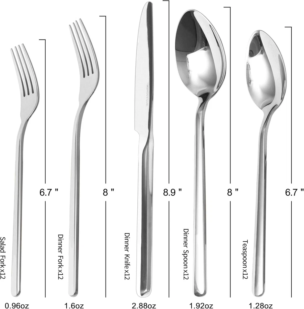Product Care Instructions: Dishwasher Safe Item Weight: 7.02 lb Is Dishwasher Safe: Yes Is Stain Resistant: Yes Recommended Uses For Product: Daily Use Material: Stainless Steel Department: Unisex Baby & Toddler, Adults, Teens, Kids Type: Set Occasion: Thanksgiving Included Components: Flatware Sets Finish: Polished Features: Dishwasher Safe, Rust Resistant UPC: Does not apply Package Dimensions: 9.57 X 6.3 X 3.43 Inches Care Instructions: Dishwasher Safe Set Includes: Serving Set, Dinner Knife, Dinner Fork, Dinner Spoon, Salad Fork, Teaspoon Handle Material: Stainless Steel Color: Silver gtin13: Does not apply Brand: Unbranded Finish Type: Polished Size: 60 Pieces For 12 Style: Modern Number Of Pieces: 60