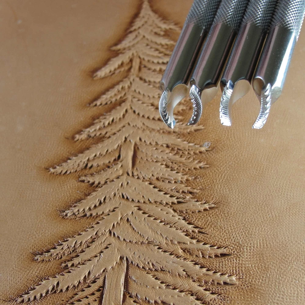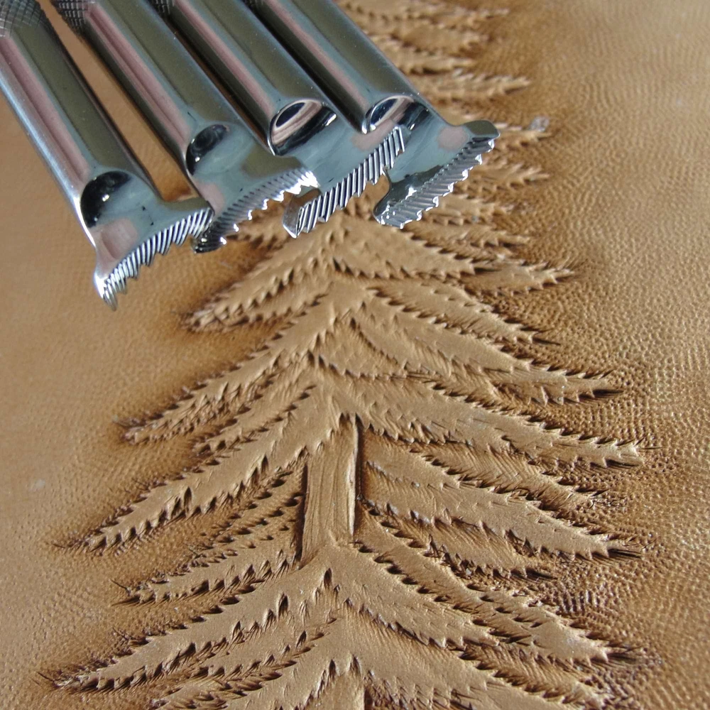 This is a 4-Piece Pine Tree Pictorial Stamp Set. It is a great stamp set that produces great impressions. These tools were designed to match the original F913L, F913R, F914L and F914R stamps. The impressions measure about 3/8" in length and 1/8" in width. If you want to make your work have a look of quality, this would be a great stamp set to add to your collection. Barry King Tools have gained a reputation for making quality tools for the serious leather craftsman. Barry is a master leather stamper, so he knows how a tool should be made and you can see that in each of his tools. Using only stainless steel in the making of these tools, you will see the precision grinding in every impression you make. If you have been wanting to take your leather carving to the next level, investing in stamps made by Barry King is a great first step.