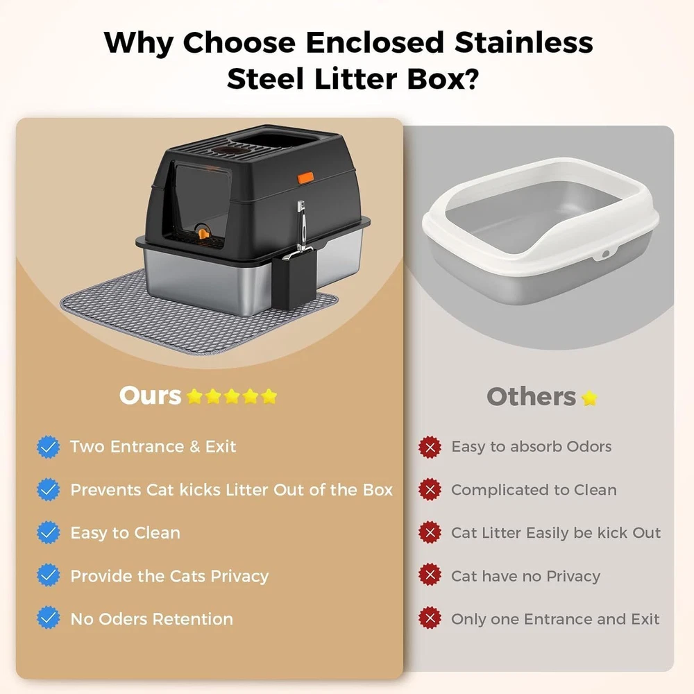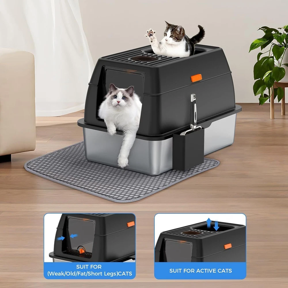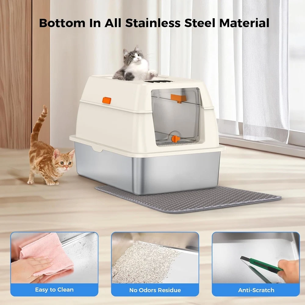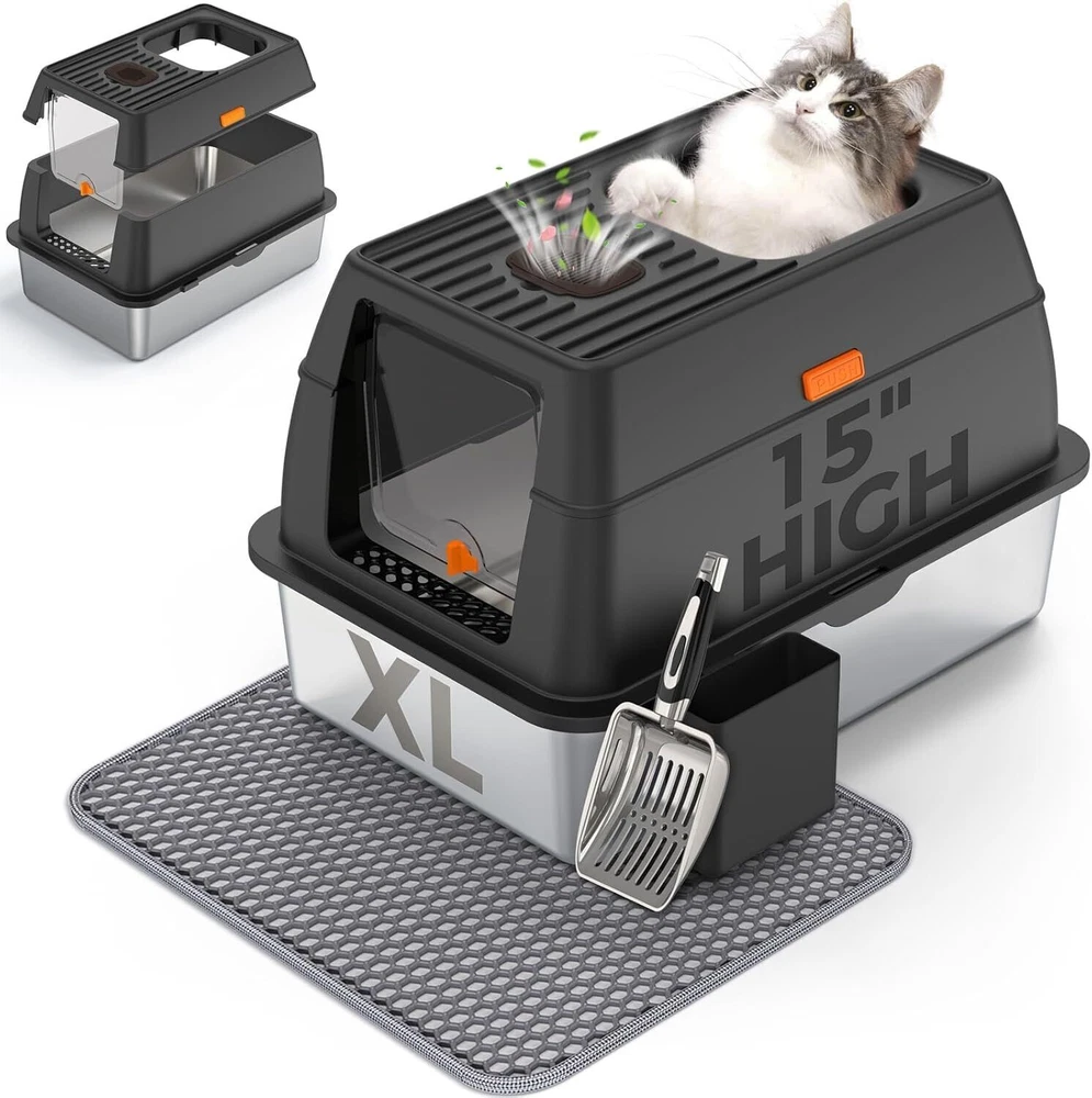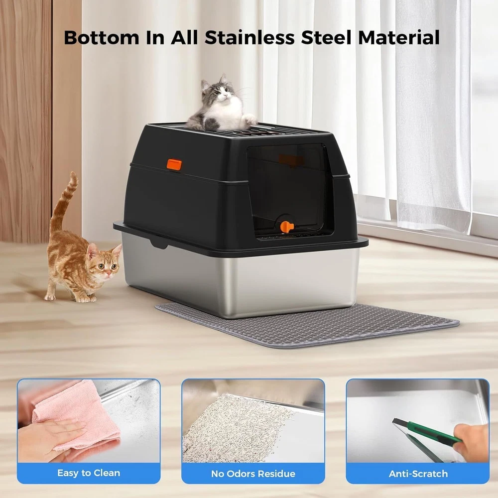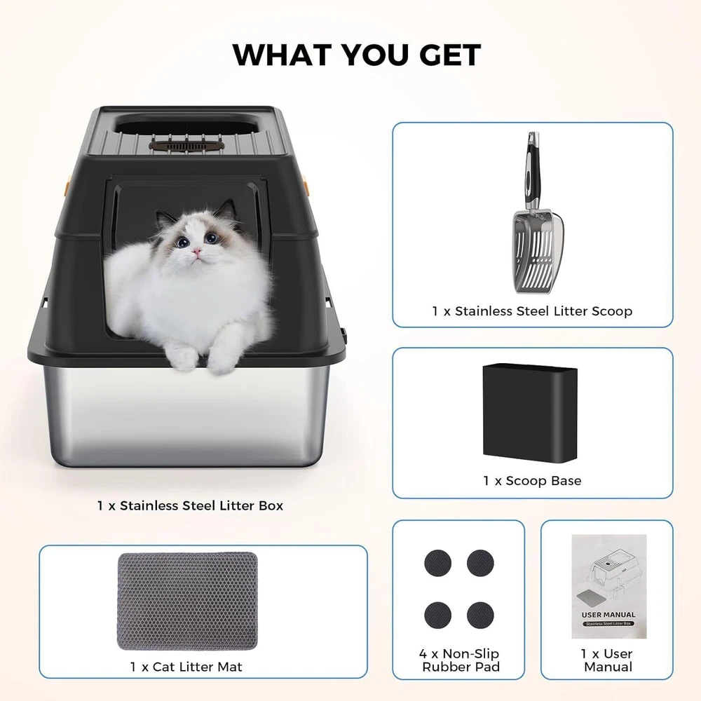 【Save on Expenses】The XL side entry cat litter box is made of sturdy stainless steel, It has a never absorbs odors and stains, not rusting, non-sticky bottom, the cat litter box is strong and durable, easily cleaning, longer life compared to plastic cat litter boxes. Choose the large stainless steel litter box with high wall can save you money on expensive cat litter box replacements, you can use it for many years. 【Perfect for High Peeing Cats】 The covered cat litter box large, and 15" high wall can solve the problems that the cats urine and litter leaks to the floor, cat litter box even though your has a high peeing cats. Keeping the surrounding floor clean and tidy at all times. 【Extra Large Litter Box for Big & Multiples Cats】 Side entry stainless steel cat litter box is 23.62"/60CM long, 15.75"/40CM wide, and 15.35"/39CM high. The extra larger size enclosed litter box is designed for large cats and small cats, providing a spacious and comfortable space for all sizes cats. Side entry stainless steel litter box with lid is also an ideal for multiples cats households. 【Easy Clean】The stainless steel cat litter box larger only needs to be rinsed with water or wiped with a rag. By the way, the extra cat litter scoop makes cleaning easier. 【Superior Quality Enclosed Stainless Steel Litter Box】 Committed to developing and manufacturing superior-quality of cat litter boxes, and also selects superior-quality materials and passes strict quality inspections, aiming to provide all the cat owners with a superiorer quality cat litter box! On Oct 24, 2024 at 03:40:19 PDT, seller added the following information: