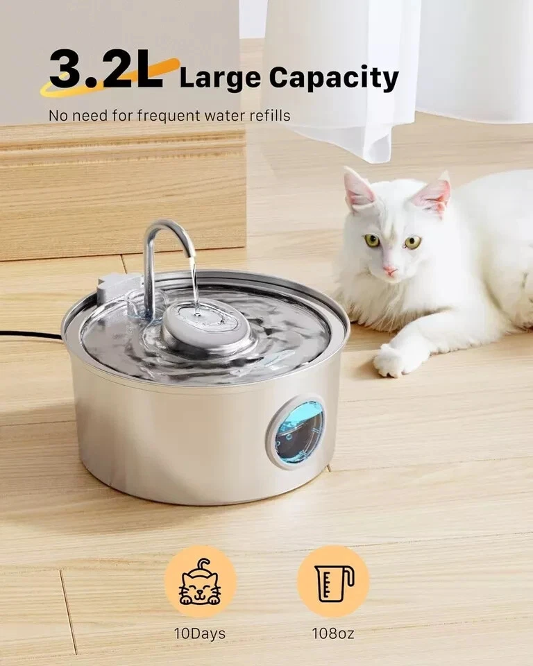 Stainless Steel Cat Water Fountain 3.2L Pet Drinking Fountain Dispenser for Cats 😸No Need for Frequent Water Refills: With a capacity of 3.2L/108oz, this cat water dispenser ensures your pets have access to water throughout the day - making it perfect for busy, pet-loving families. 😸Crisp, Clean and Clear Water All Day: The KOOGMOON dog water fountain is the perfect way to keep your furry friends hydrated with fresh, filtered water whenever they need it. This pet water fountain's multiple filtration system that removes impurities and hair, ensuring your cat and dog have access to clean and healthy water. 😸Make Water Monitoring Easier: This pet water fountain with visualized water level window make Water volume at a glance at any time. Simultaneously, the cat water fountain has a blue light so pets can find the water source themselves when thirsty at night. 😸Quieter Than Ever with: The sound of this water fountain's pump is almost 23dB when running. Sweet dreams not only you but also your pet. And the lower-voltage, more efficient water pump provide a steady flow of fresh water for your furry friend to drink whenever they please. 😸Entice Them to Drink More: With multi-drinking angle and the design of faucets, this cat fountains for drinking is sure to catch your pet's attention and encourage them to drink more water throughout the day. 😸0 Hard-To-Clean Area: Easier to clean and safer than plastic water dispensers, it is made from food grade 304 stainless steel. The split design of the water cooler can be completely washed down. 😸Customer service: 2 years pump warranty, if you have any problem, contact us for replacement. You can buy from our store if you need more parts.