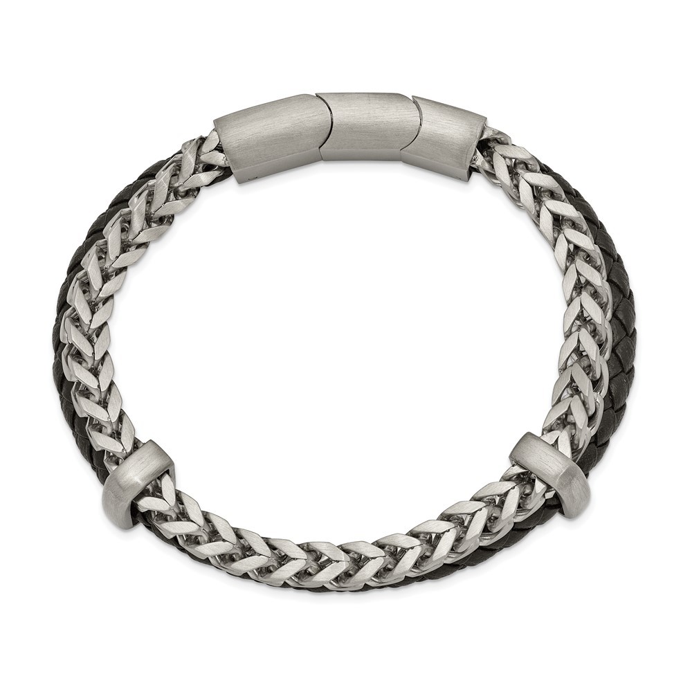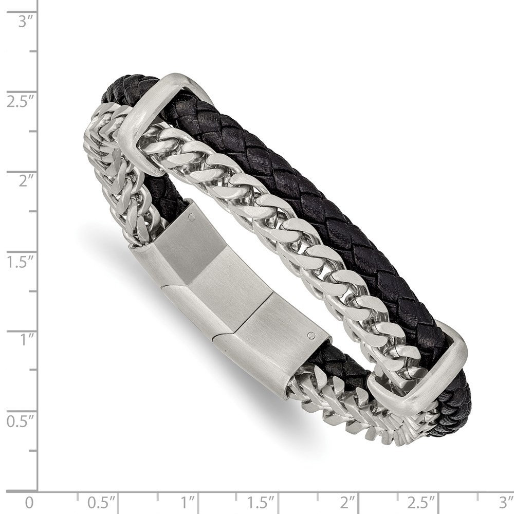 Stainless Steel Polished and Textured Black Braided Leather Bracelet 8.5"