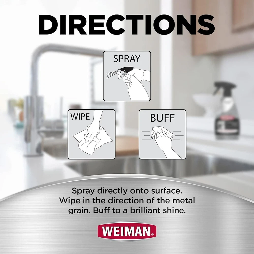 Stainless Steel Cleaner and Polish - Removes Fingerprints, Residue, Water Marks, Grease from Appliances, 2 Pack with Micro Towel #1 SELLING STAINLESS STEEL product: a trusted cleaning product for most of your home's delicate, difficult to care for surfaces. Clean, protect and enjoy your home with the best & most trusted stainless steel cleaning products CLEAN & POLISH: A pH neutral formula quickly cleans, shines & protects any stainless-steel surface. Our product works great for all types and colors of stainless steel NO MORE FINGERPRINTS: Effectively eliminates surface fingerprints, haze, smudges, grease, streaks & residue build up BRILLIANT STREAK-FREE SHINE: Polish leaves a protective barrier that repels dirt and dust. Our wipes are easy to use – simply wipe in the direction of the metal grain, and buff with a soft, dry cloth FOR USE ON: Stainless steel refrigerator, wine fridges, microwave, oven, stove, grill, sink, range-hood & trash cans VALUE BUNDLE: 2 (12 oz) Stainless Steel Cleaners, 1 Reusable Micro Fiber Buffing Towel