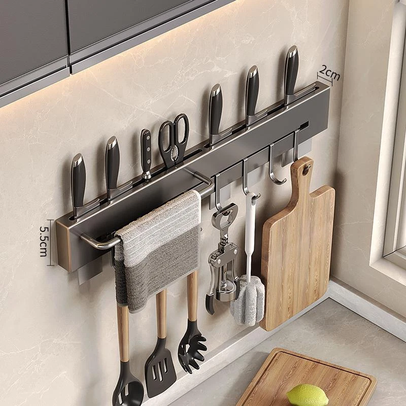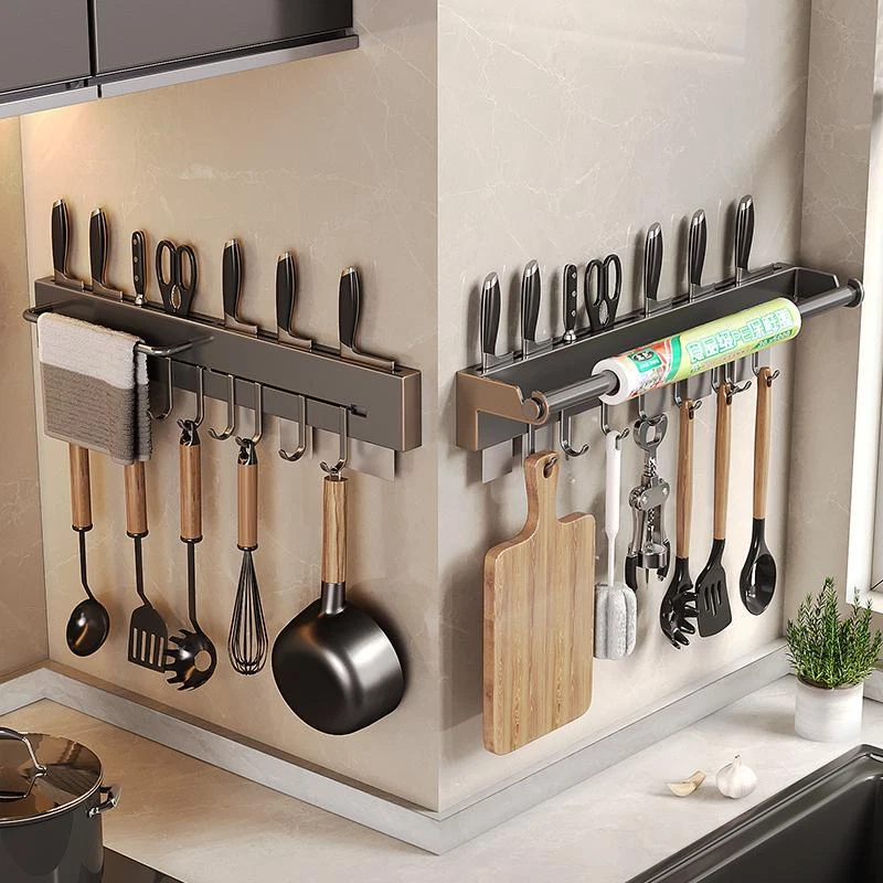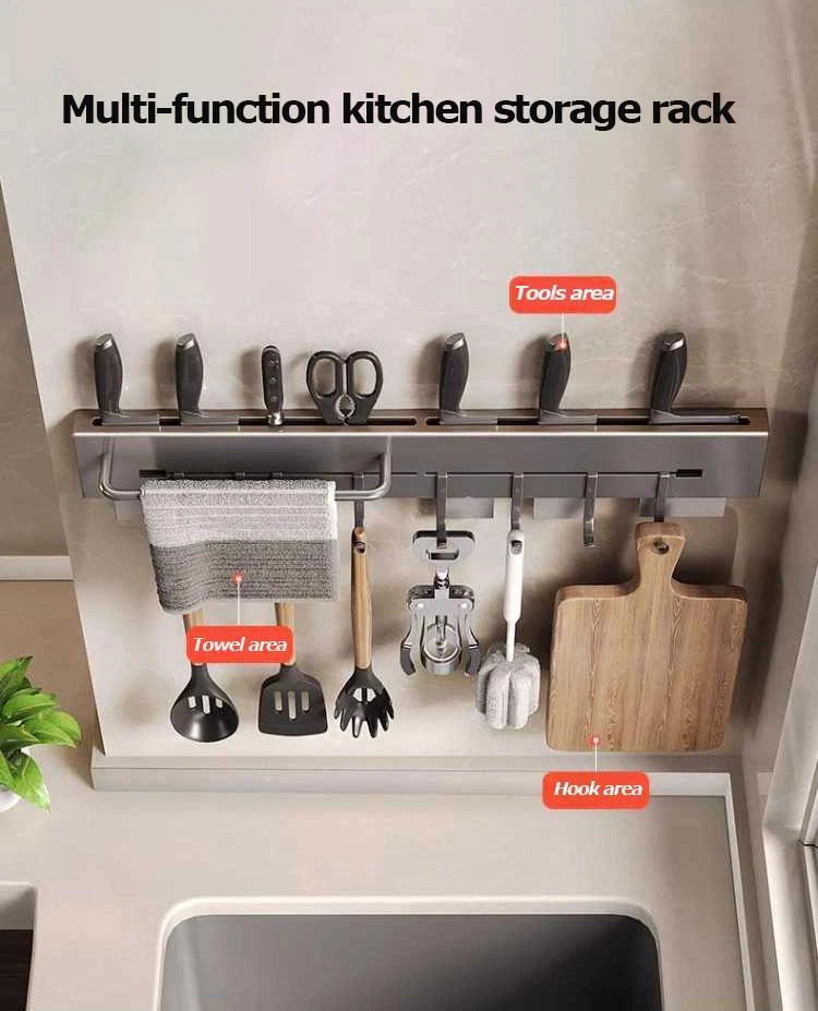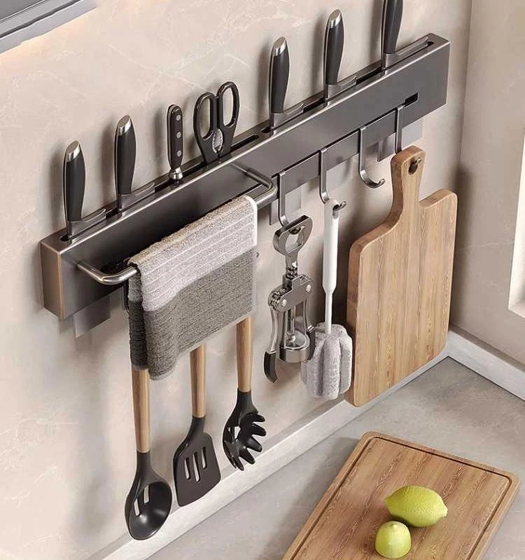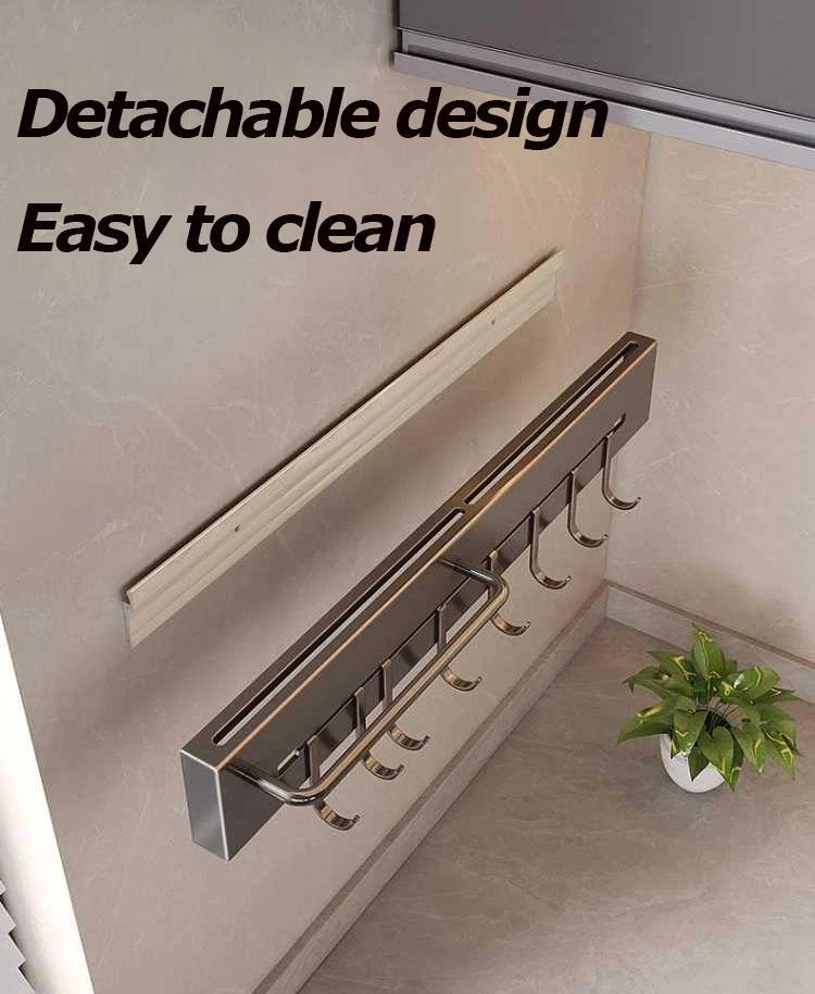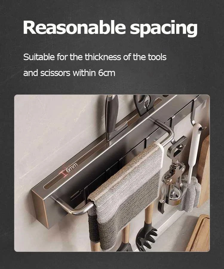 Q:What's material for the hook organizer? It is made of high-quality stainless steel material,waterproof,rust-proof,scratch-resistant. Q:Which wall are suitable for the cleanup hanging? 1.Suitable for ceramic tile wall,marble wall,metal wall,frosted glass wall,waterproof paste wall 2.Not suitable for painted walls,cement wall,plaster wall,wallpaper wall Q:How long can it be used? It can be used for at least 5 years Q:What's the size of this item? 30cm,40cm,50cm Q: How to mount the spoon holder? Screw punching Q:What are the advantages of the product? 1.Quality Control:Quality is not for advertising! It is a mirror to reflect both of main functions and using lifetime in each item. The products will be tested before leaving the factory.We believe the Quality, and deliver the same. 2.Competitive Price: We have our own factory,consumers can reach products without through middlemen. 3.Logistics advantages:Tight supply dates, continues supply 365 days a year Packing list: 1* kitchen rack +1package*punch accessories Matters need attention: Due to different methods of measuring tools,there may be some errors in product dimensions.Please refer to the actual product. Spoon Holder,Cleanup Hanging,Knife Stand,Kitchen Storage Supplies,Hook Organizer,Kitchen Novel Kitchen Accessories