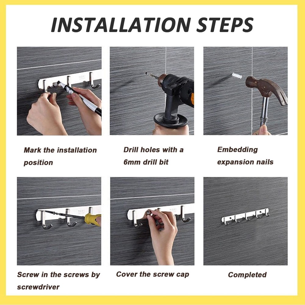 Dimension: 3 hooks: 21*4.8cm; 4 hooks: 29*4.8cm; 5 hooks: 37*4.8cm; 6 hooks: 45*4.8cm. Punching installation will screws accessories for the tile, marble, glass, metal, solid wood type walls. Size: 3 hooks: 21*4.8cm; 4 hooks: 29*4.8cm; 5 hooks: 37*4.8cm; 6 hooks: 45*4.8cm. The distance between two hooks is 8cm, the length of the bottom plate is 3cm, the thickness of the round hook is 7mm, the thickness of the flat hook is 7mm, and the thickness of the hook bottom plate is 1.8mm. Easy to load 11 kg/24 lbs. Exquisite polishing makes the rack bright as a mirror, and it is easy to clean. The back of the hook is welded to make it secure and not easy to fall. Thickened material solid hooks for strong bearing capacity. Screws installation: 1. Mark the installation position; 2. Use a 6mm drill bit to drill holes at the marked positions; 3. Drive in the expansion pipe; 4. Align the hole position and screw in the screws; 5. Cover the cap; 6. Completed. Package includes complete accessories and a modern stainless steel wall coat rack. And it comes with 2 screw caps, which cover the screws holes to a neat appearance. Applicable wall types: Tile, marble, glass, metal, solid wood. Applicable to: Indoor space as living room, bathroom, bedroom, kitchen. Can be used to hang: bags, keys, coats, towels, clothes, hats, scarves, belts, wallets, spoons, shovels, rags, etc.