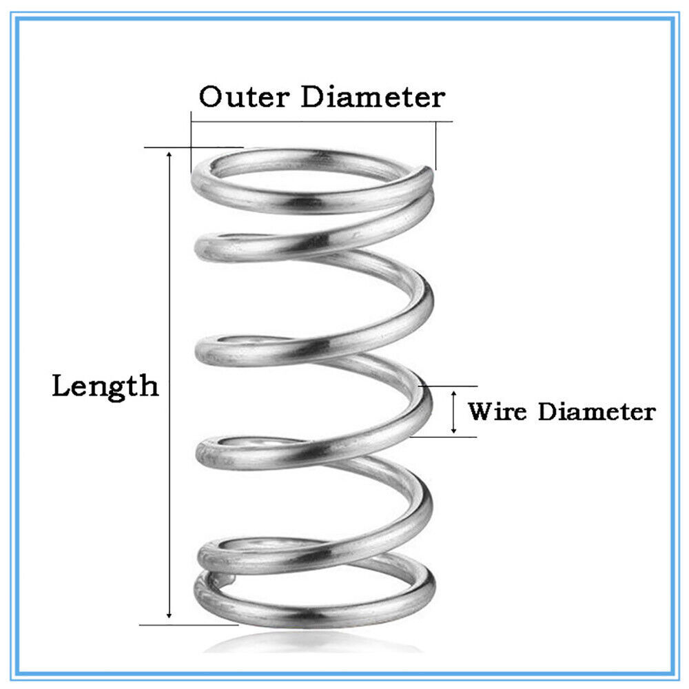 Product description Specifications: 【Features】- Springs occupy an important position in various markets. Stainless steel spiral compression spring, waterproof, rust-proof, durable. 【Application】- Widely used in shipbuilding, computer, electronics, automobile, chemical industry, aerospace, railway, wind power, thermal power, construction machinery, mining machinery, construction machinery, elevators and other fields. Wire diameter:1.4mm Diameter:10mm - 25mm Length:10 - 200mm Material:304 Stainless Steels Colour: Silver